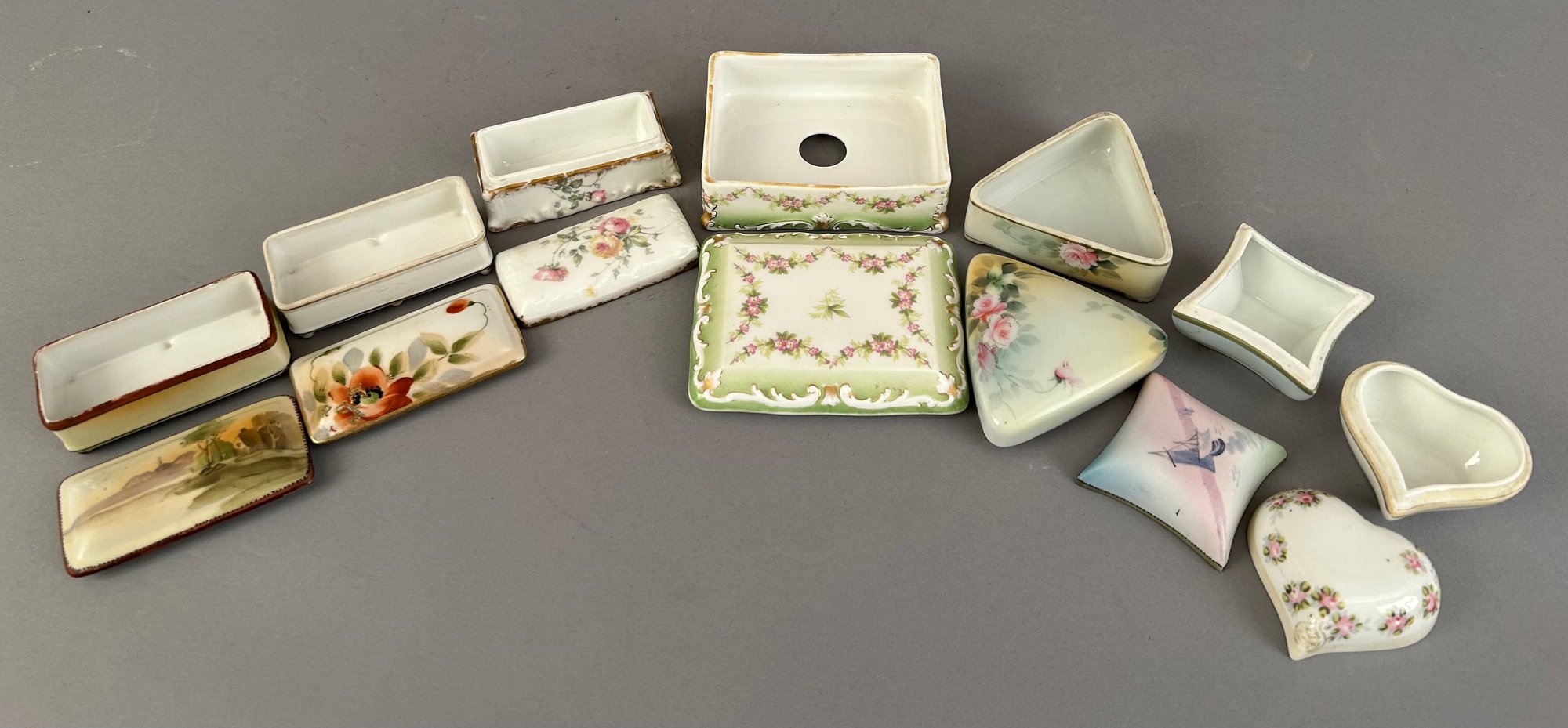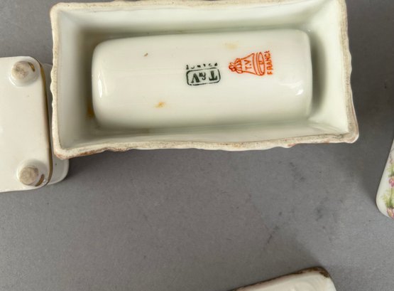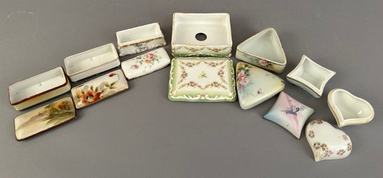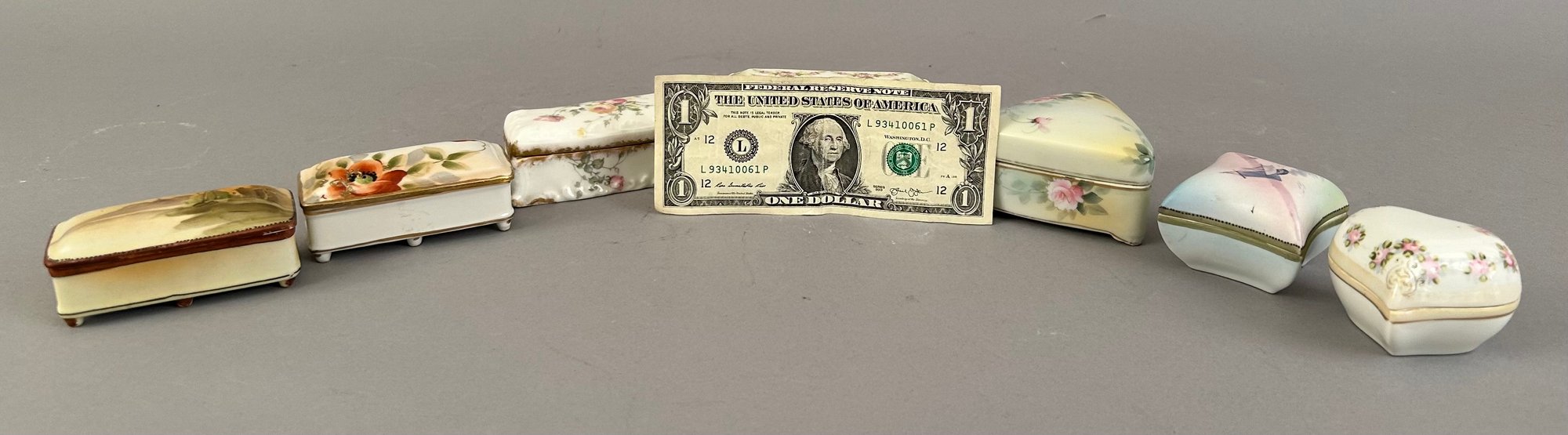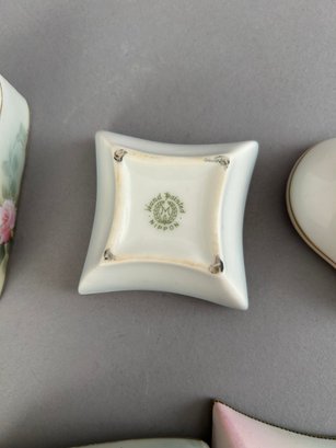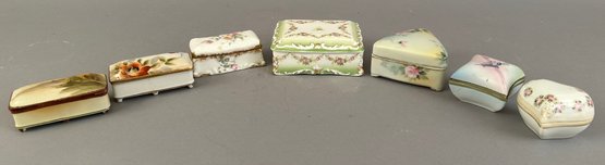 7 assorted porcelain covered trinket dishes, most rectangular. Nippon and Limoges. All marked