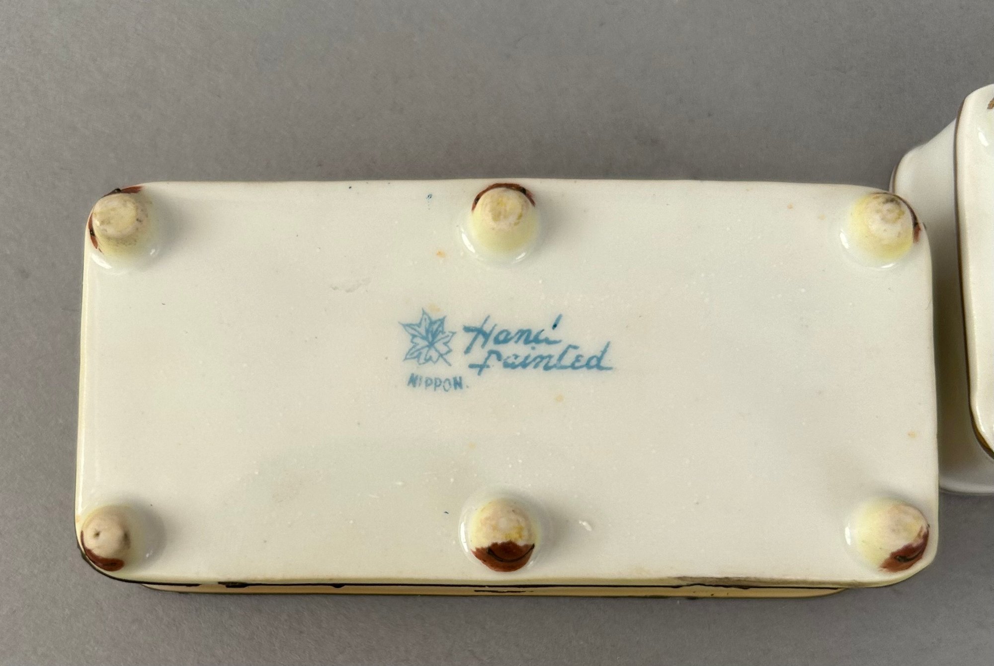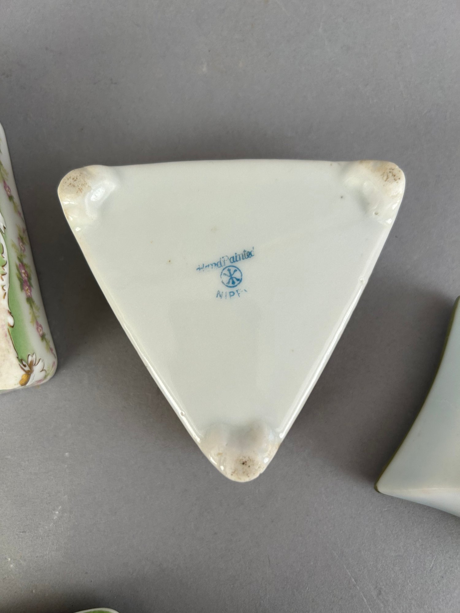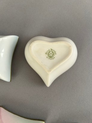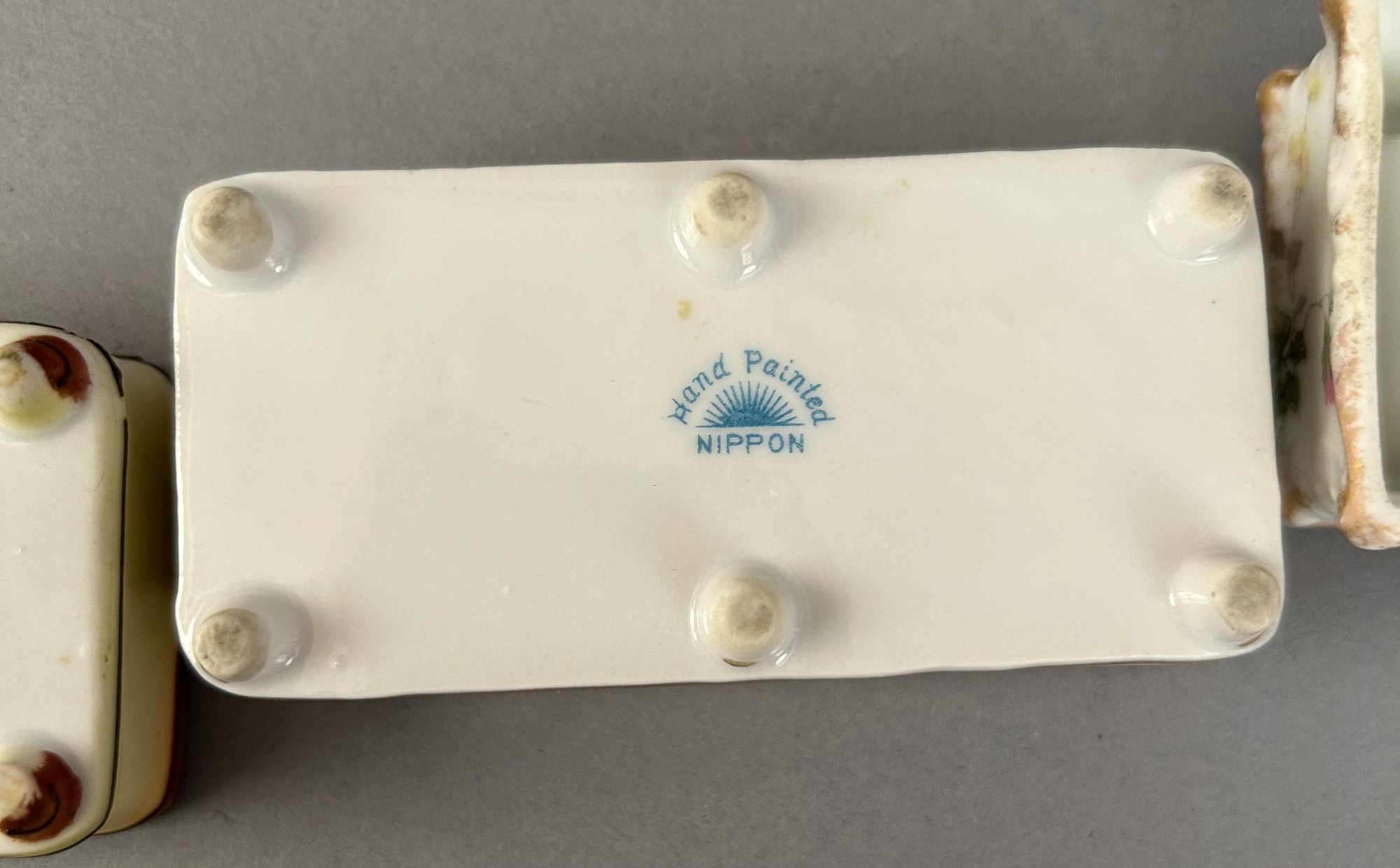 7 assorted porcelain covered trinket dishes, most rectangular. Nippon and Limoges. All marked