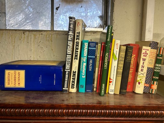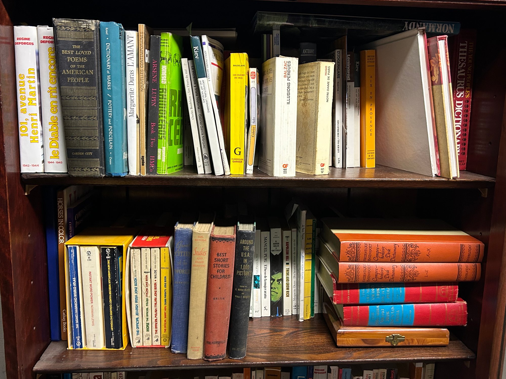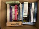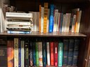 A large lot of books including books on shelf, on top of shelf and in box. Shelf not included.
