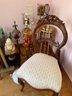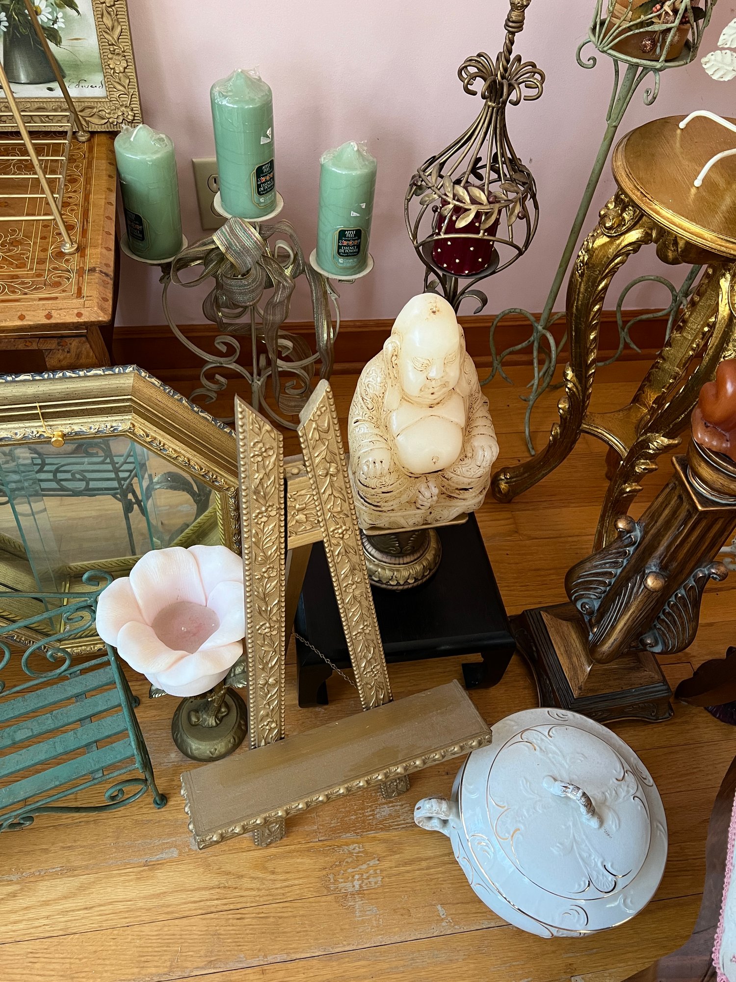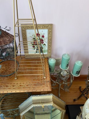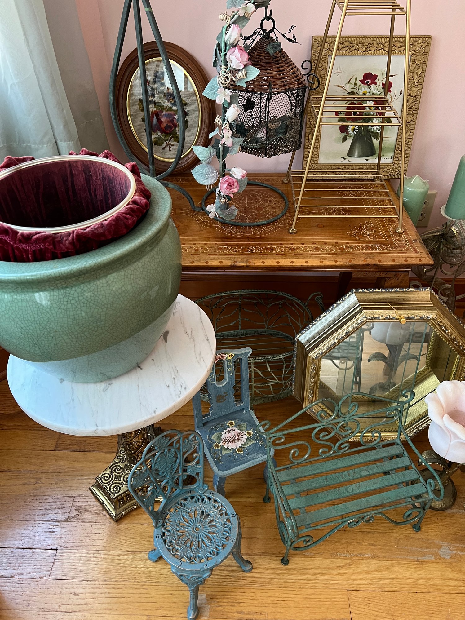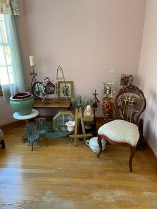A lot of miscellaneous items, including small tables, chair, candles, and candleholders, planters, etc.