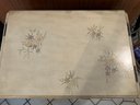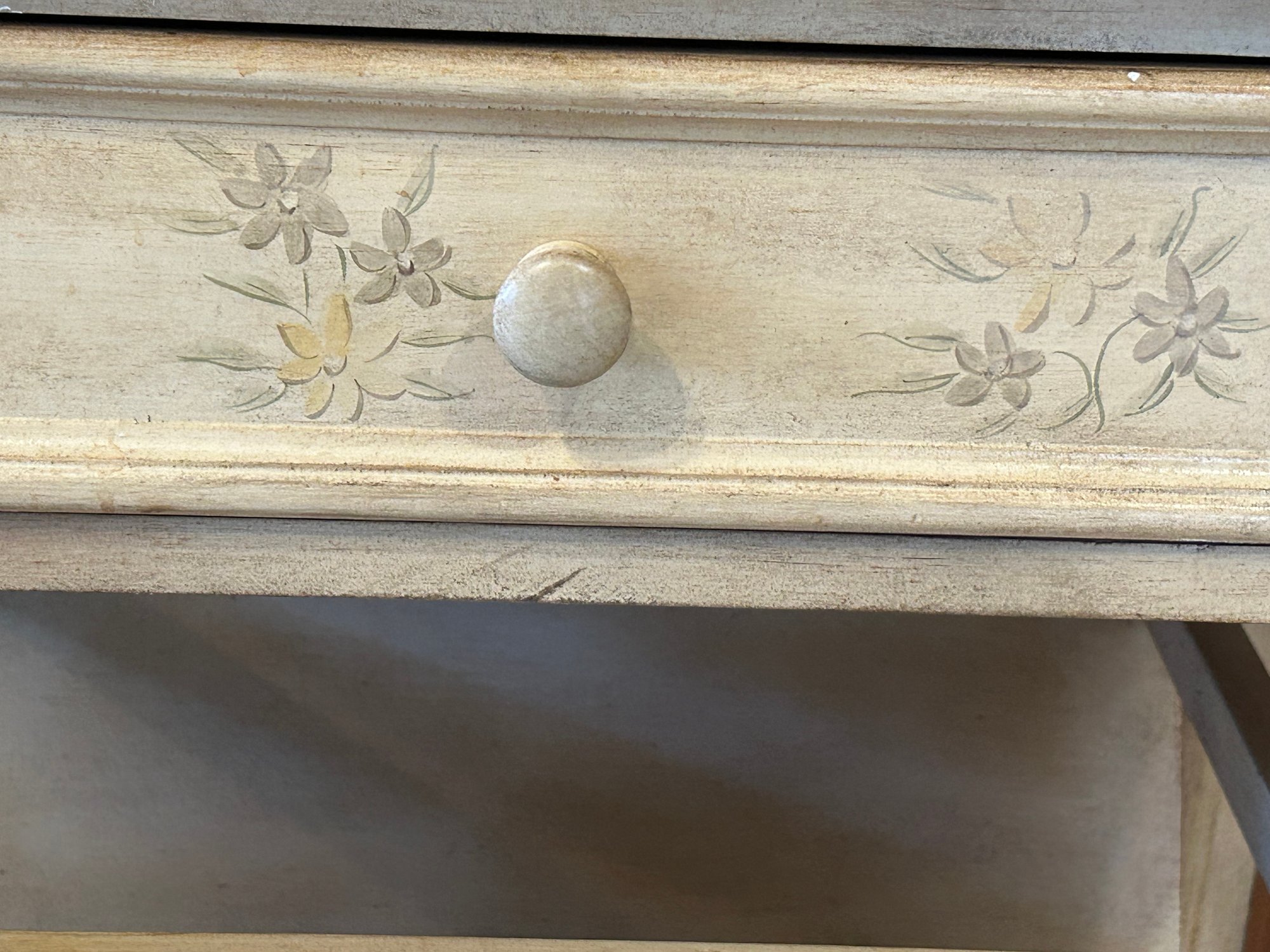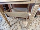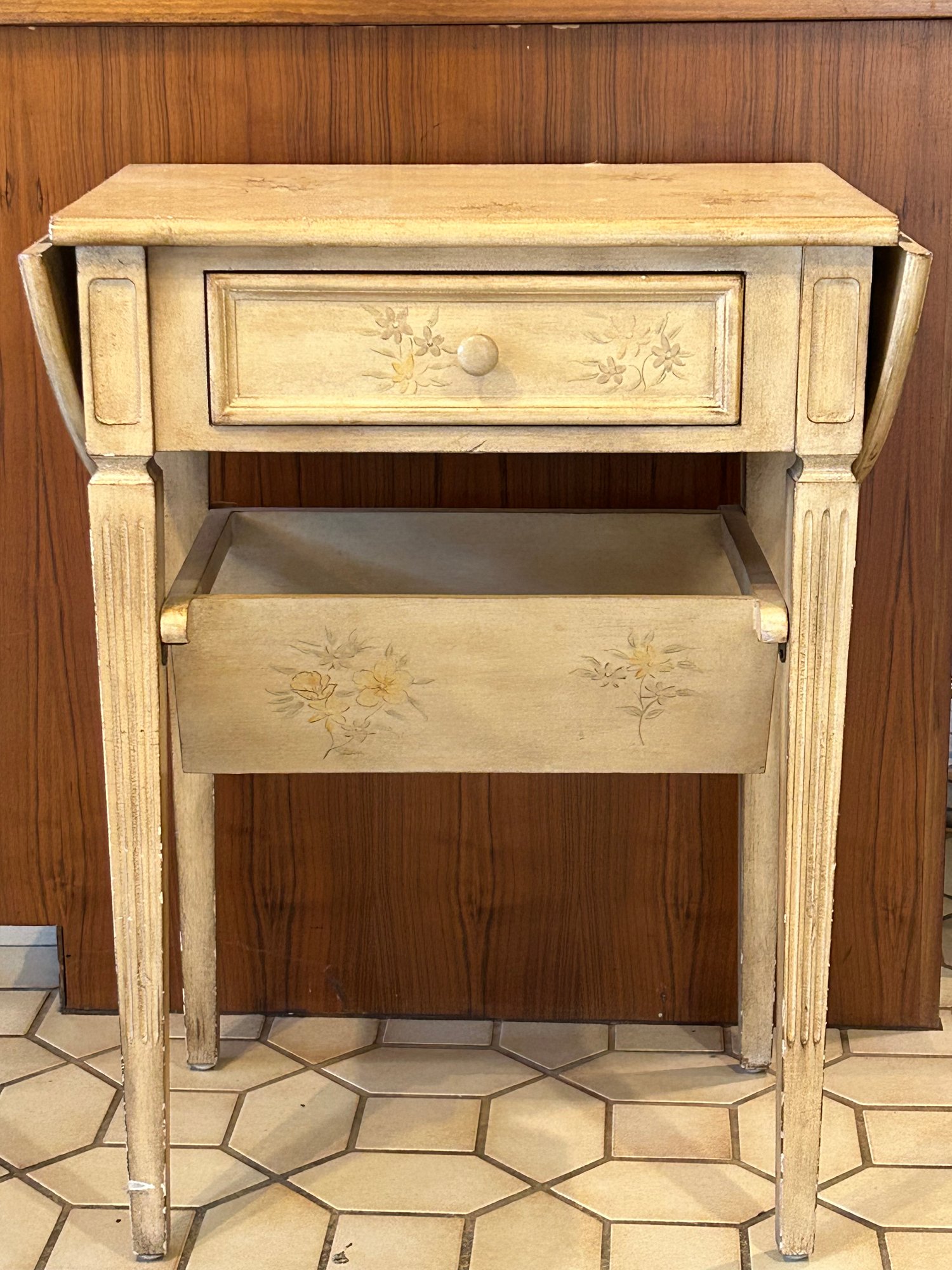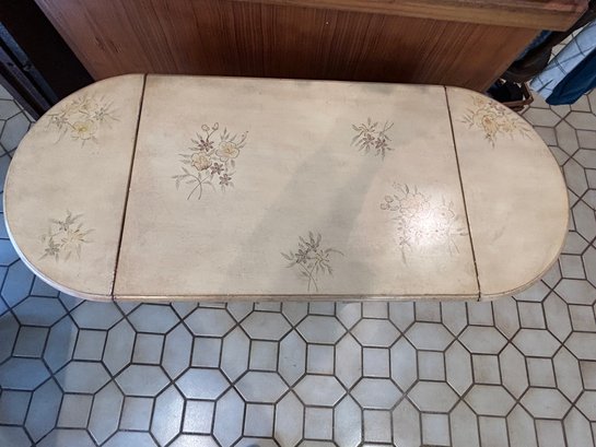 Paint decorated sewing stand with dropped leaves, paint decorated surface, lower bin 24” x 16” x 30 1/2” 38 inches open