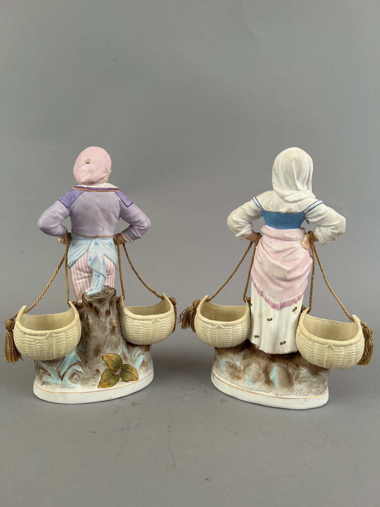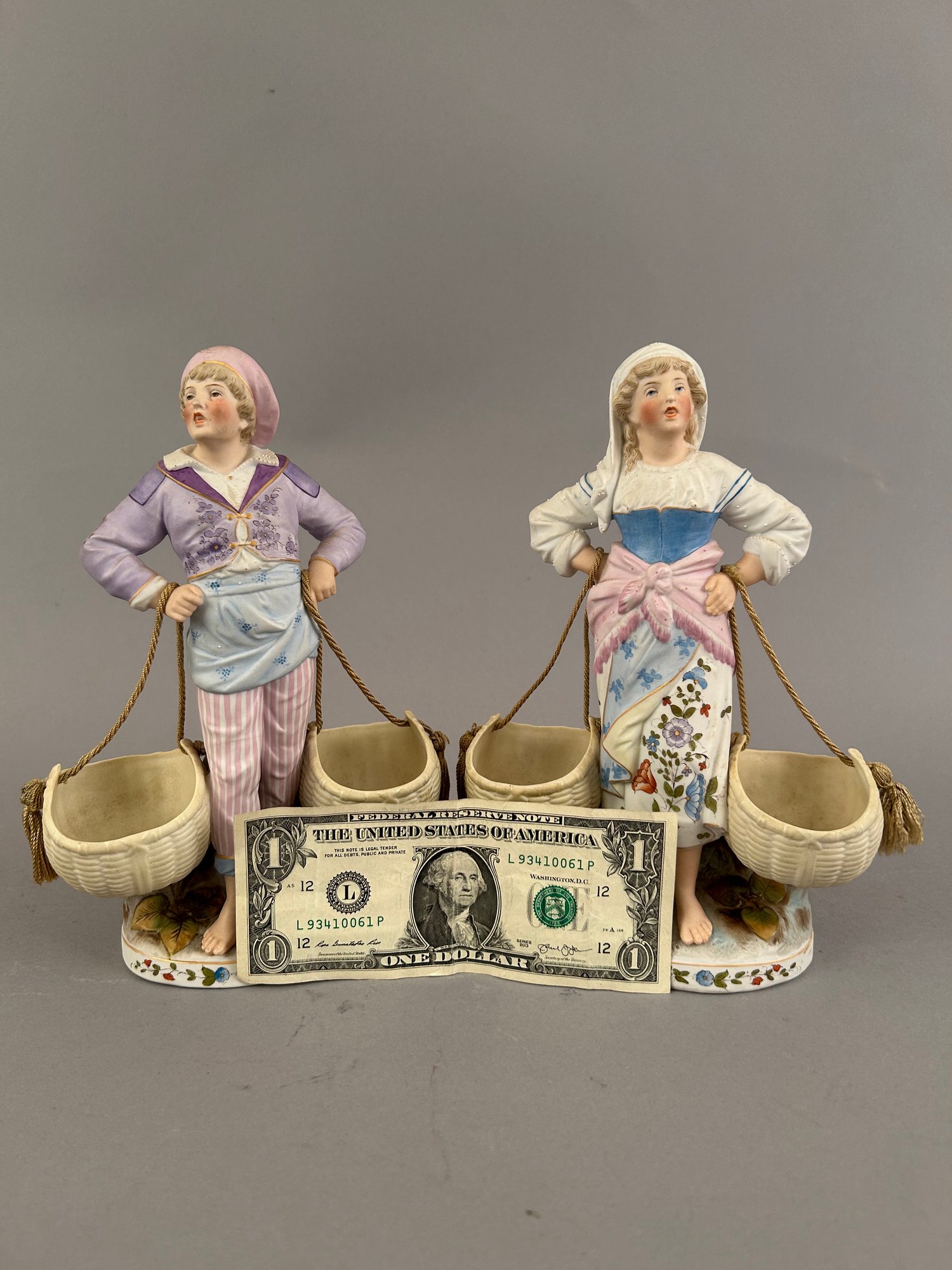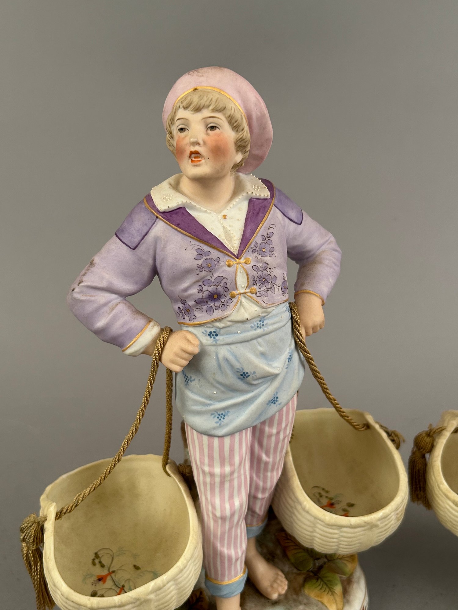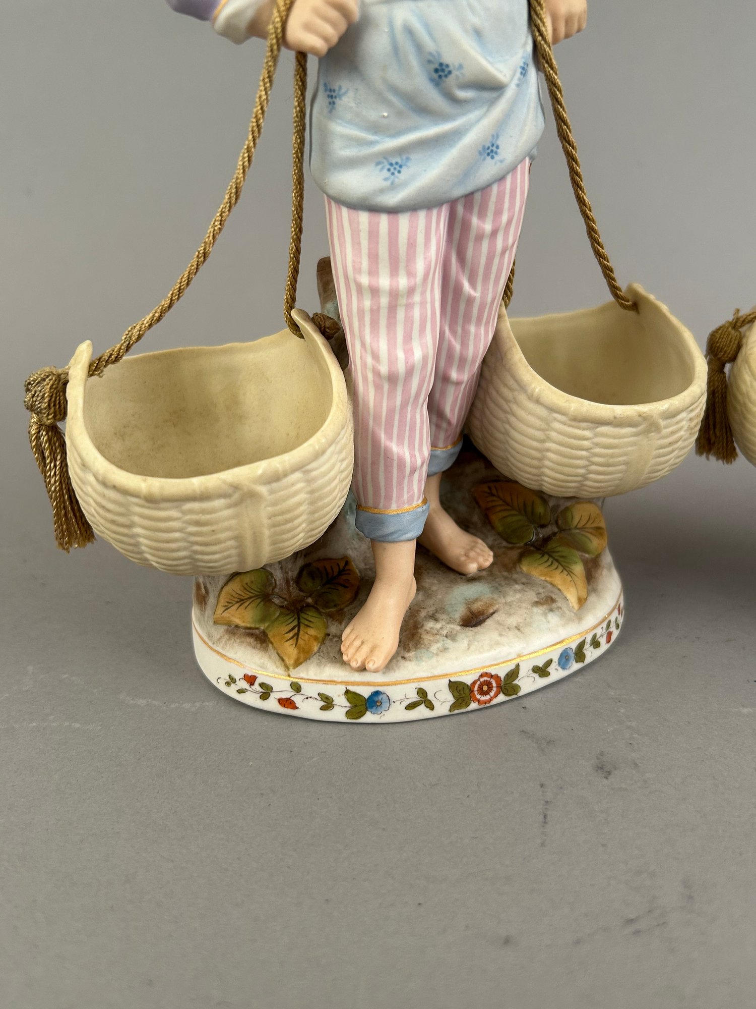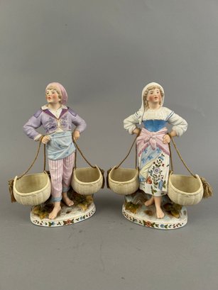 Pair of bisque porcelain table figurines. A boy and a girl each carrying two baskets.