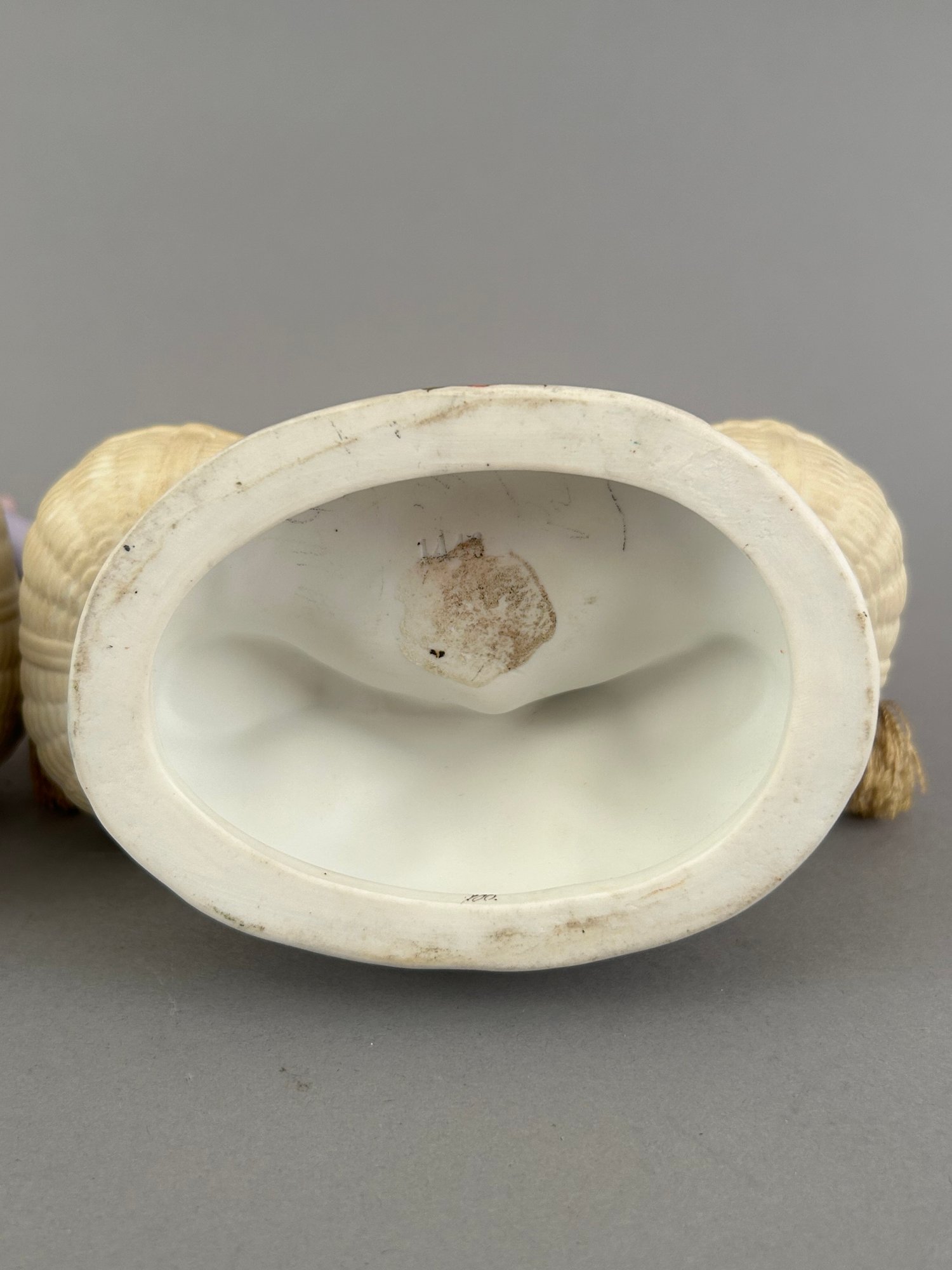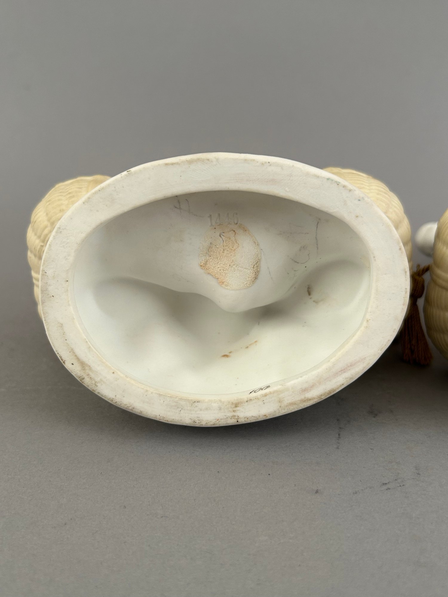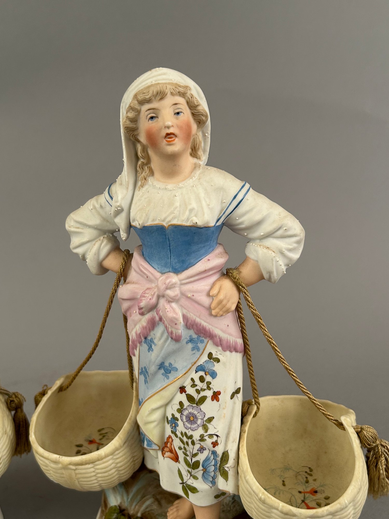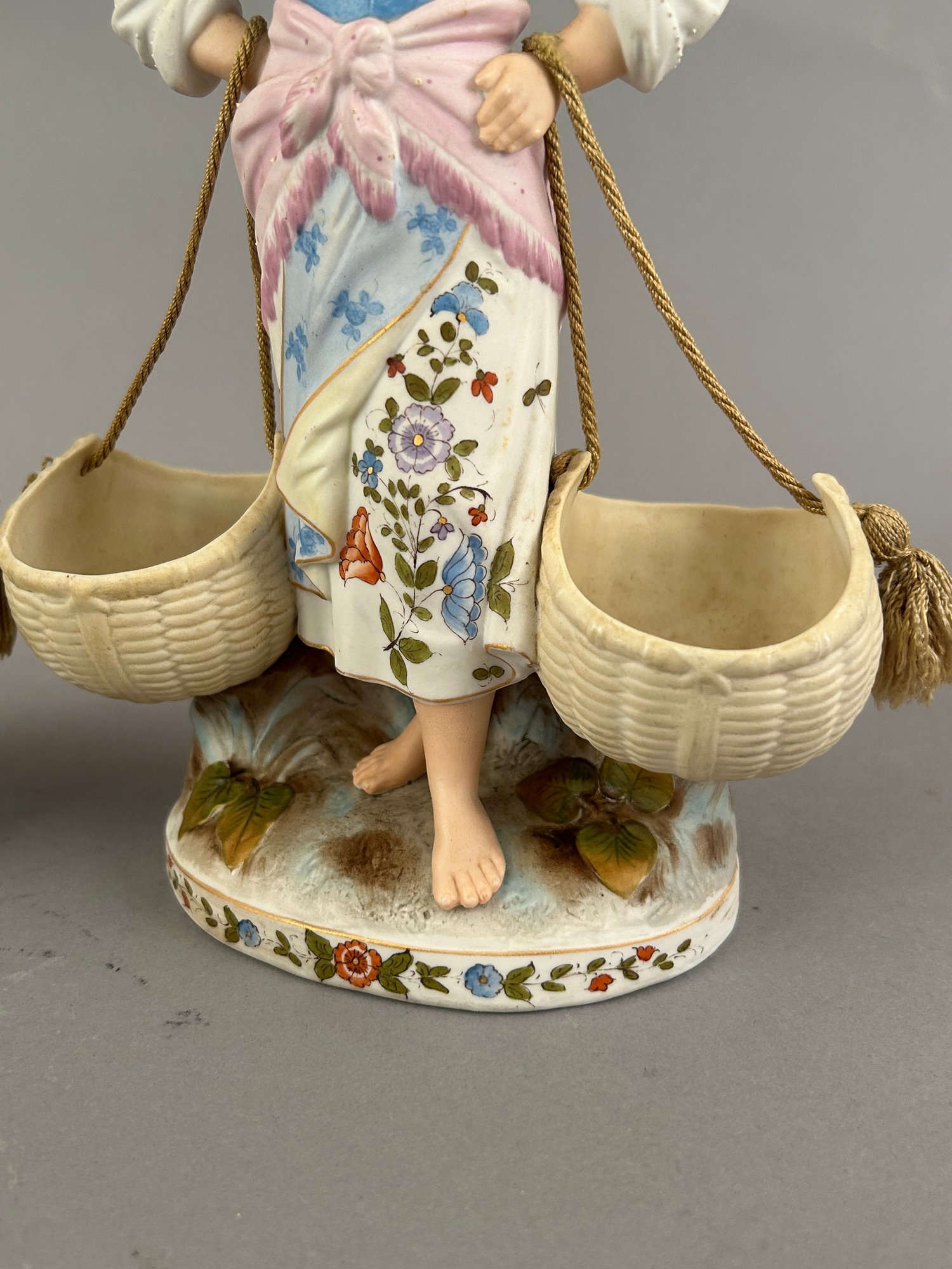 Pair of bisque porcelain table figurines. A boy and a girl each carrying two baskets.