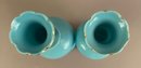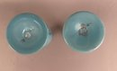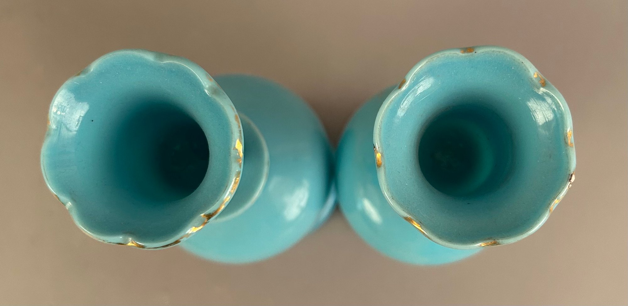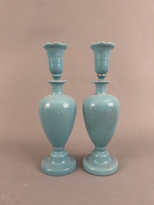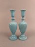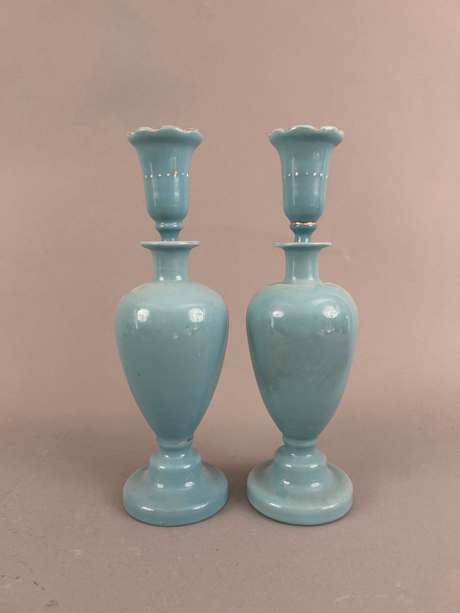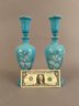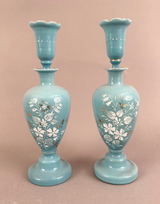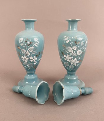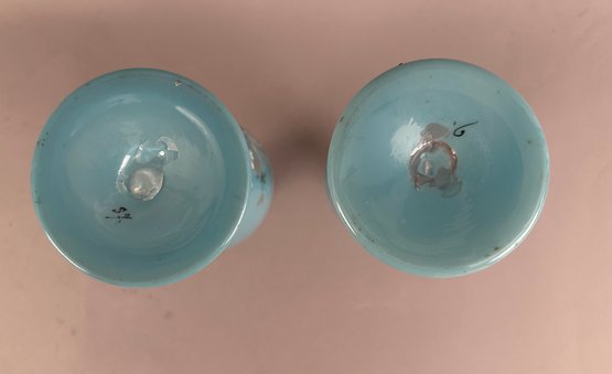 Pair of blue opaline decanters with white enamel flowers. Stoppers are like small glasses or jiggers. Both marked on bottom and have pontil mark.