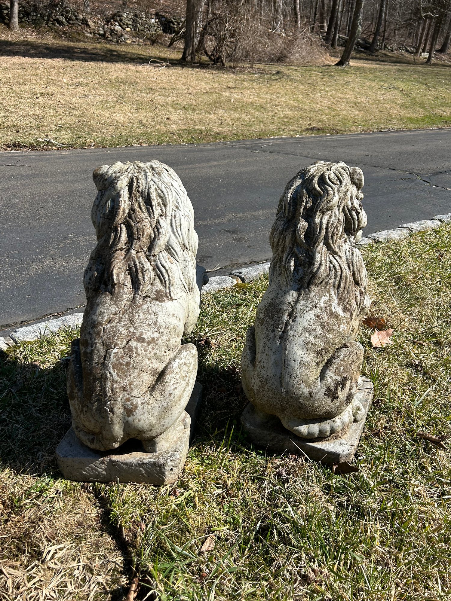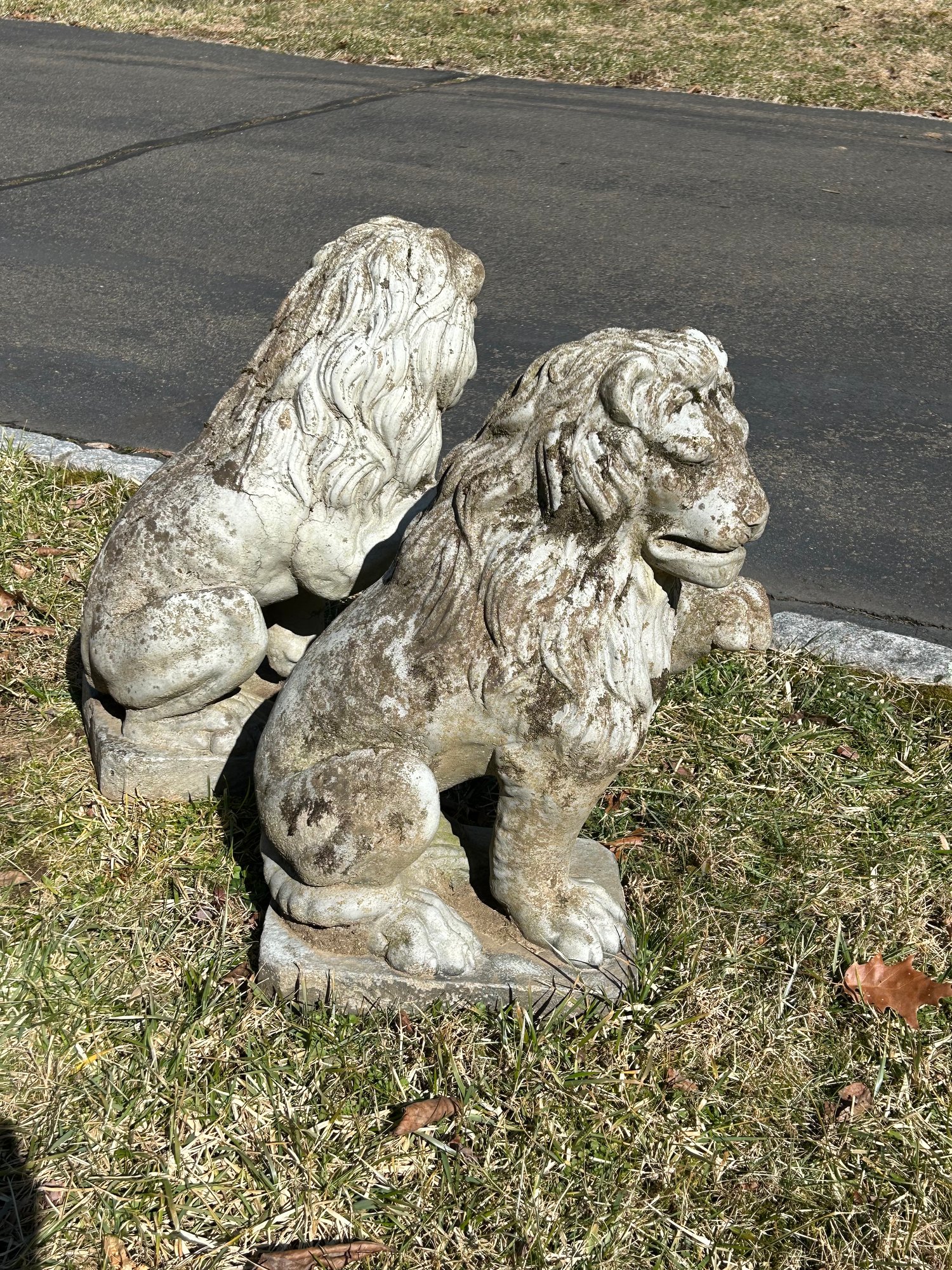 Pair of cast stone lions. Painted. 24 inches tall.