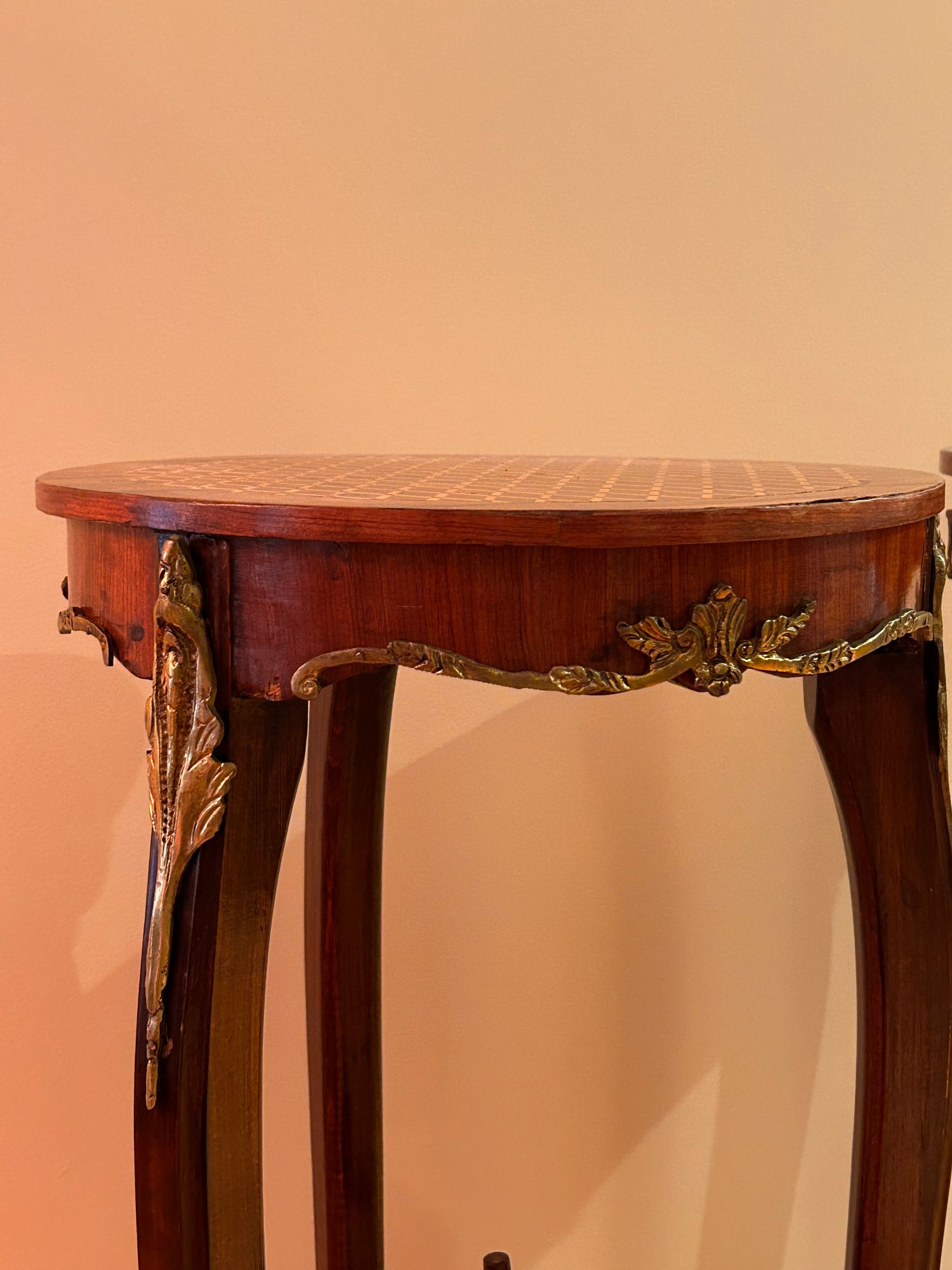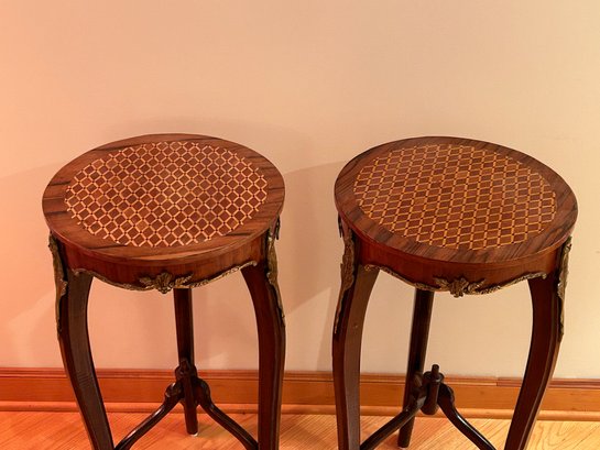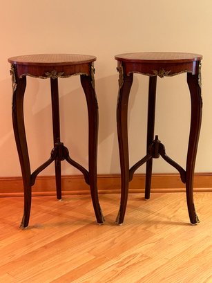 Pair of inlaid occasional tables. Inlet top, brass mounts with Cabriole legs. Rosewood 30x15 inches