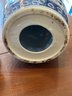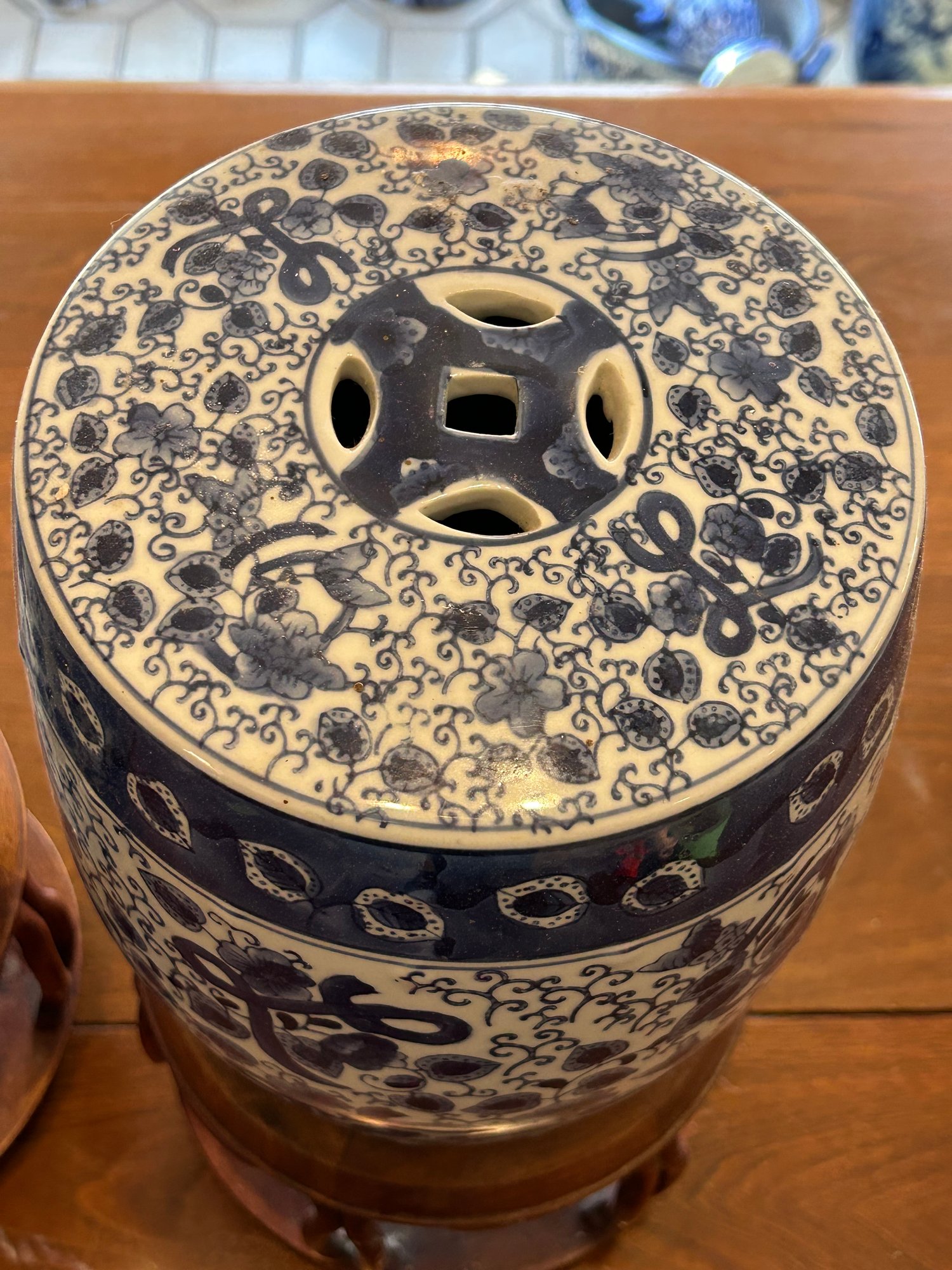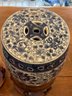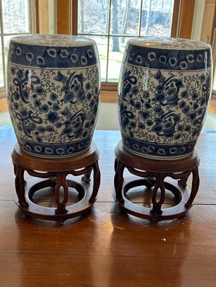 Pair of small barrel shaped garden stools on stand. Chinese style Blue and white porcelain barrels, wooden stools with marble inserts. Overall height 16 inches barrel alone 10 inches.
