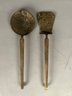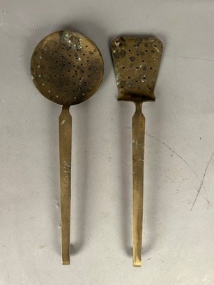 Pair vintage brass cooking utensils, strainer, and spatula with holes
