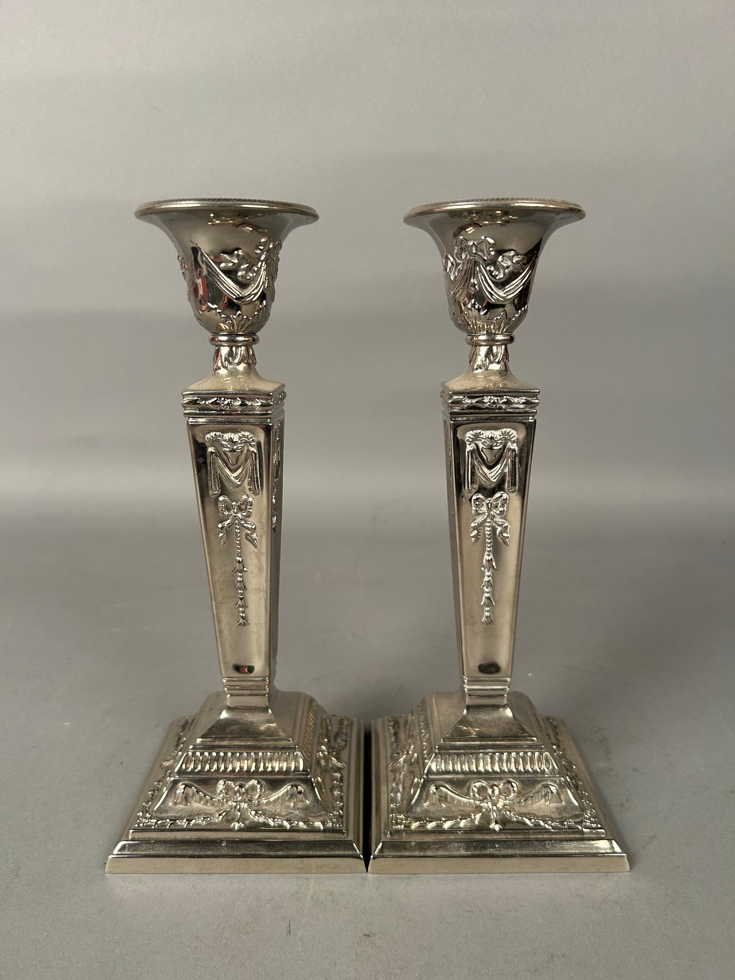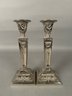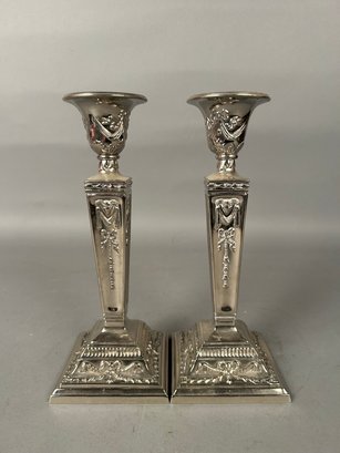 Pair Vintage candlesticks, silver with ornate embossed design.