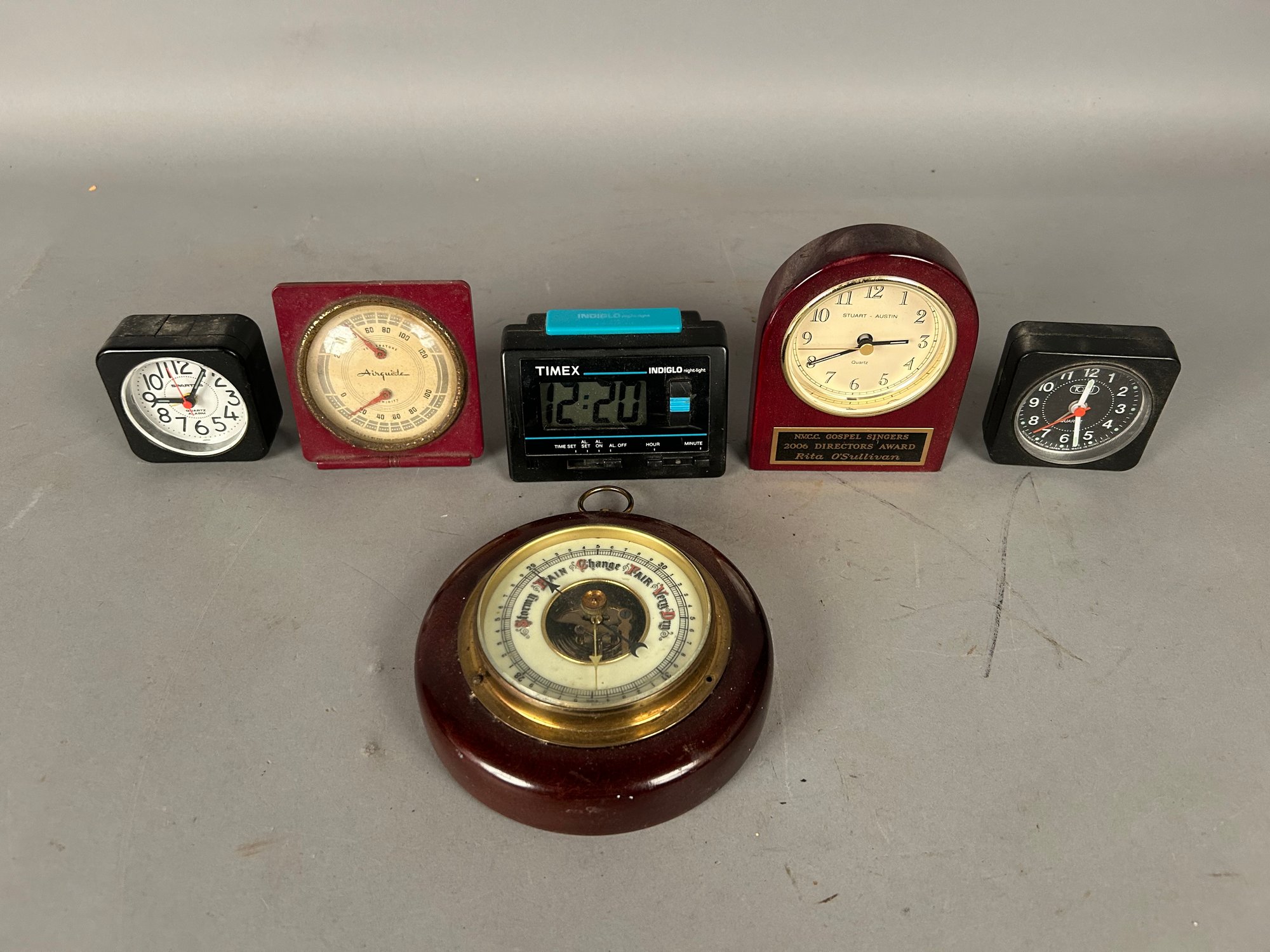 Alarm clock and barometer lot two vintage barometer one air guide. For alarm clocks largest barometer. Largest 5.5"