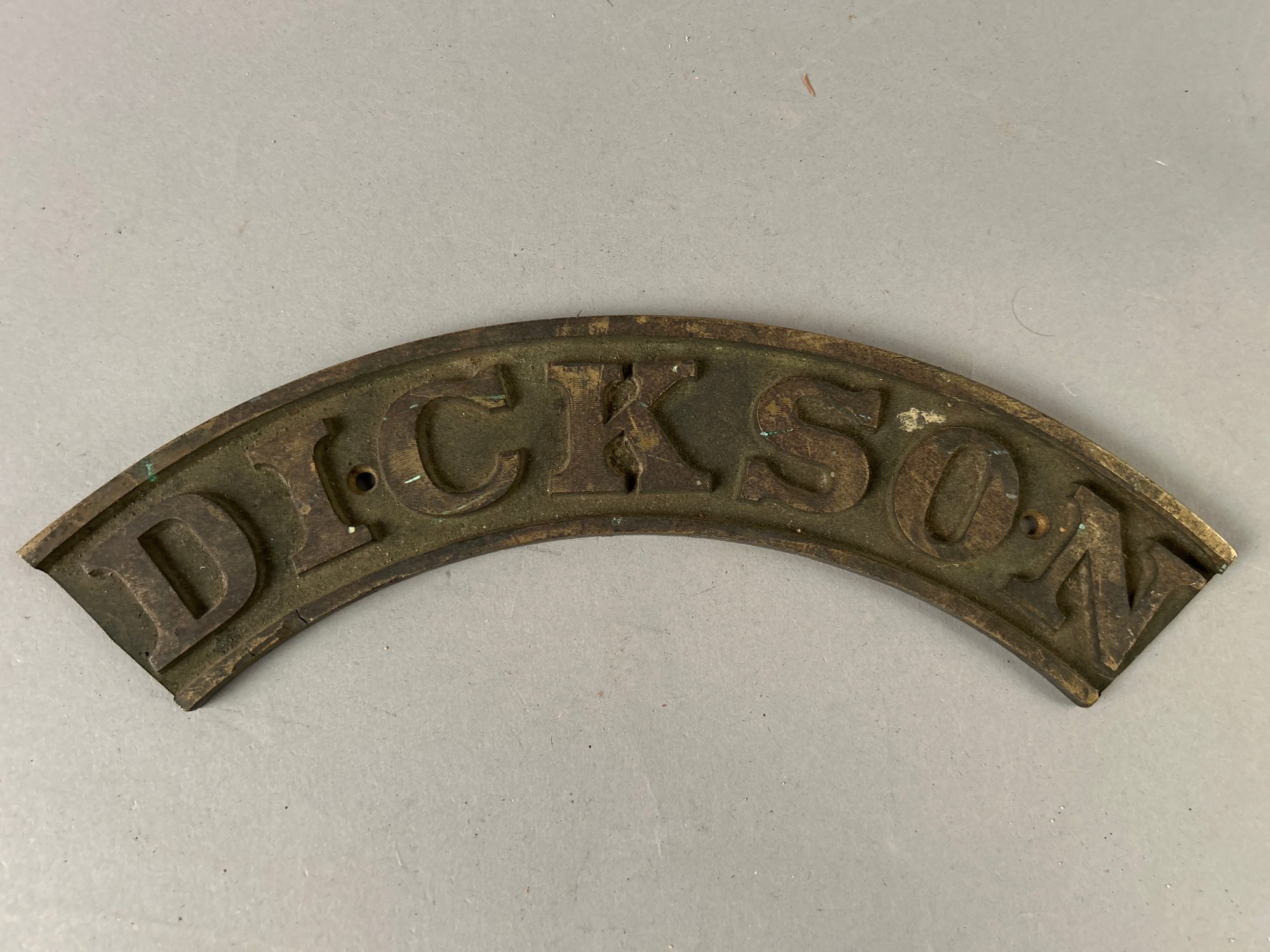 Antique Bronze Nameplate DICKSON. Arched design with raised letters. 12 inches long.