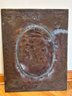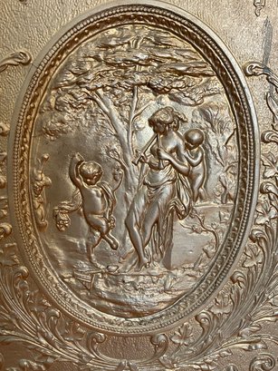 Antique cast iron fire back depicting woman with cherub and child. Playing flute. Painted gold 26“ x 20“.