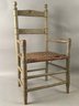 Antique child’s ladder back armchair original painted surface, elephant with mushrooms painted on back slat. Original seat. 15 1/2 x 28 x 13 seat height 12 1/2.