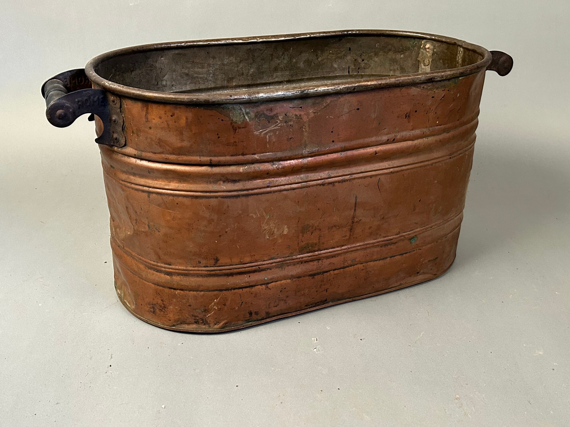 Antique copper two handled boiler/wash tub with tin line interior and wooden handles