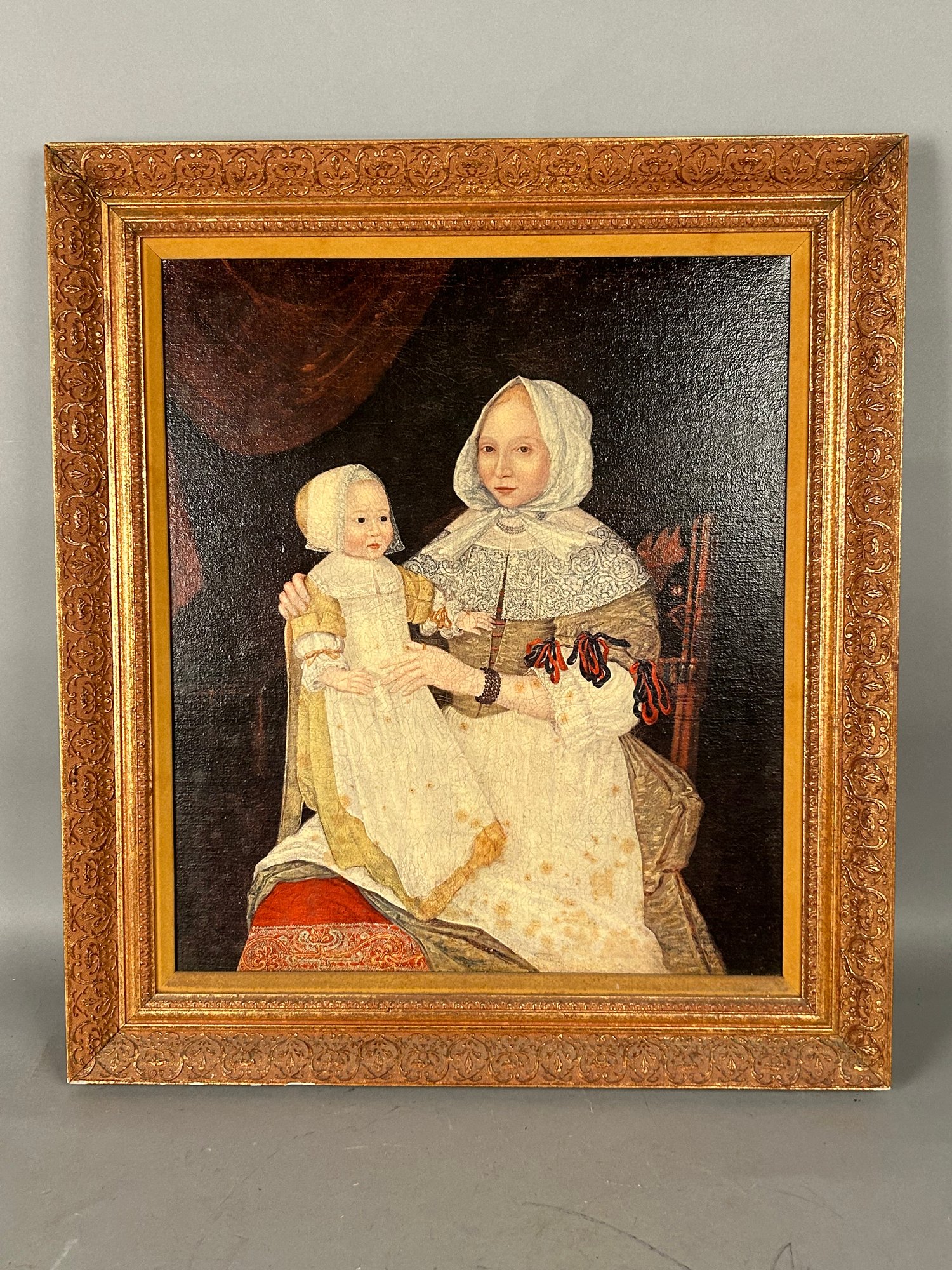 Antique folk art style portrait, mother with child. High quality framed print on canvas