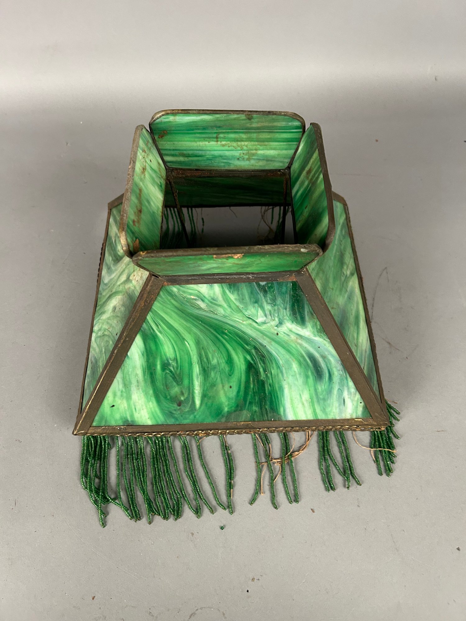 Antique green slag glass lampshade with bead work tassels