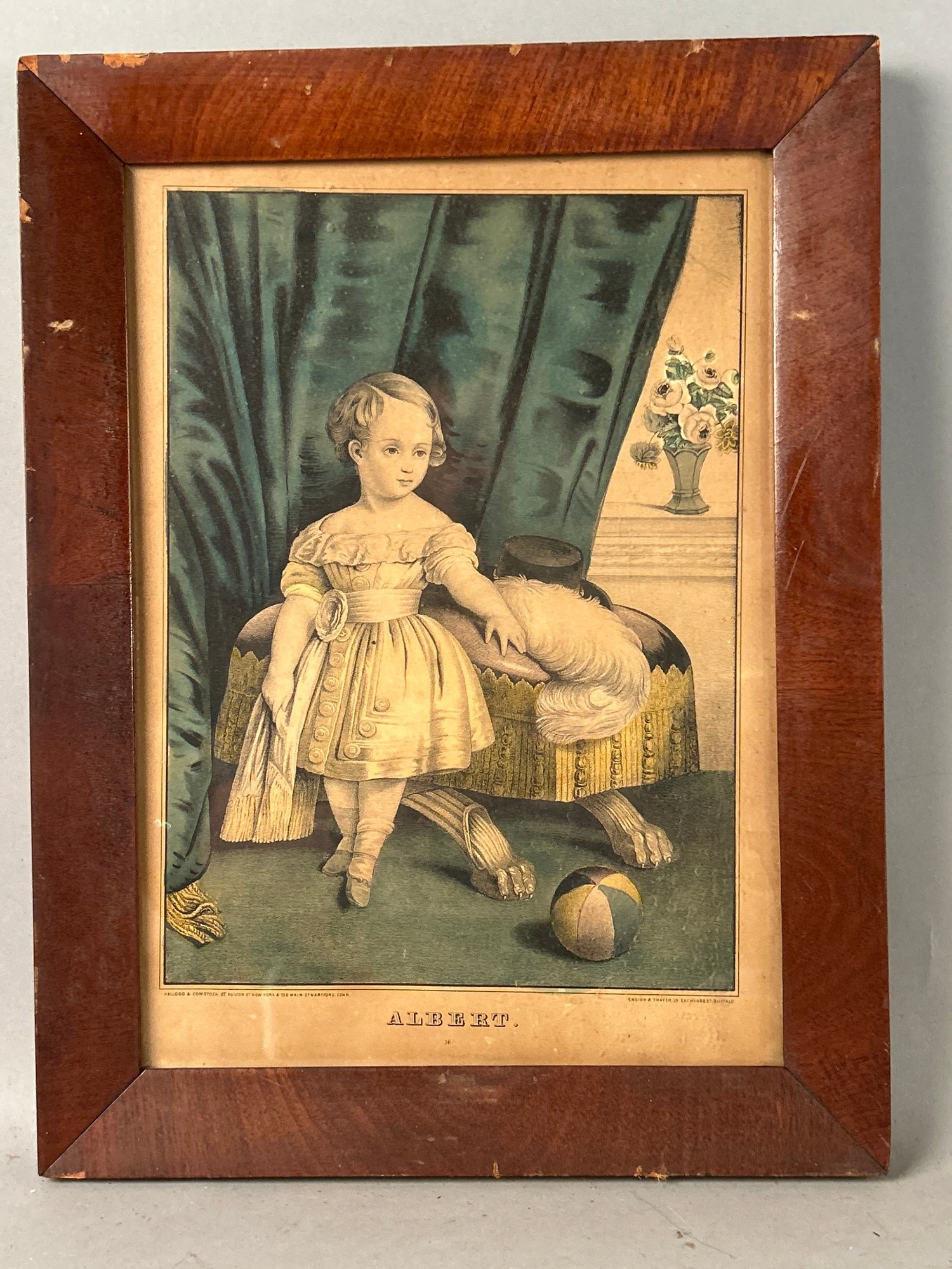 19 century print in original mahogany veneer frame. Child with ball 16 1/2“ x 12 1/2“