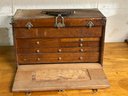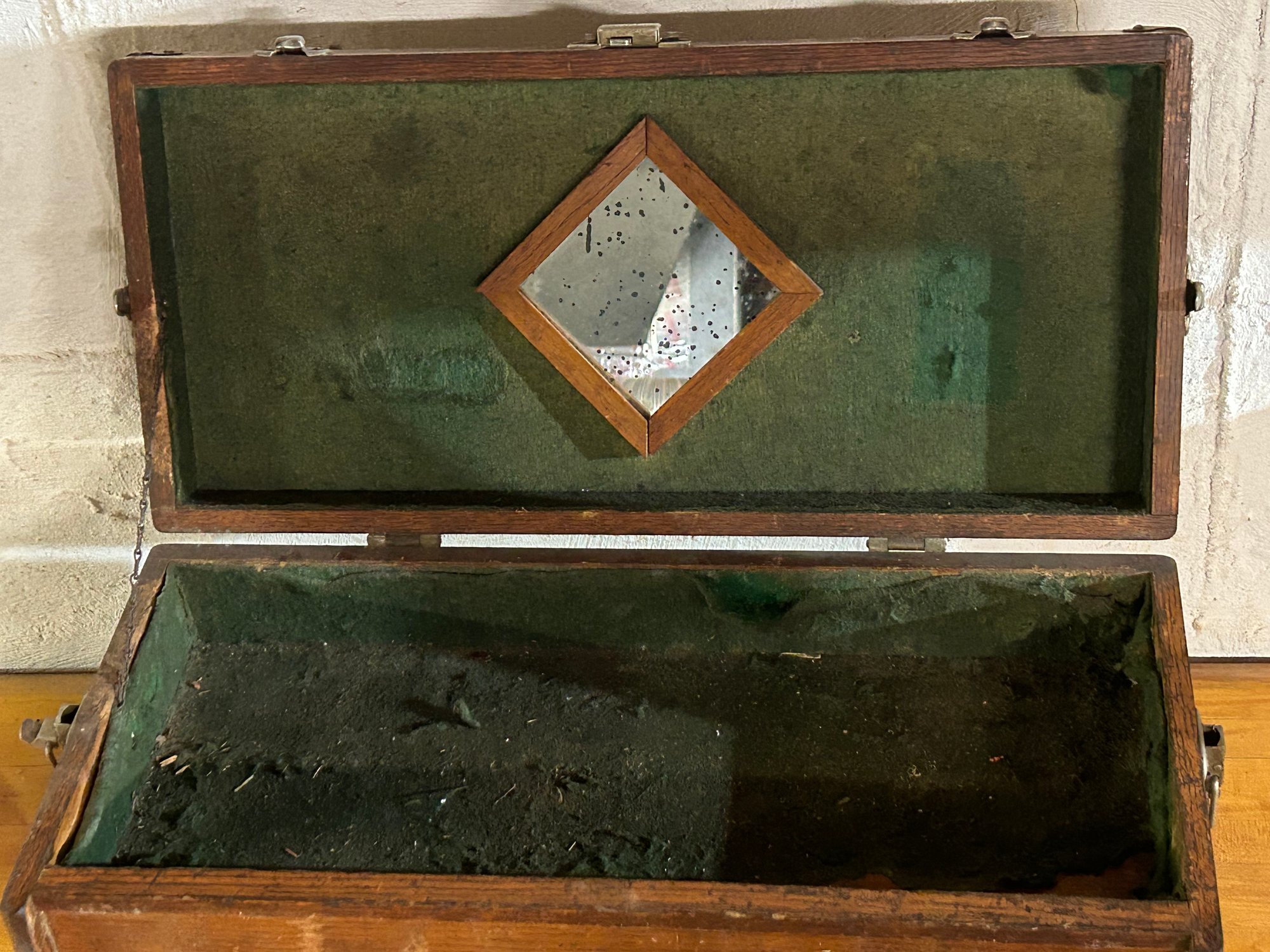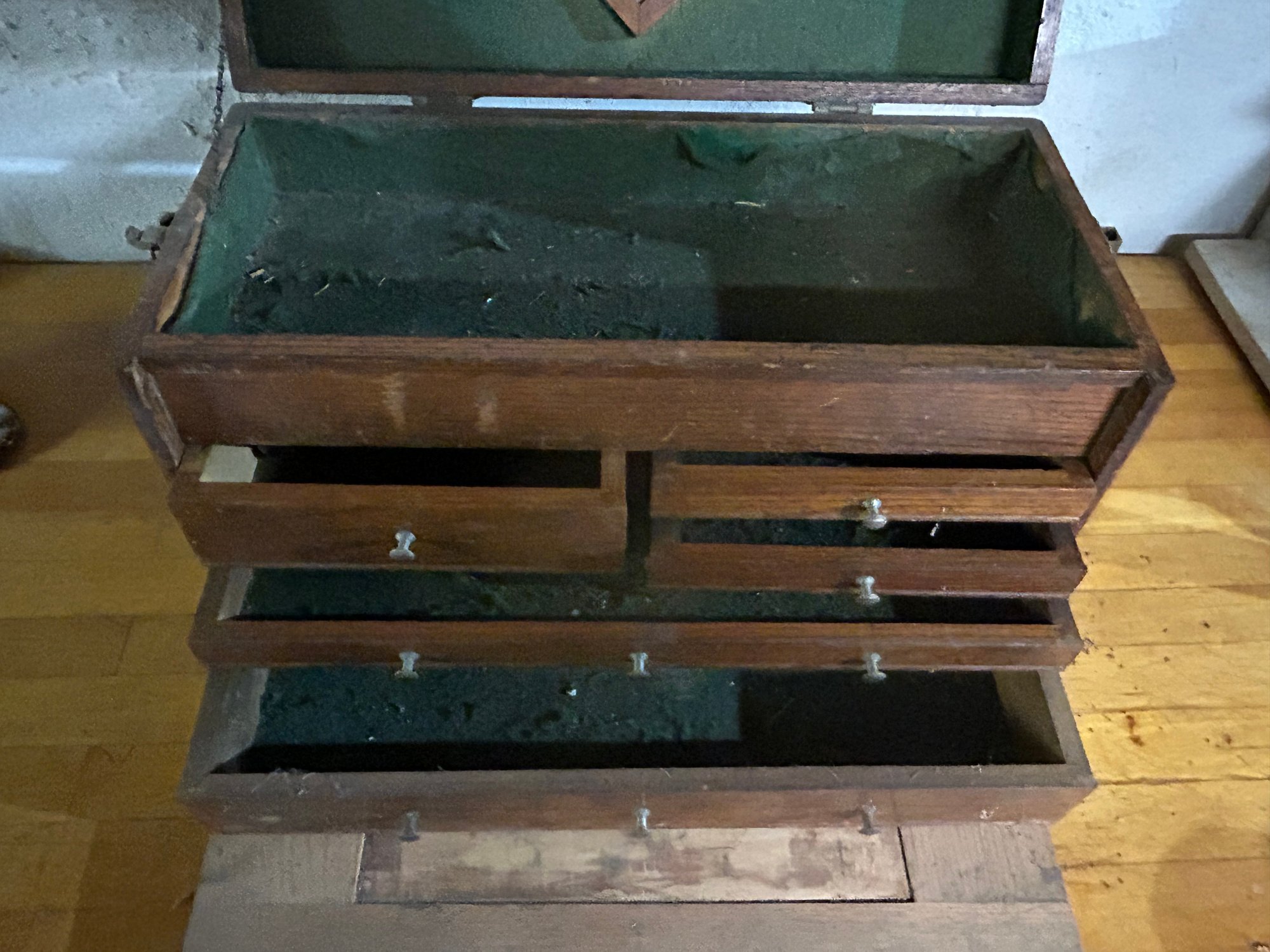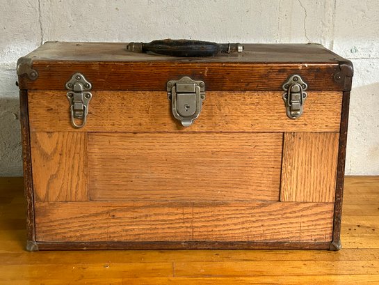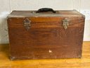 Antique oak tool chest in original condition with original hardware and leather handle. Front door stripped, interior felt as is 20” x 9 1/2” x 12”.