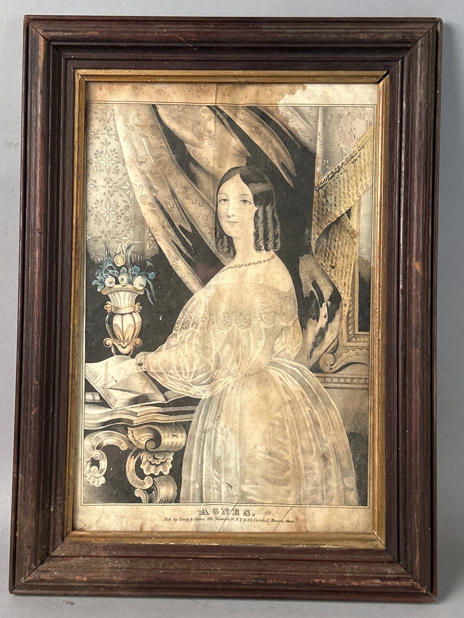 Antique print of woman with book. Flowers and background. As found condition staining and wrinkled in nice antique walnut frame under glass. 16 1/2“ x 12 1/4“
