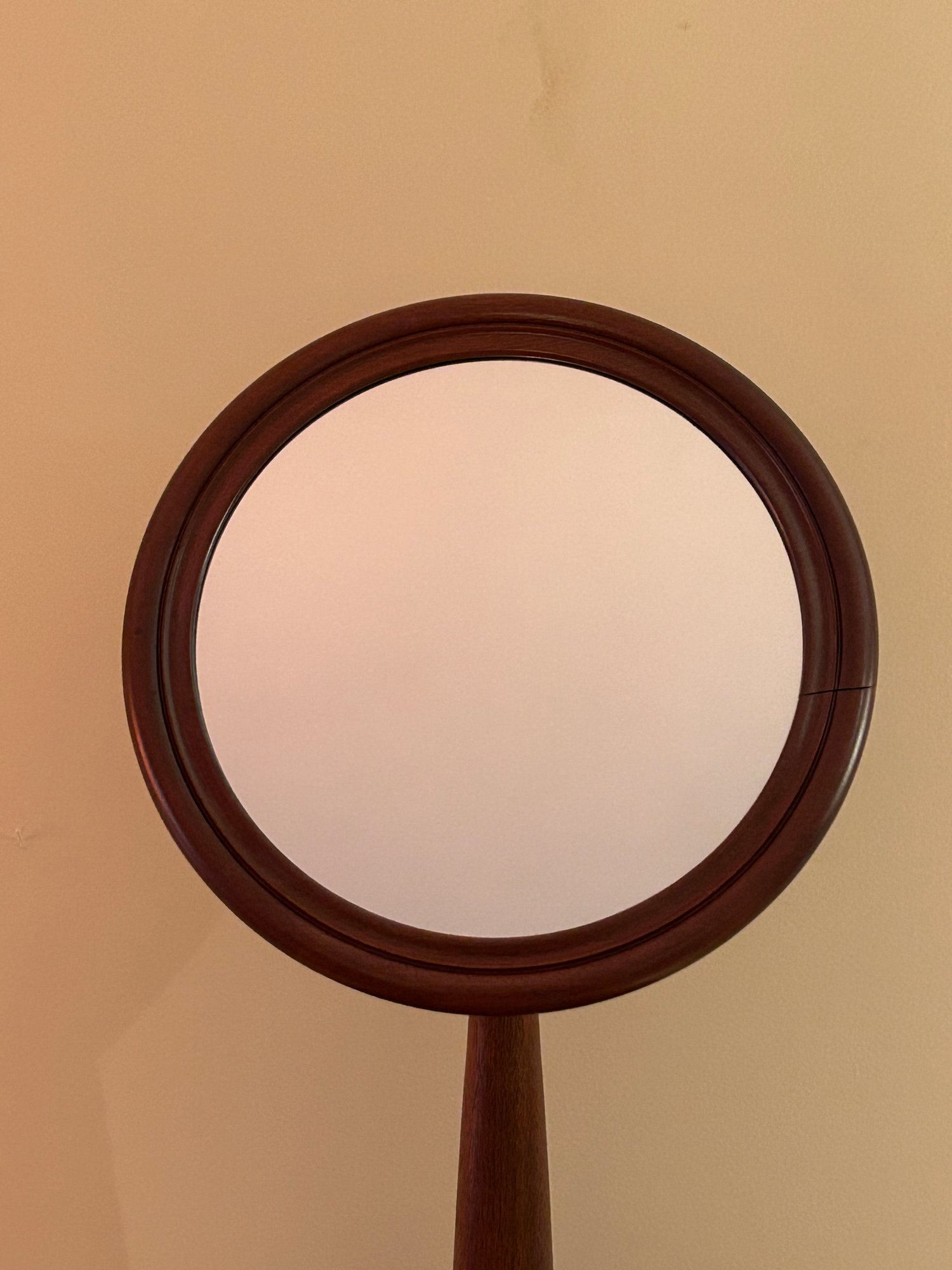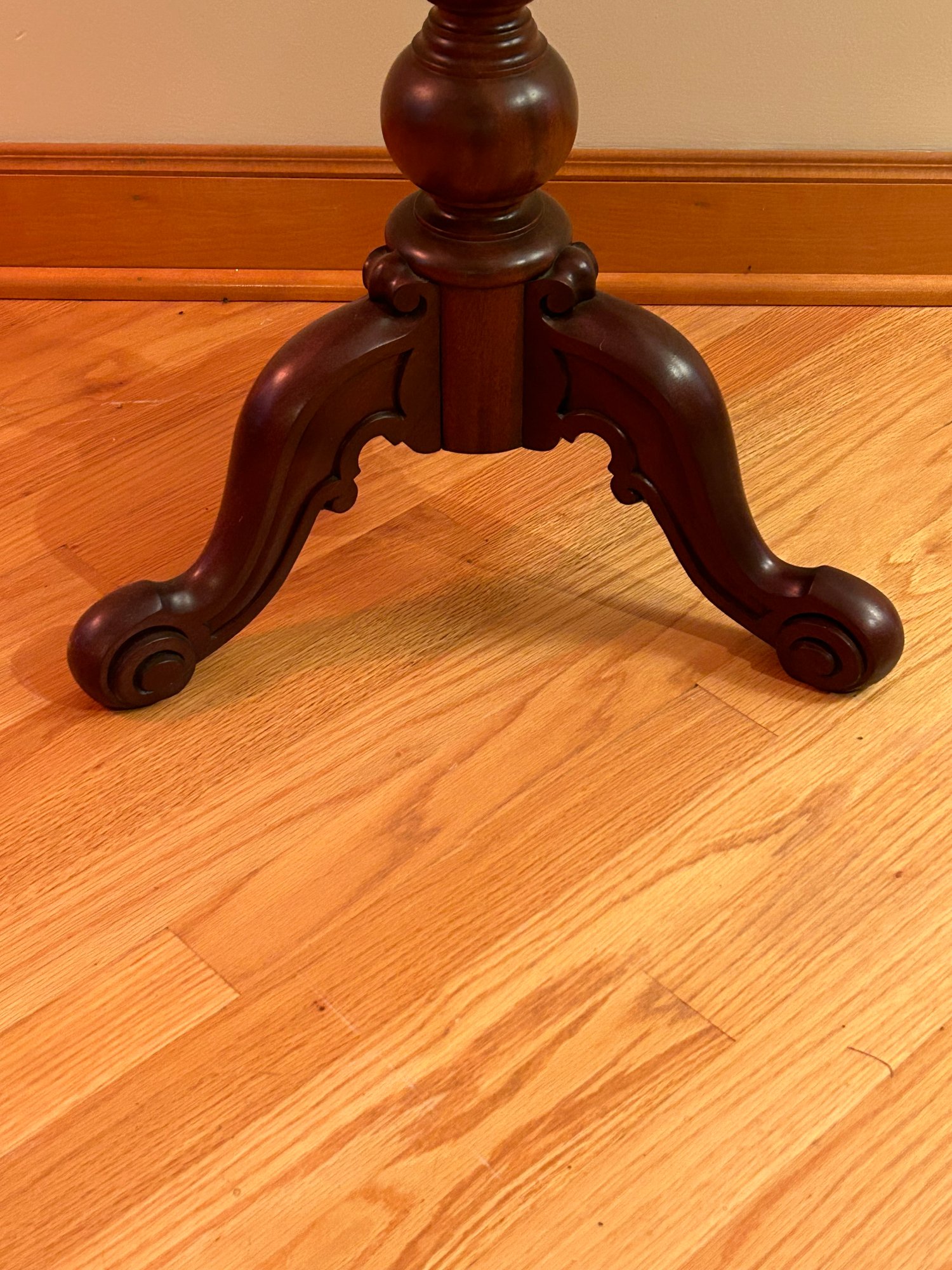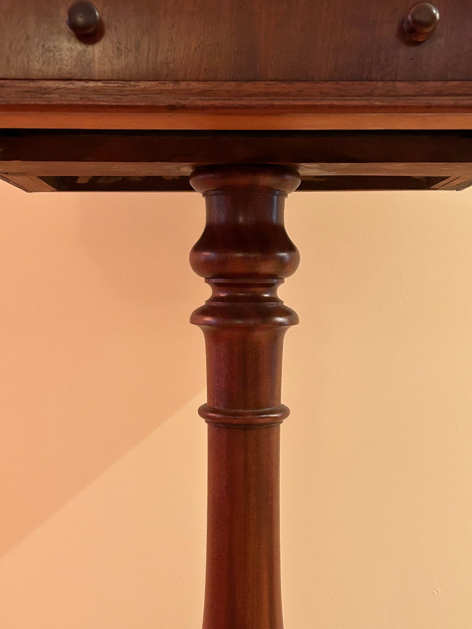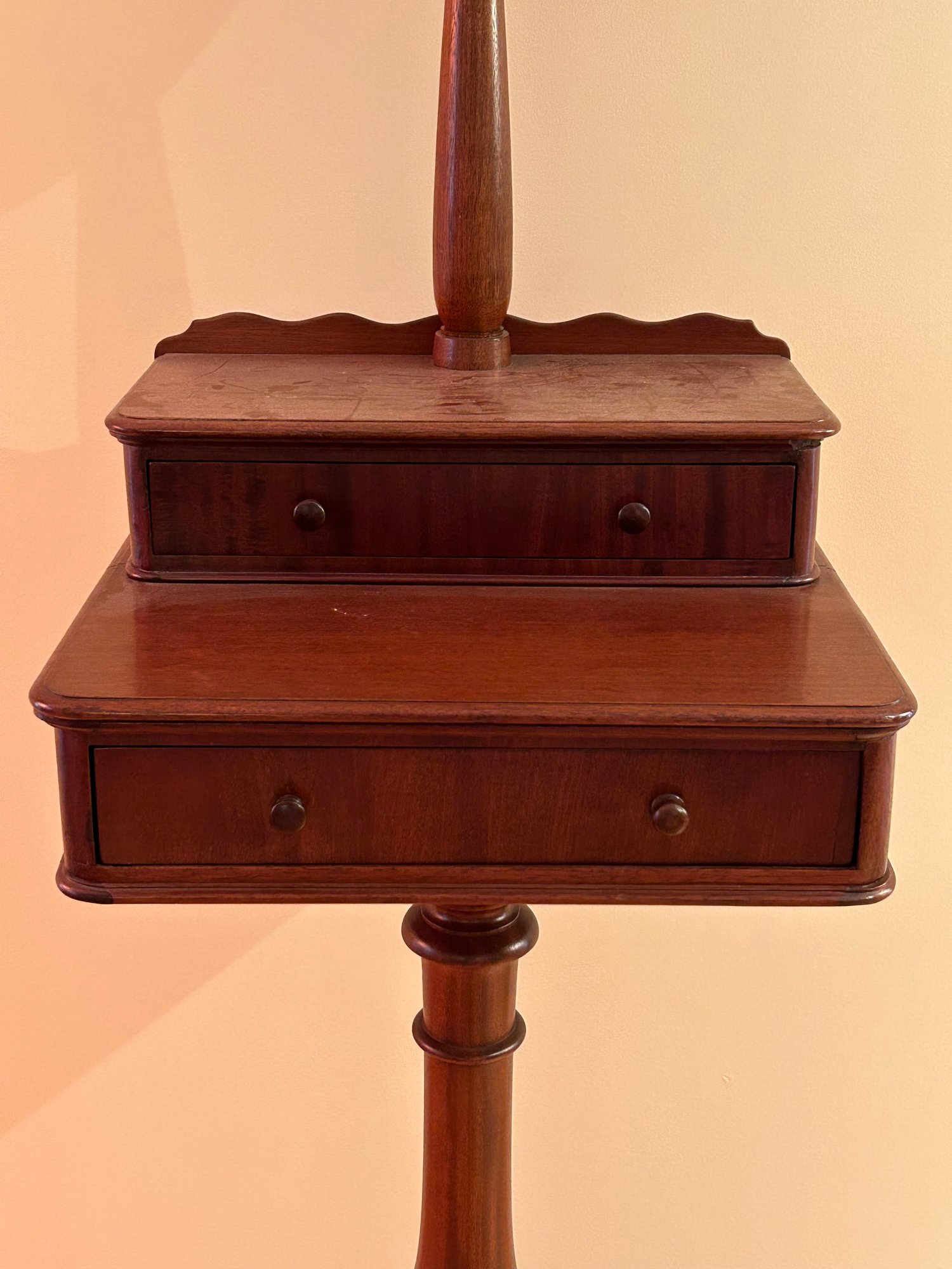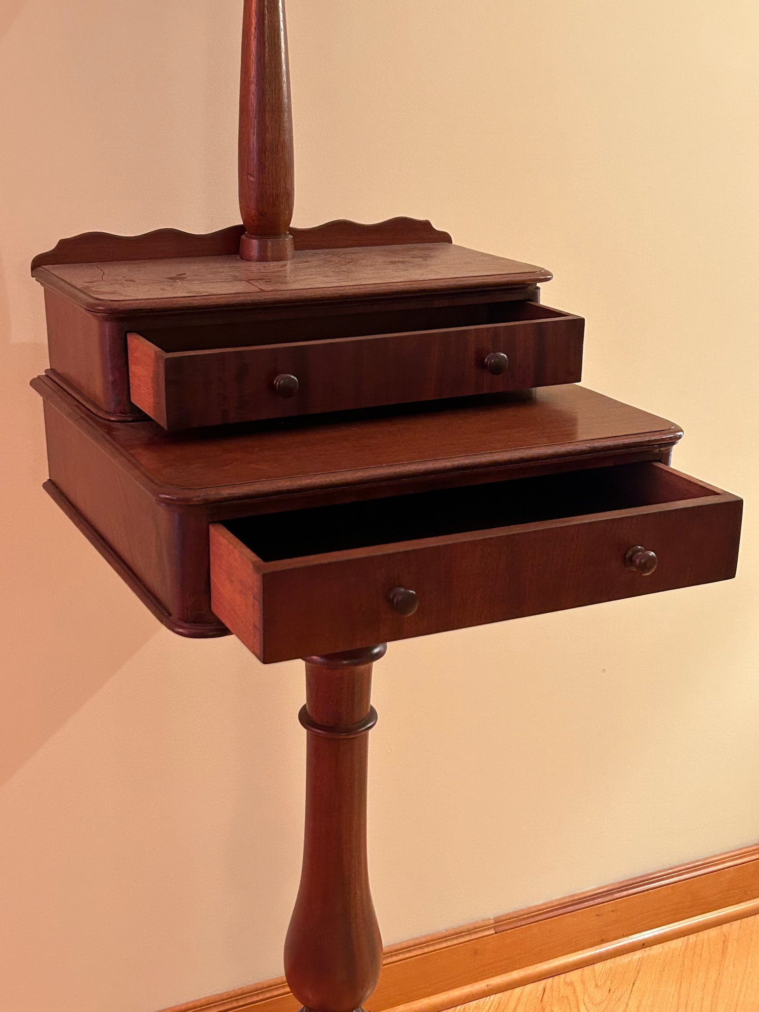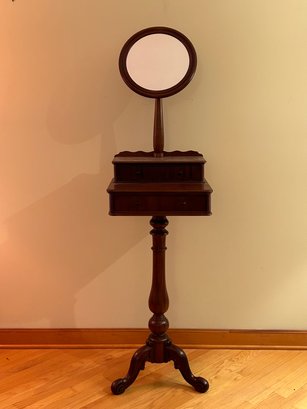 Antique shaving stand with adjustable mirror, two drawer pedestal, tri leg stand with turn shaft. Walnut 65x17.5x15.5 inches