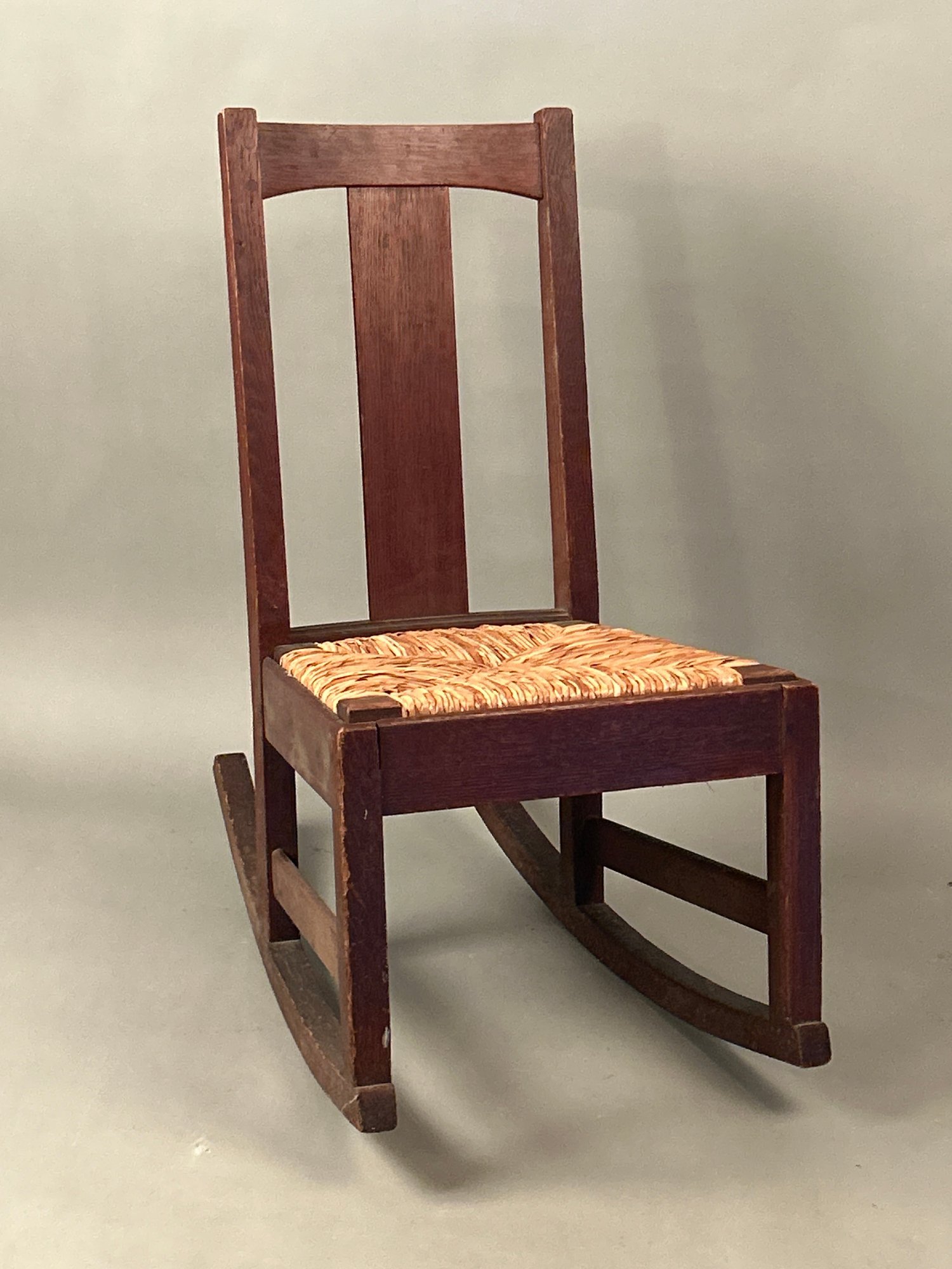 Antique signed Limbert Arts And Crafts Rocking Chair Made of oak. Old surface, small size with rerushed seat. 17“ x 26“ x 31 1/2“ tall.
