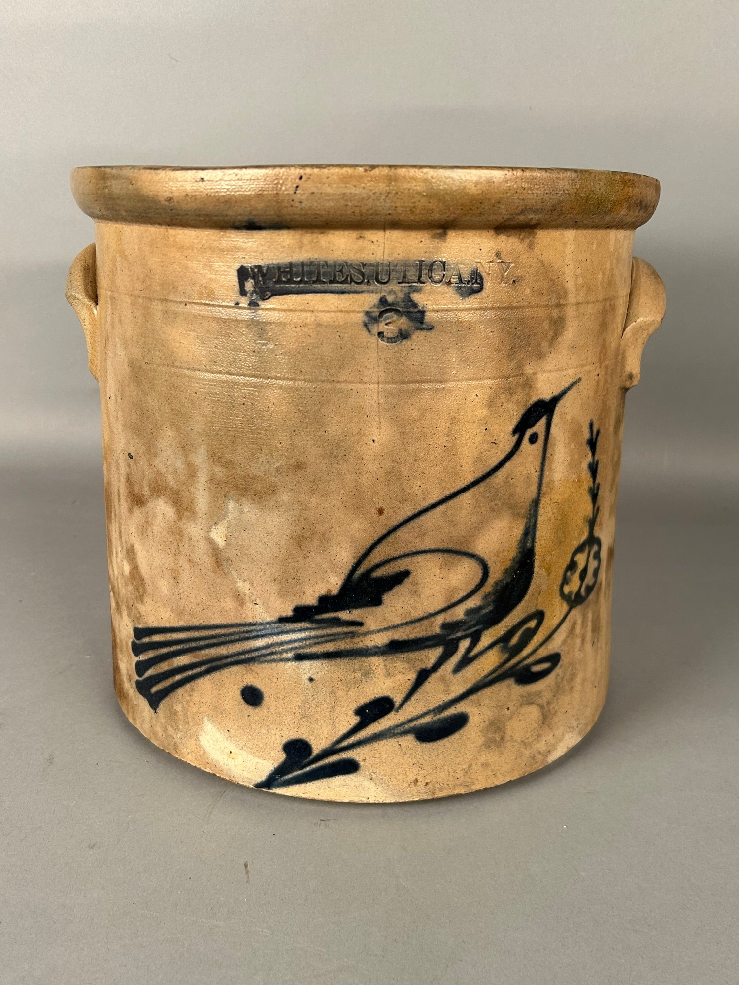 Antique Stoneware Crock bird on branch Cobalt Blue Whites Utica