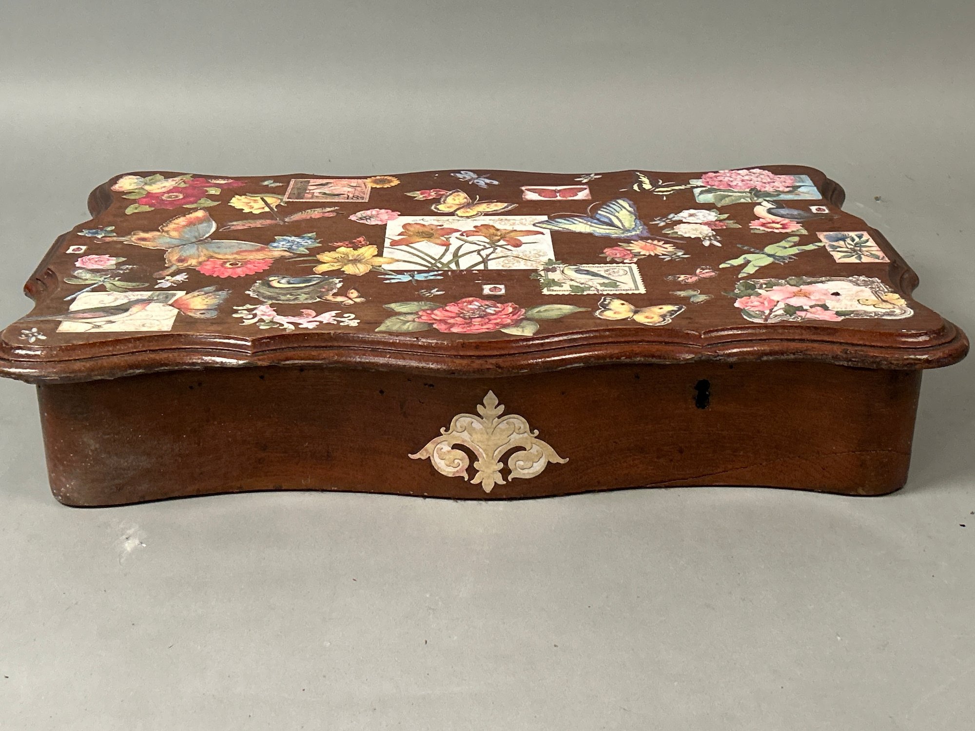 Antique walnut Decoupage Table Top Box 19 century serpentine box with later decapod design. Probably a sewing table originally. 25 x 15 1/2 x 5.