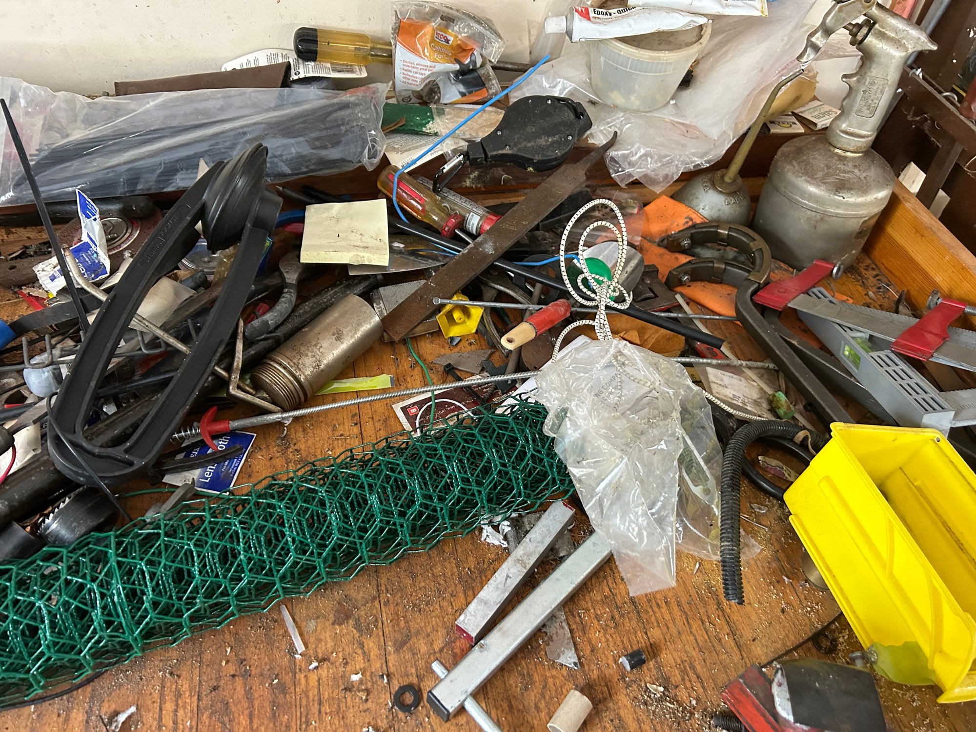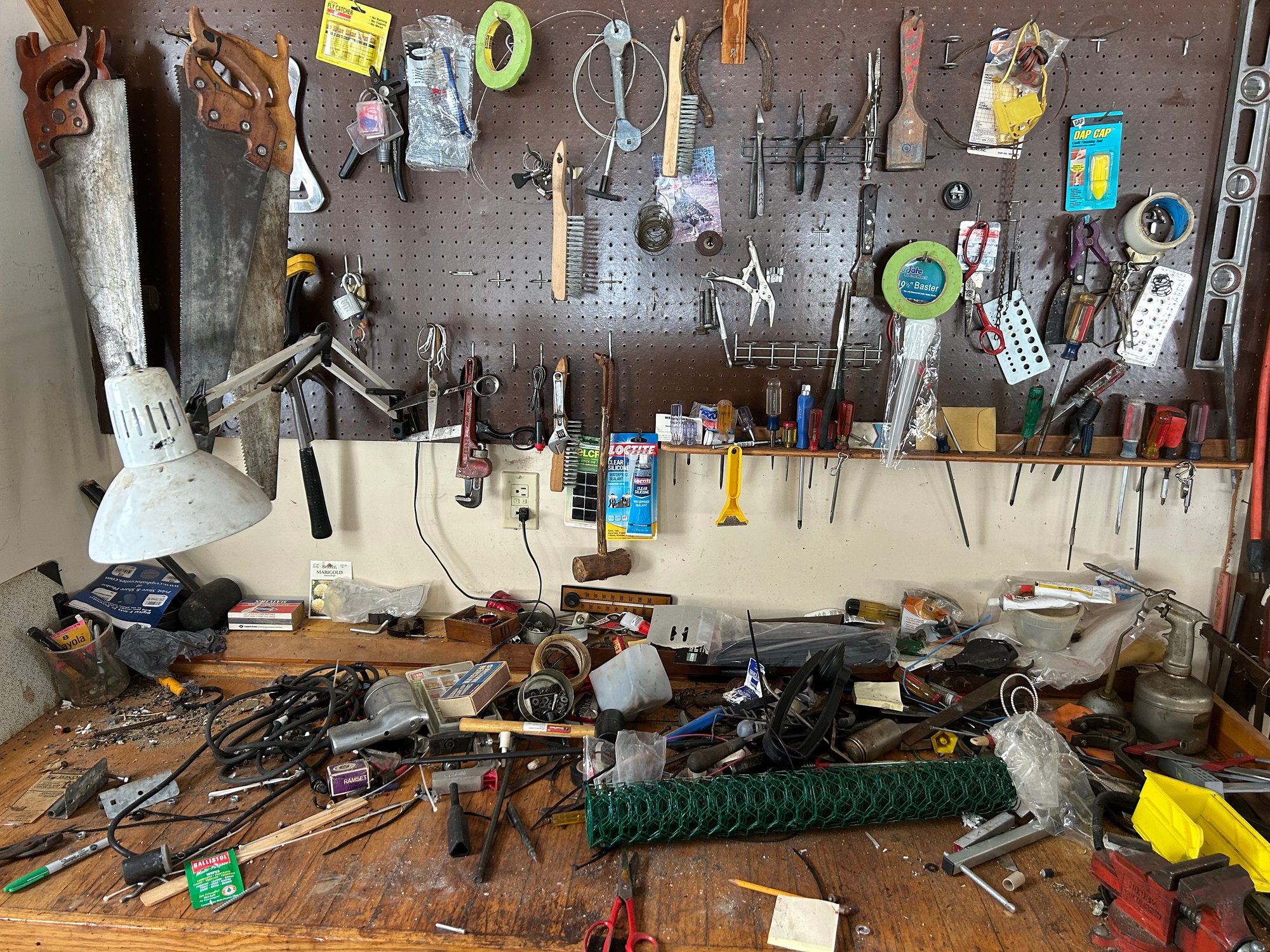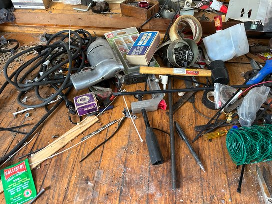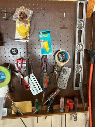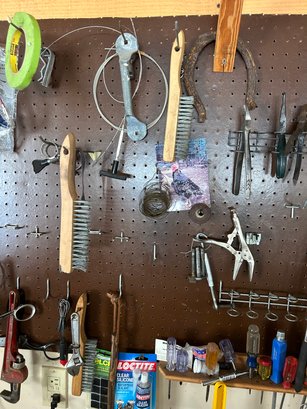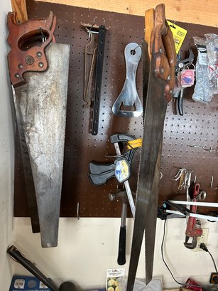 Garage tool lot, all tools on bench and on wall in photograph. Includes pliers, wire, cutters, vice grips, screwdrivers, level, hammers, saws, etc..