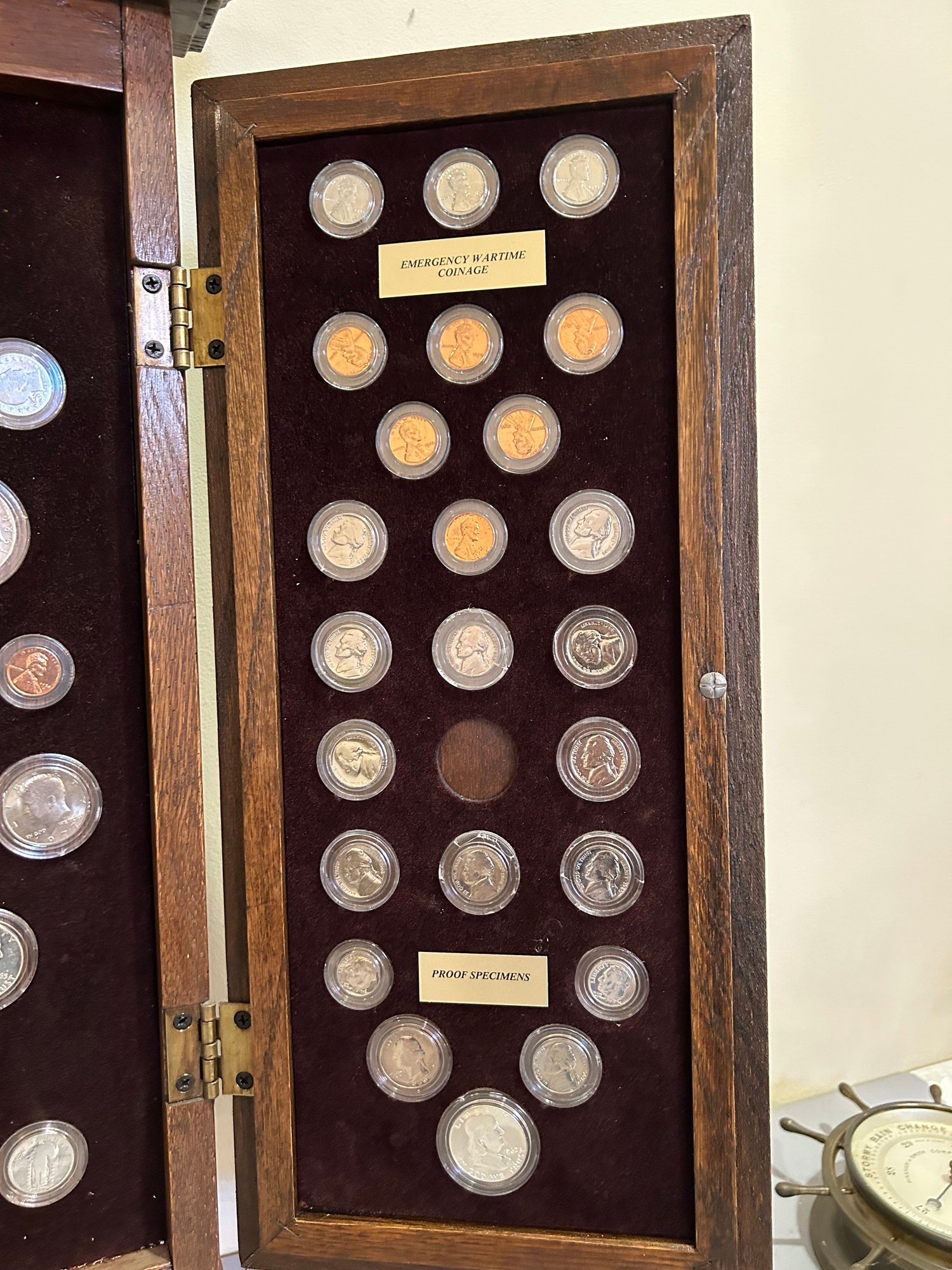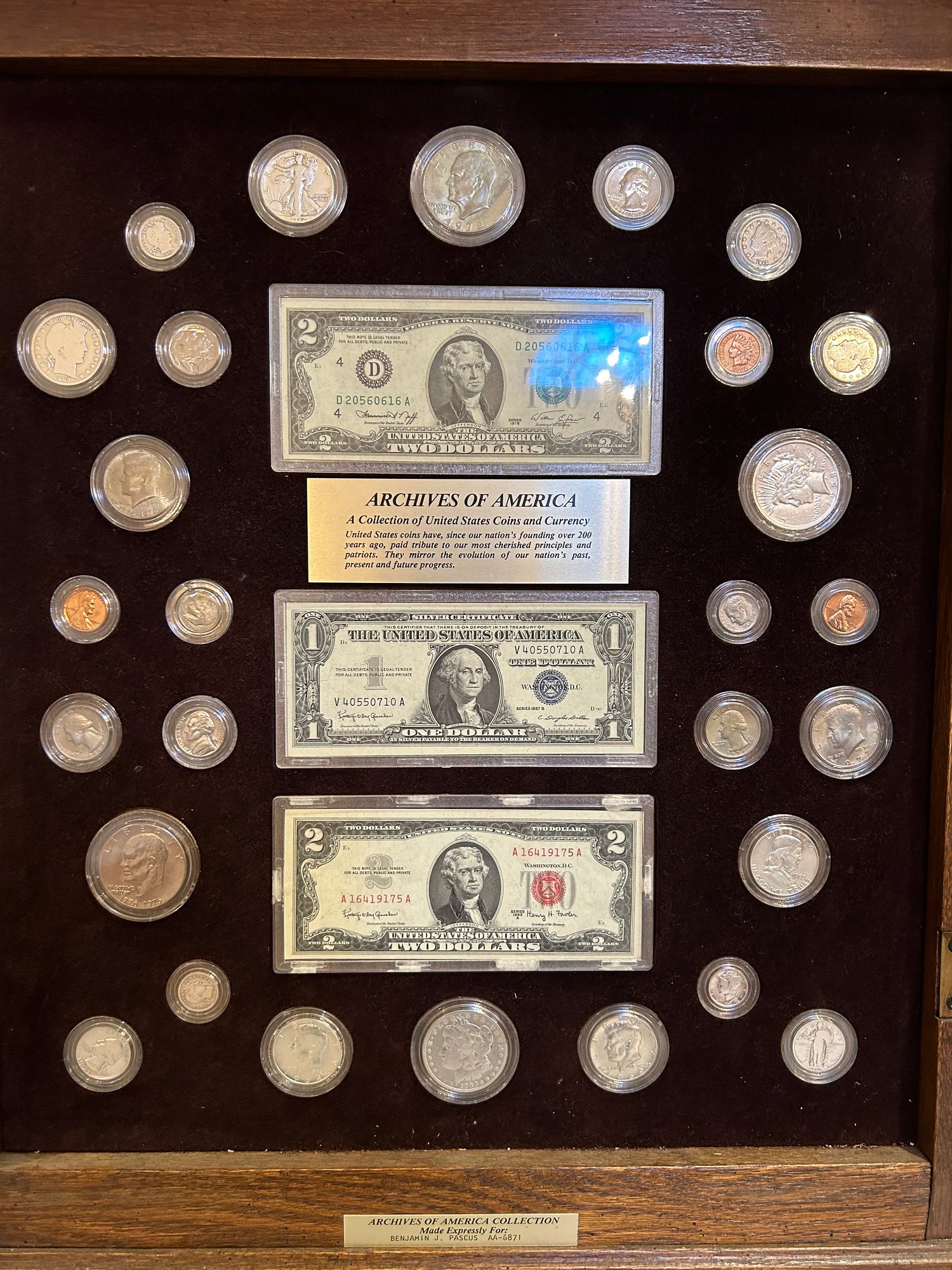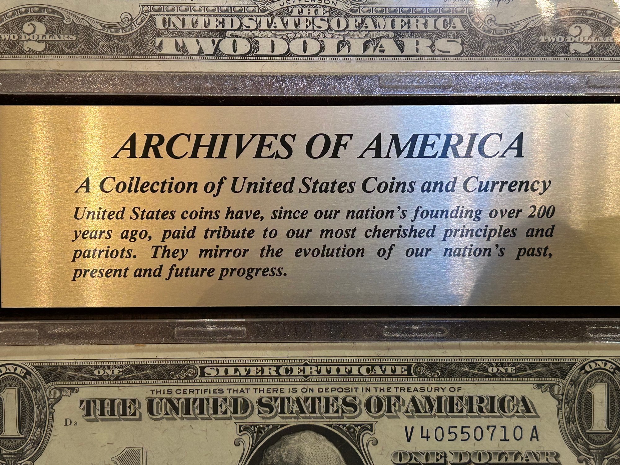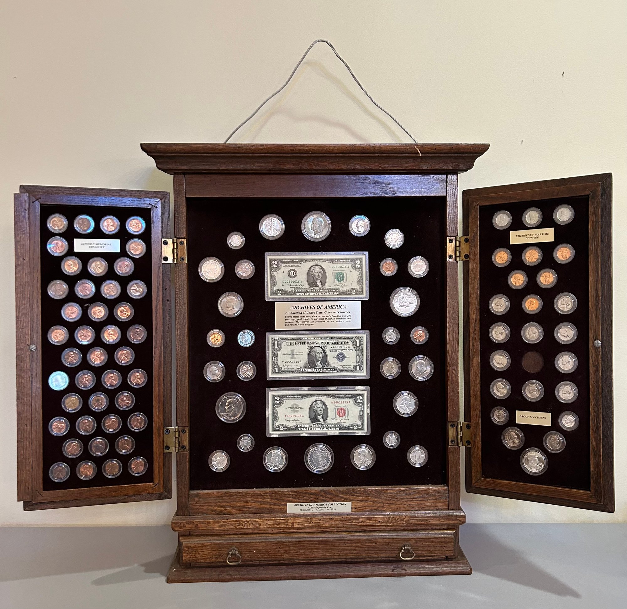Archives of America coin and currency collection, includes “emergency war time coinage”, “proof, specimens”, “Lincoln, Memorial treasury” collection includes silver coins, Morgan dollar, peace dollar, etc... includes 100 coins, 2 two dollar bills and one one dollar bill silver certificate one coin missing from collection 19“ x 5 1/2“ x 26 1/2“ tall.