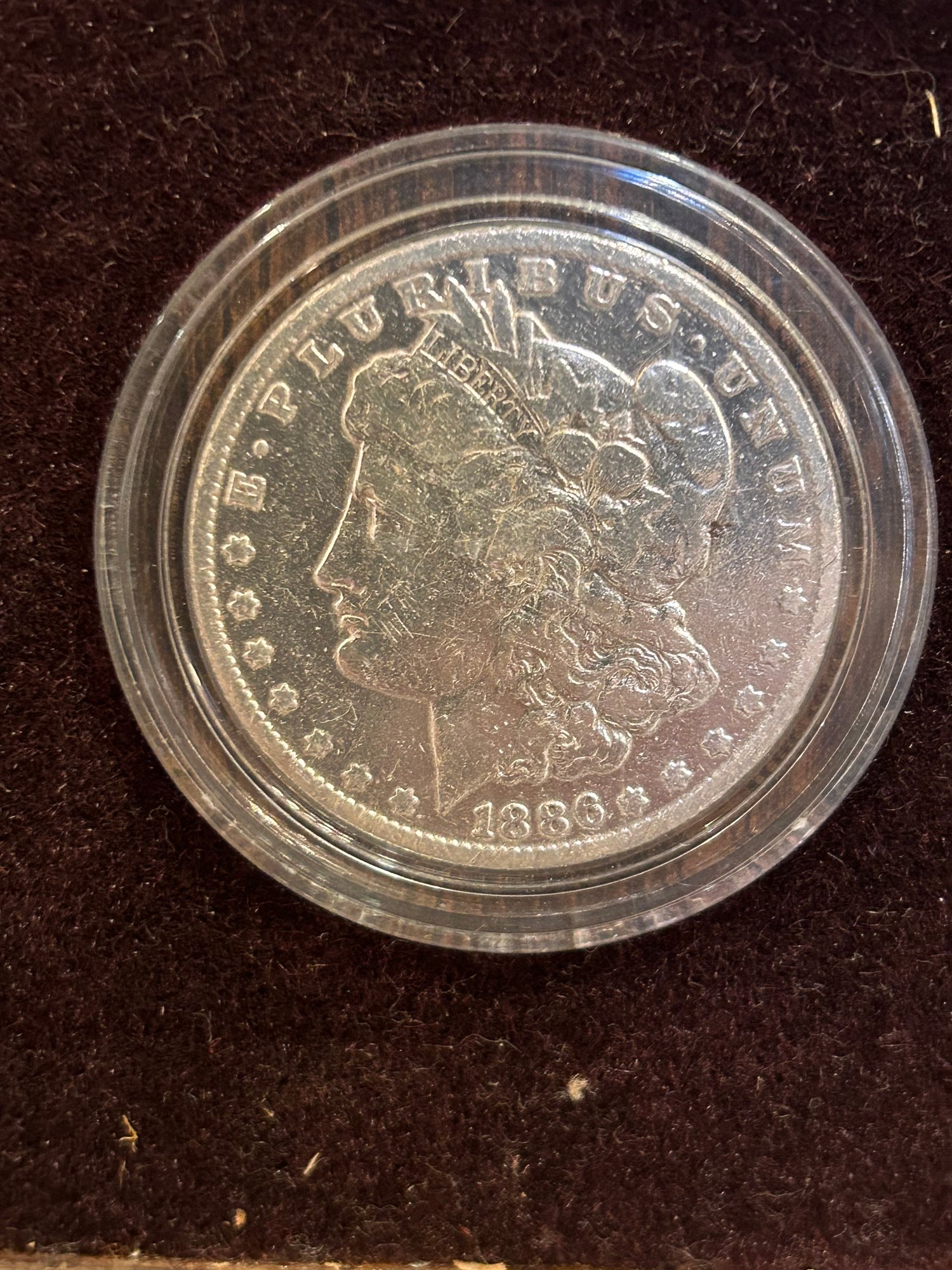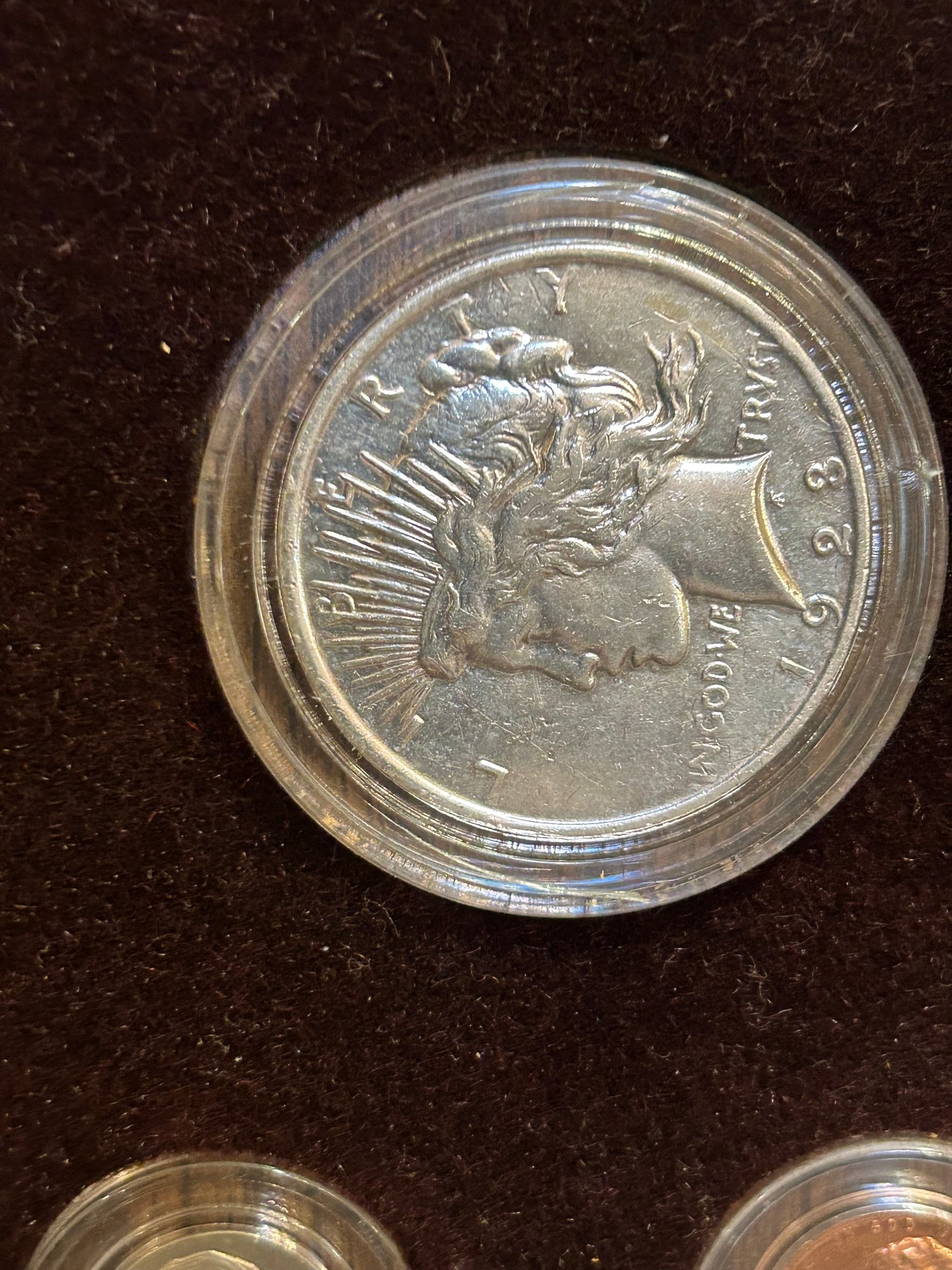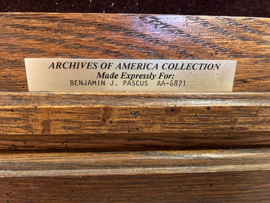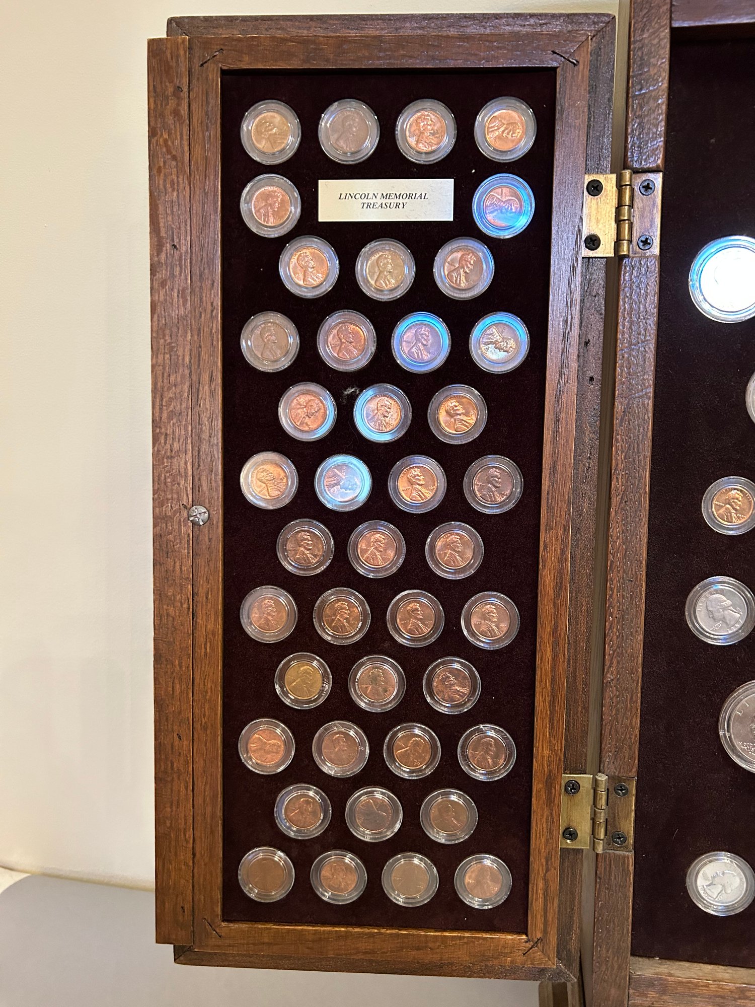 Archives of America coin and currency collection, includes “emergency war time coinage”, “proof, specimens”, “Lincoln, Memorial treasury” collection includes silver coins, Morgan dollar, peace dollar, etc... includes 100 coins, 2 two dollar bills and one one dollar bill silver certificate one coin missing from collection 19“ x 5 1/2“ x 26 1/2“ tall.
