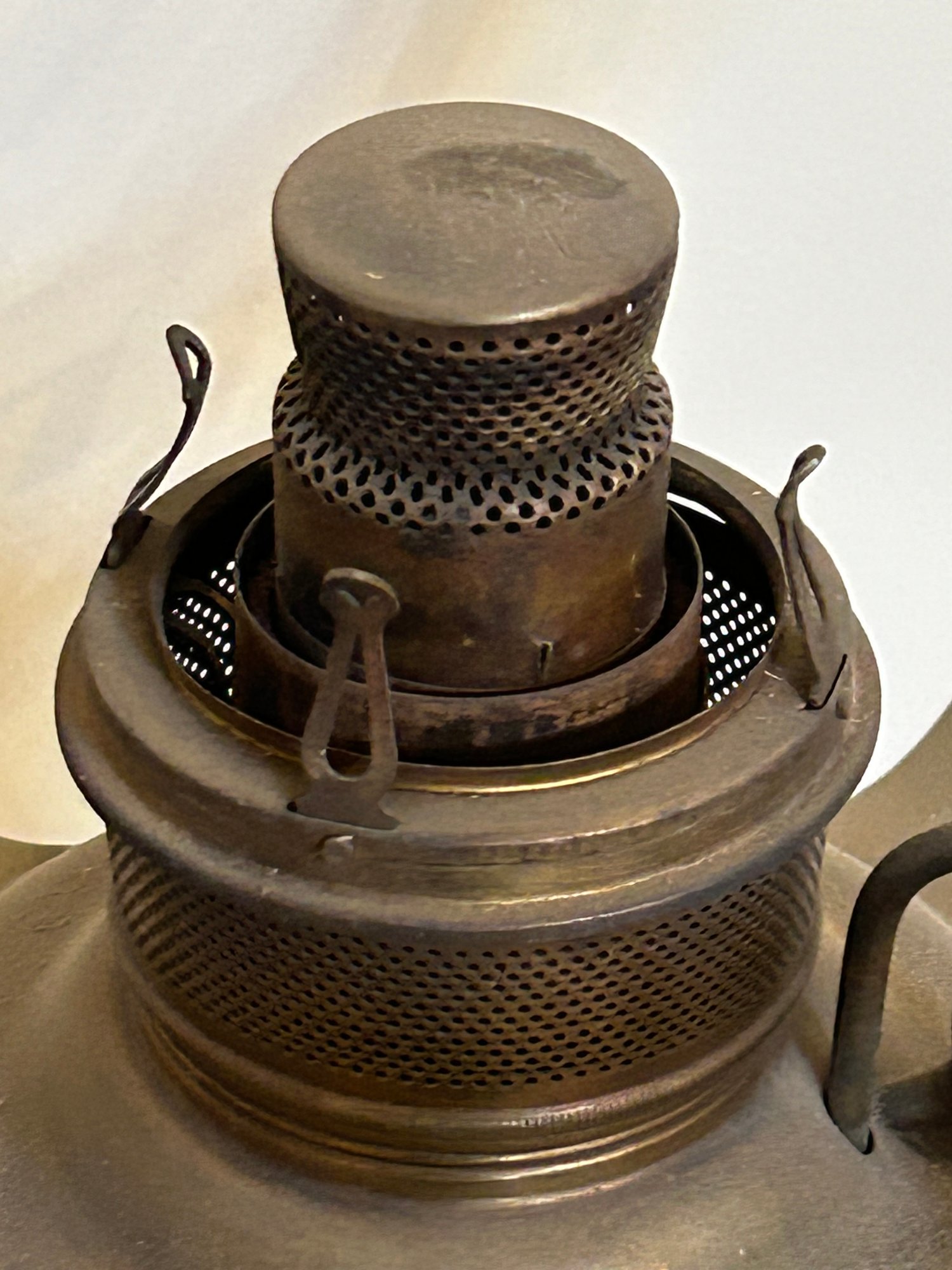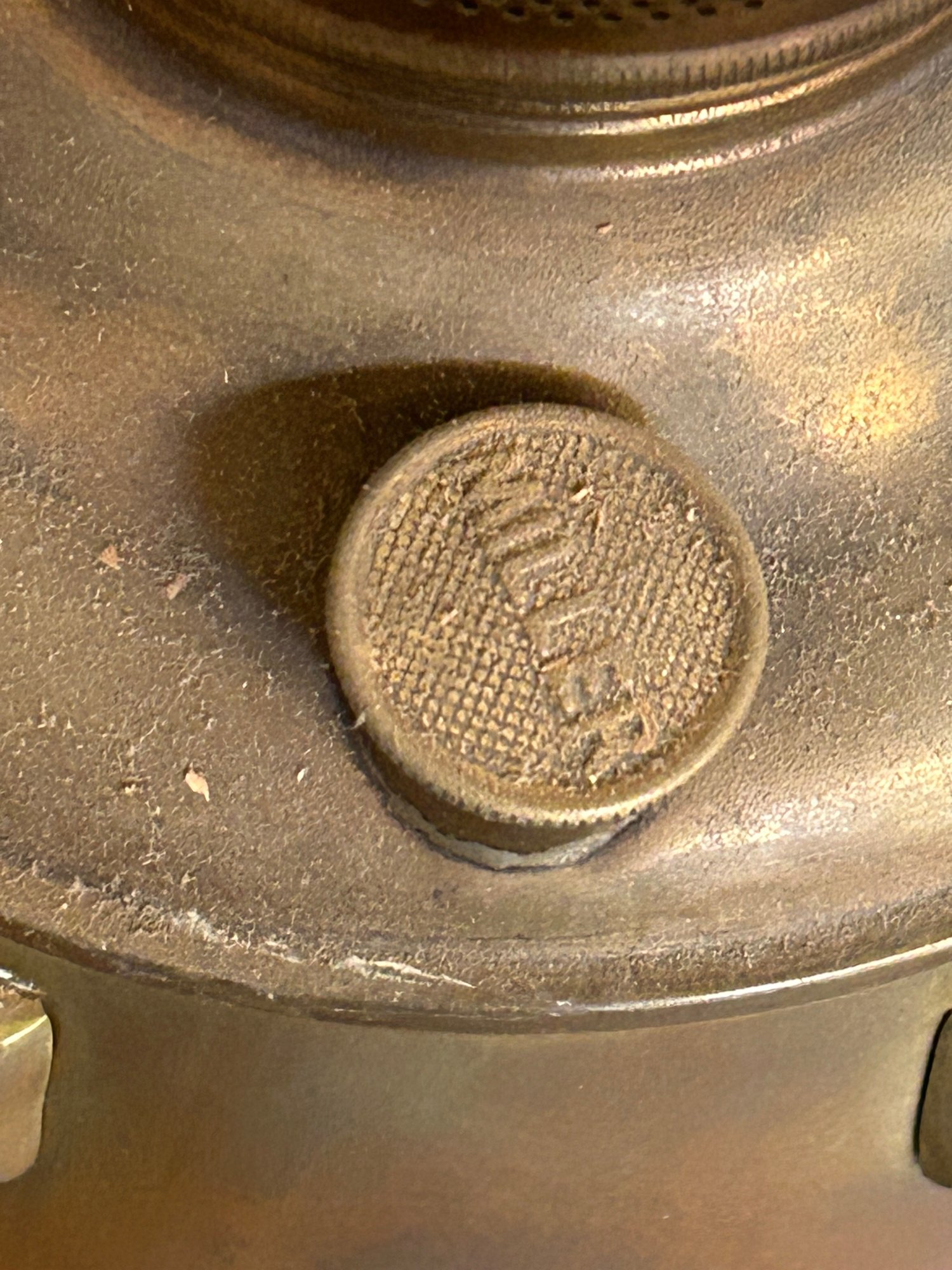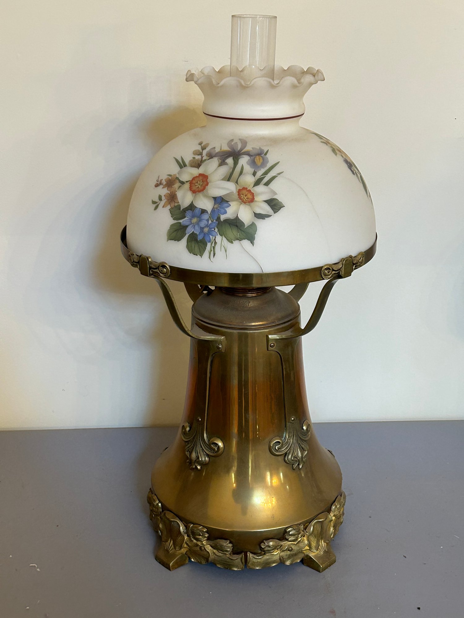 Arts and crafts era royal lamp with Miller brass base, shade damaged 26 inches tall