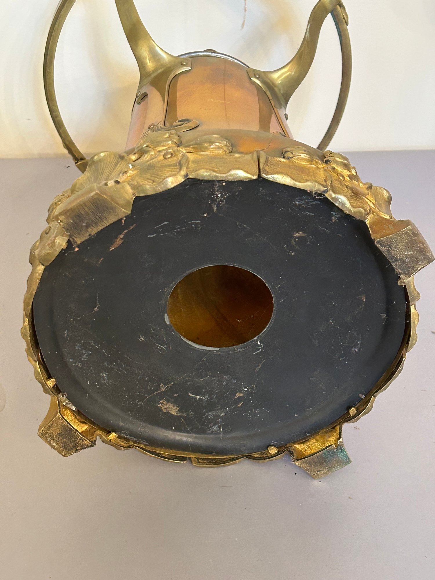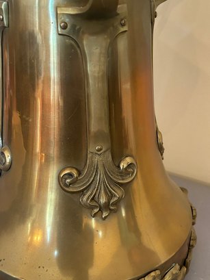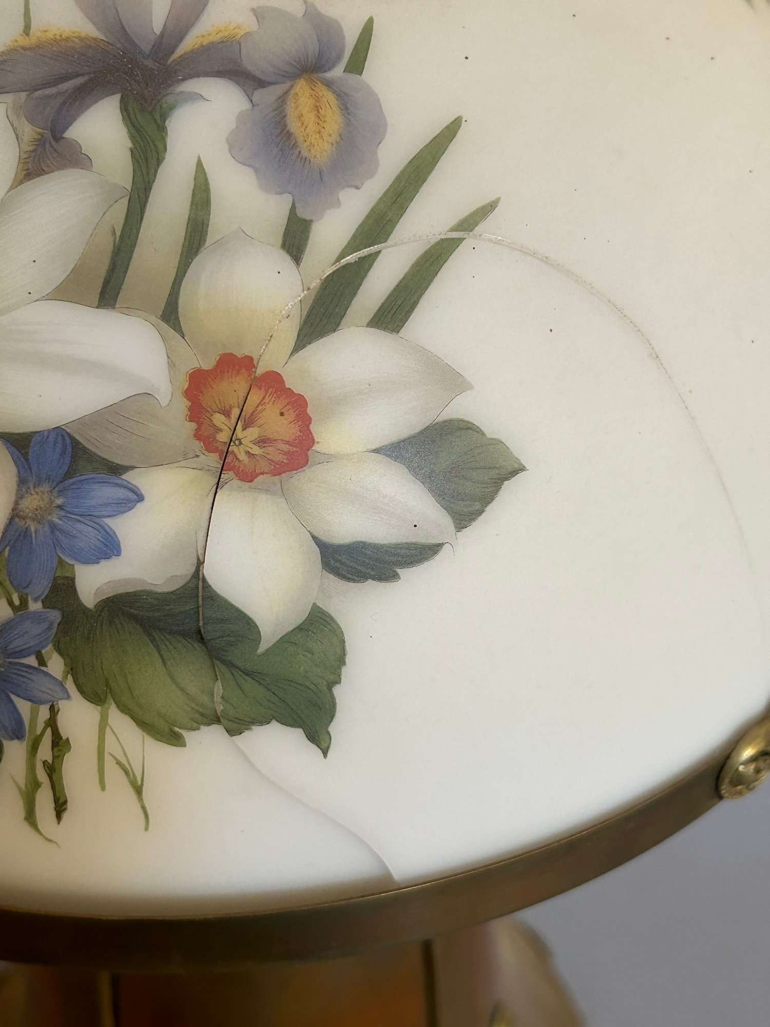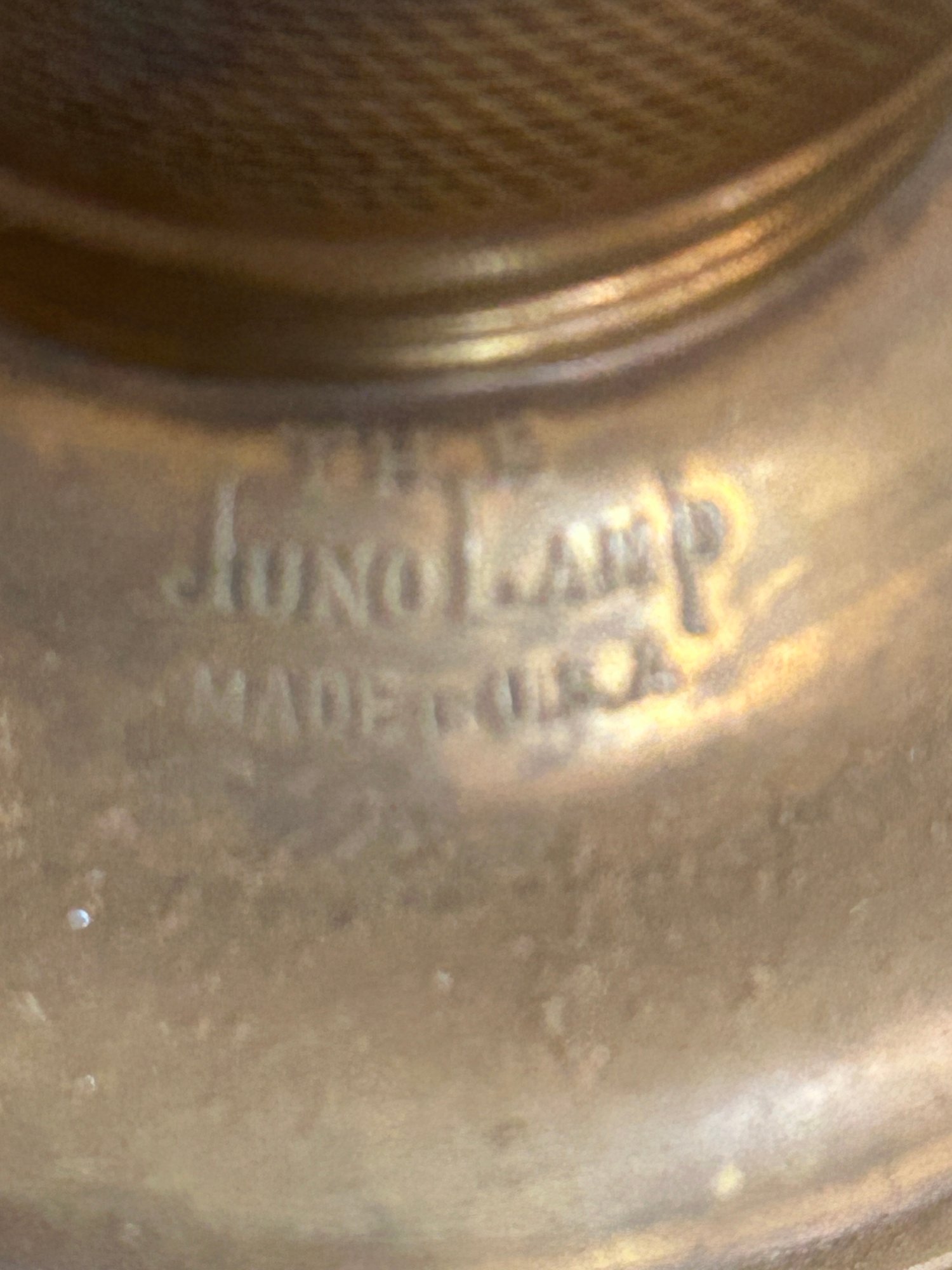 Arts and crafts era royal lamp with Miller brass base, shade damaged 26 inches tall