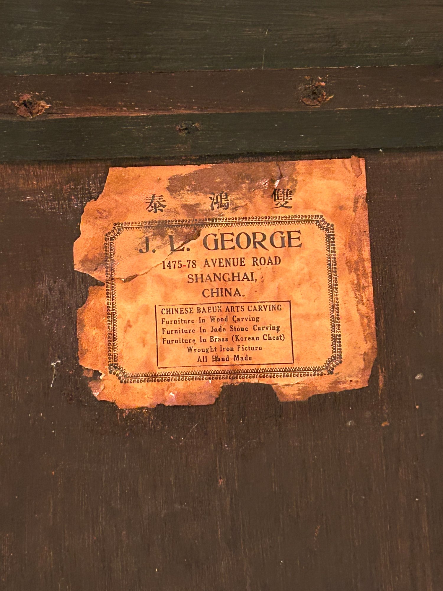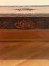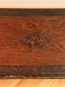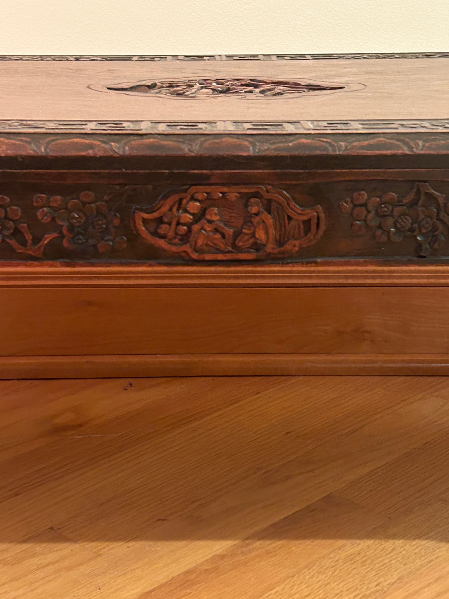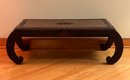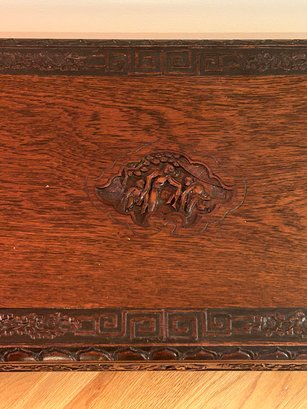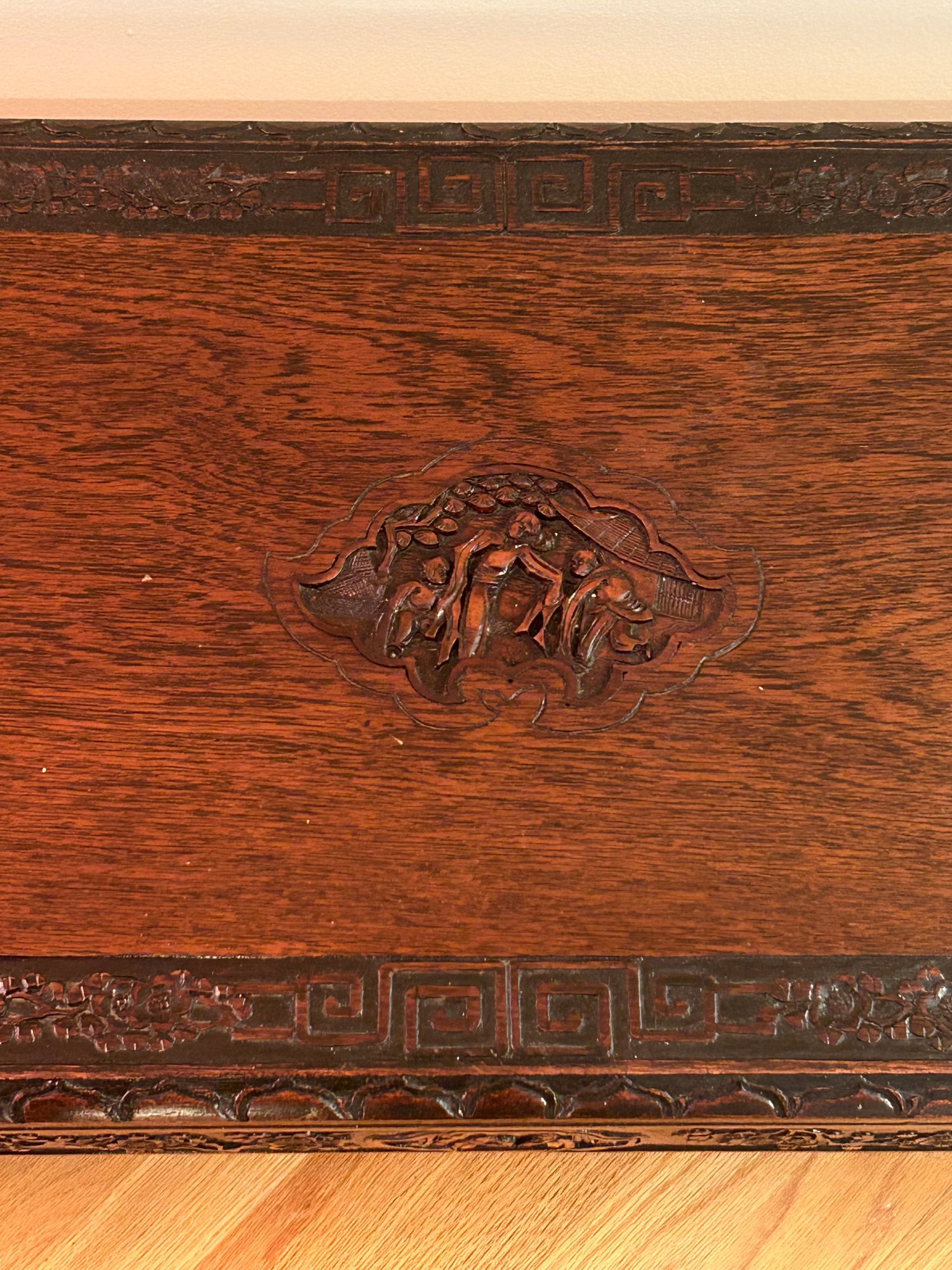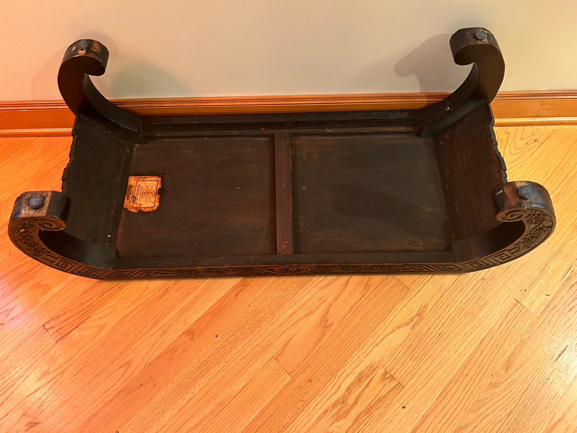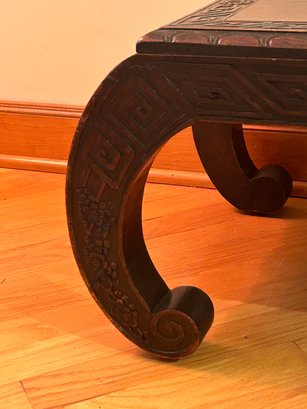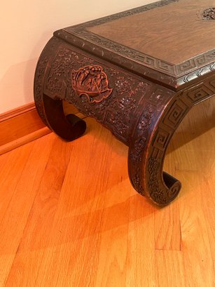 Asian Hardwood table with multiple carvings including center medallion with people, borders with carved floral design, 12x40x17 inches