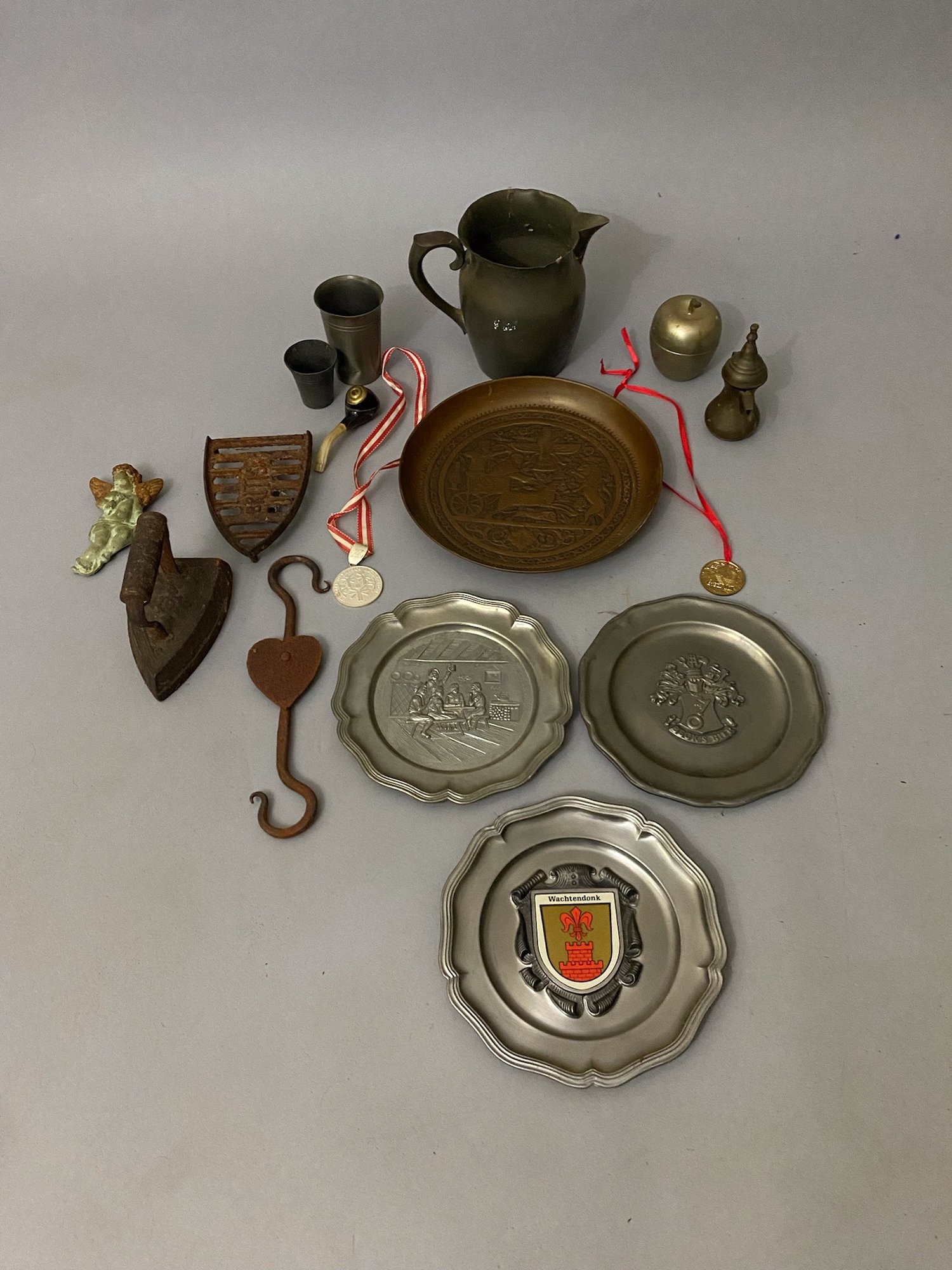 Assorted metal items. Plates, pitcher, Iron, etc... Largest plate 11" diameter