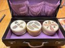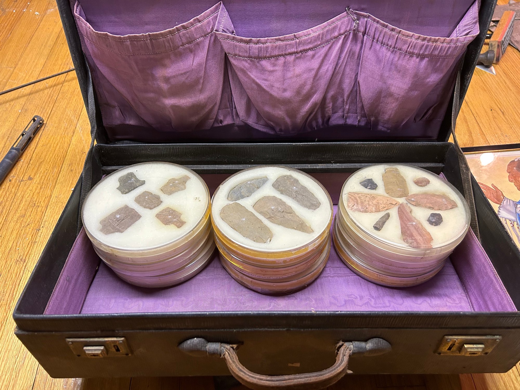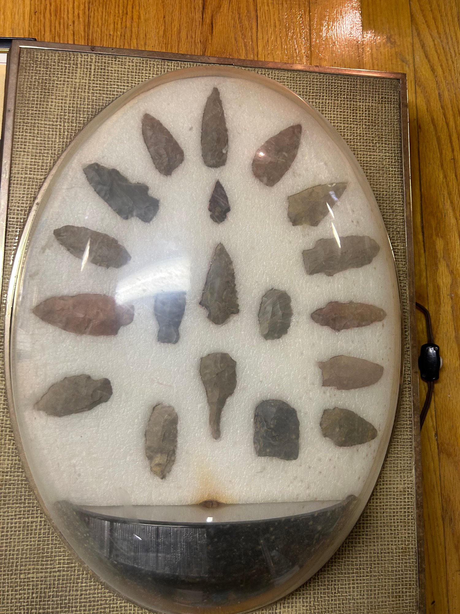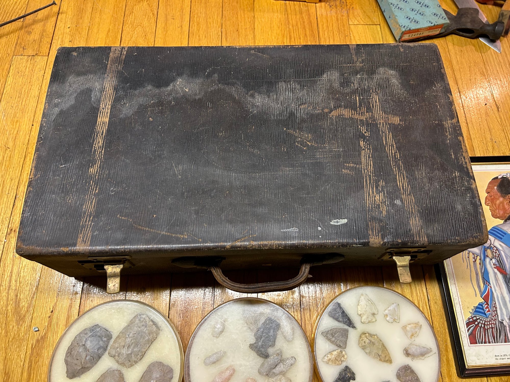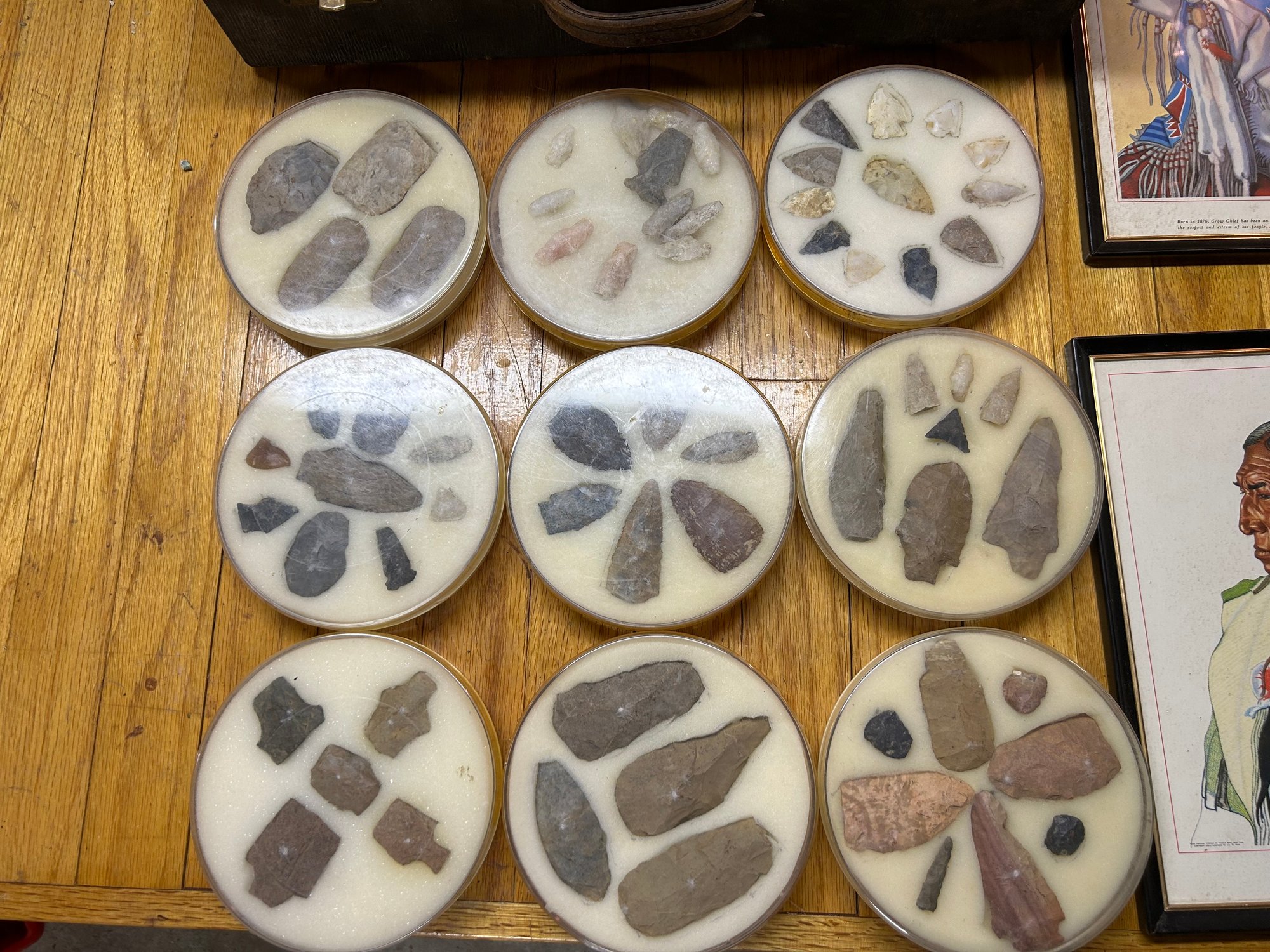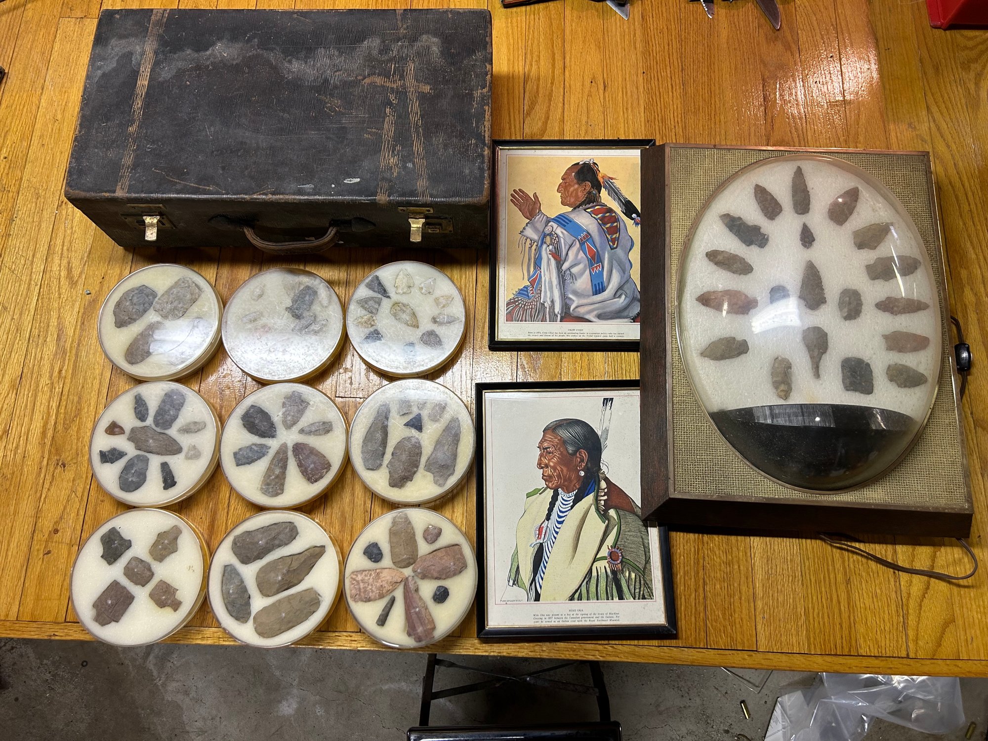 Native American Indian arrowhead lot includes nine 6 1/4 inch cylinders filled with arrowheads set in foam, a large framed display with dome plastic cover 20“ x 15 1/2“ and two Native American prints, Mike Oka and crow chief. With leather carrying case.