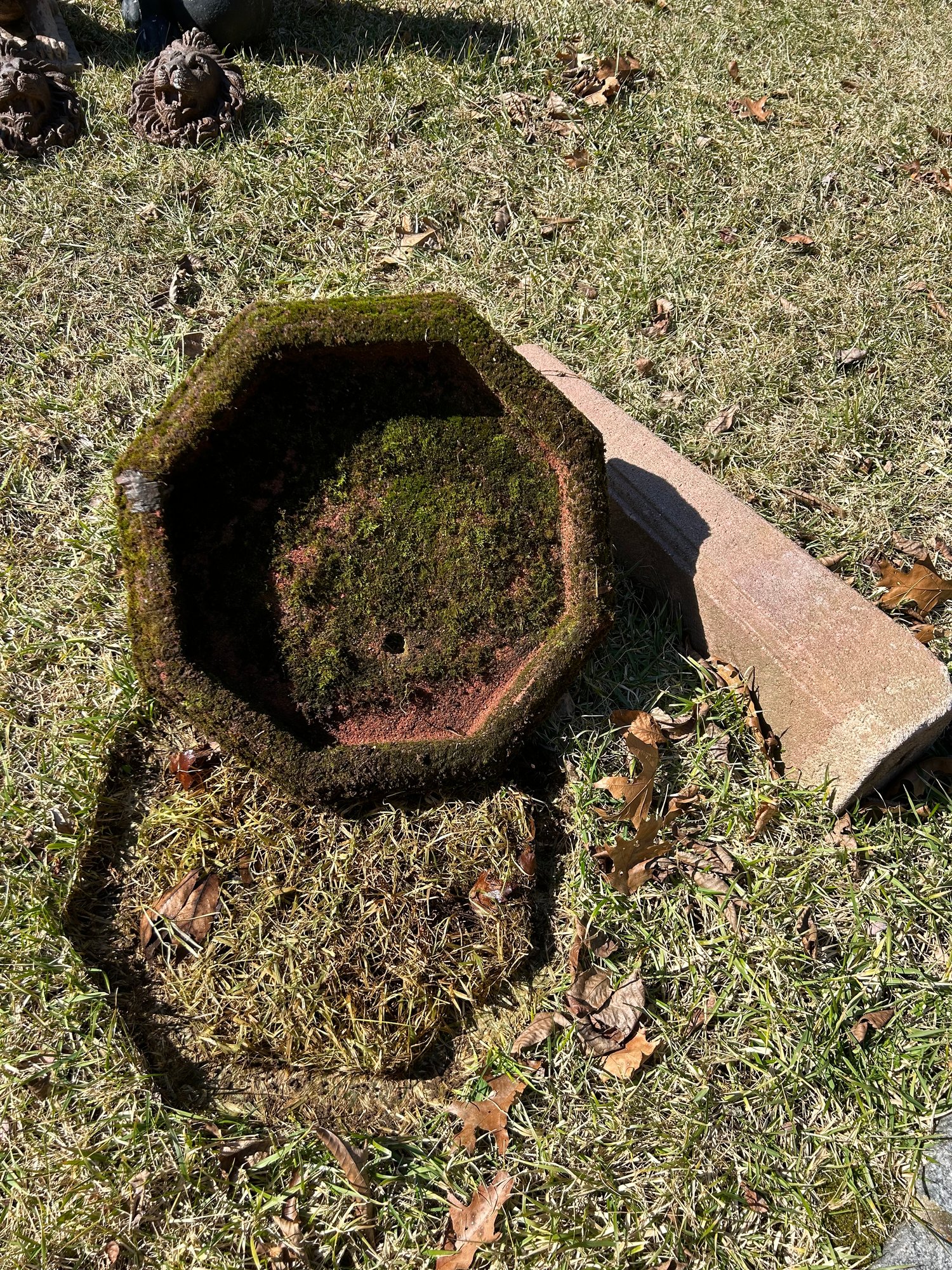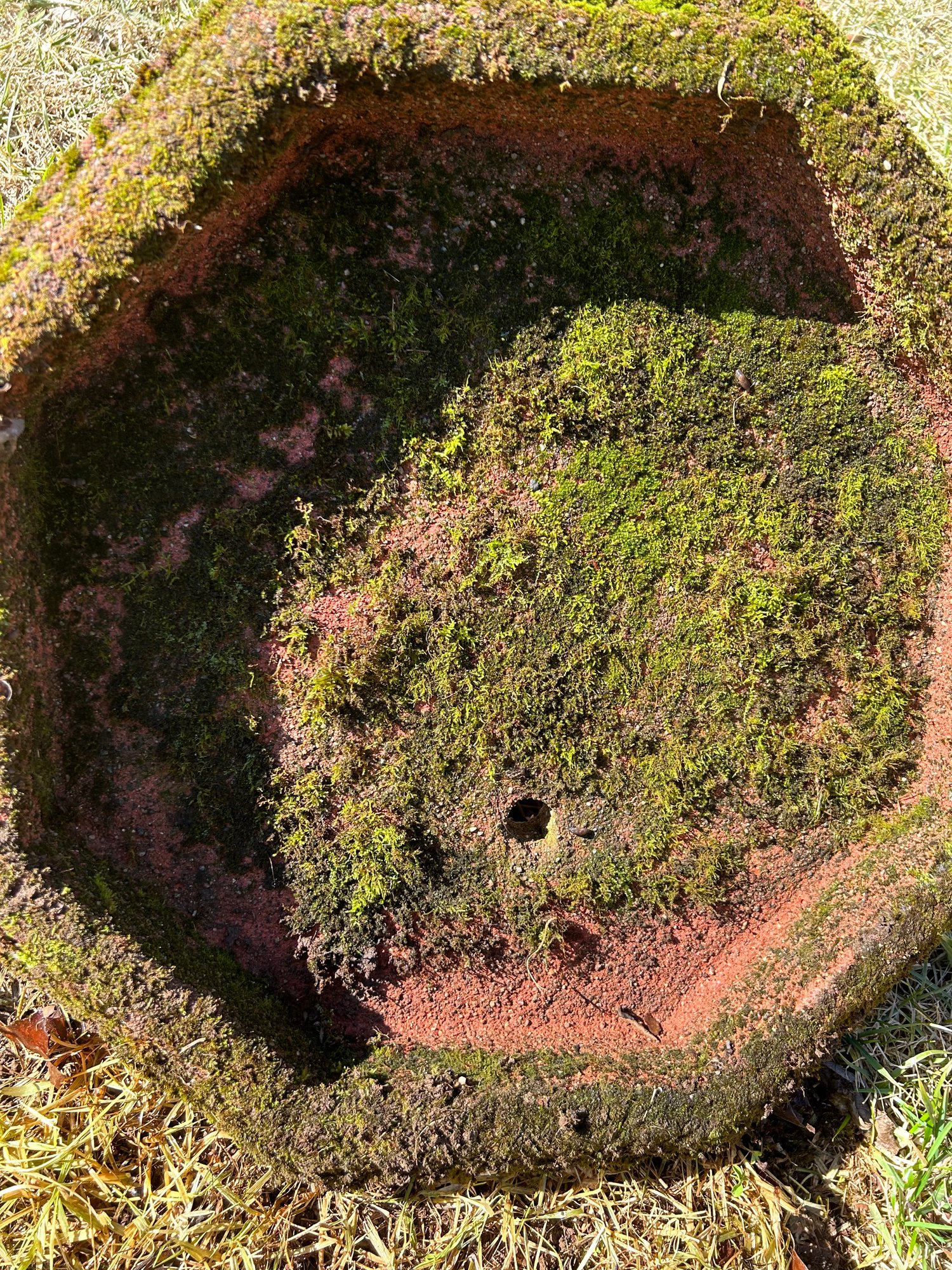 True matching birdbath cast stone red color. From 1965, 35 inches tall.