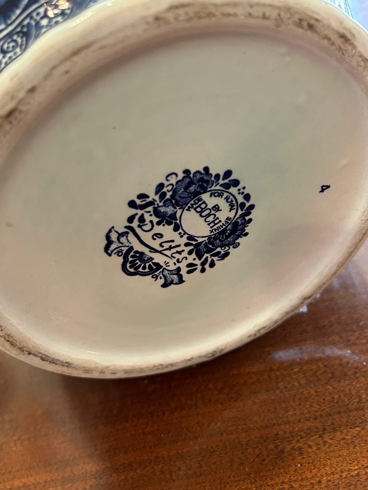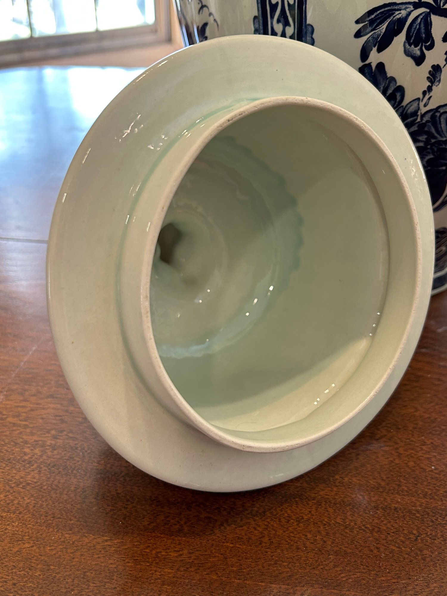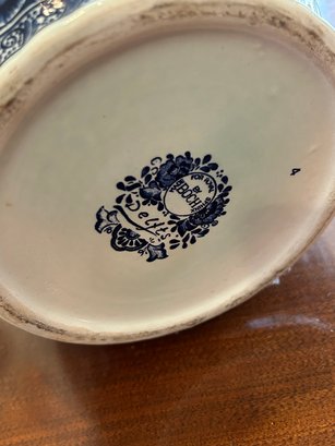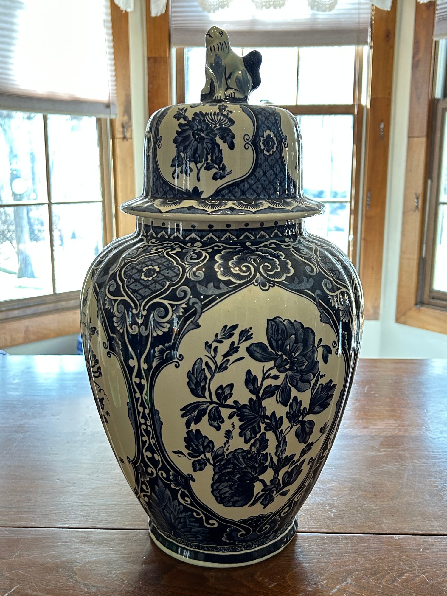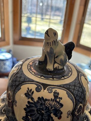 Blue and white Delft style urn with lid. Animal figure on top, floral decoration throughout marked on bottom Boch 18 inches tall
