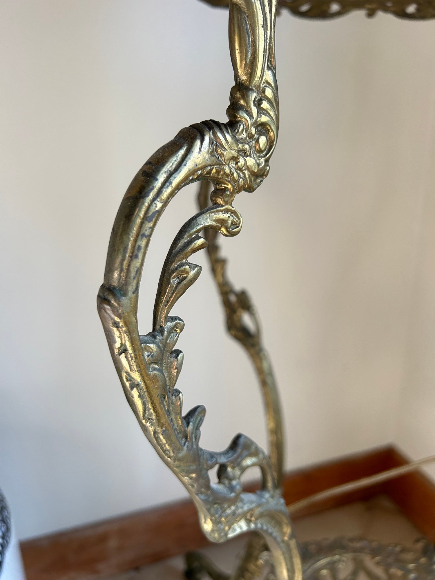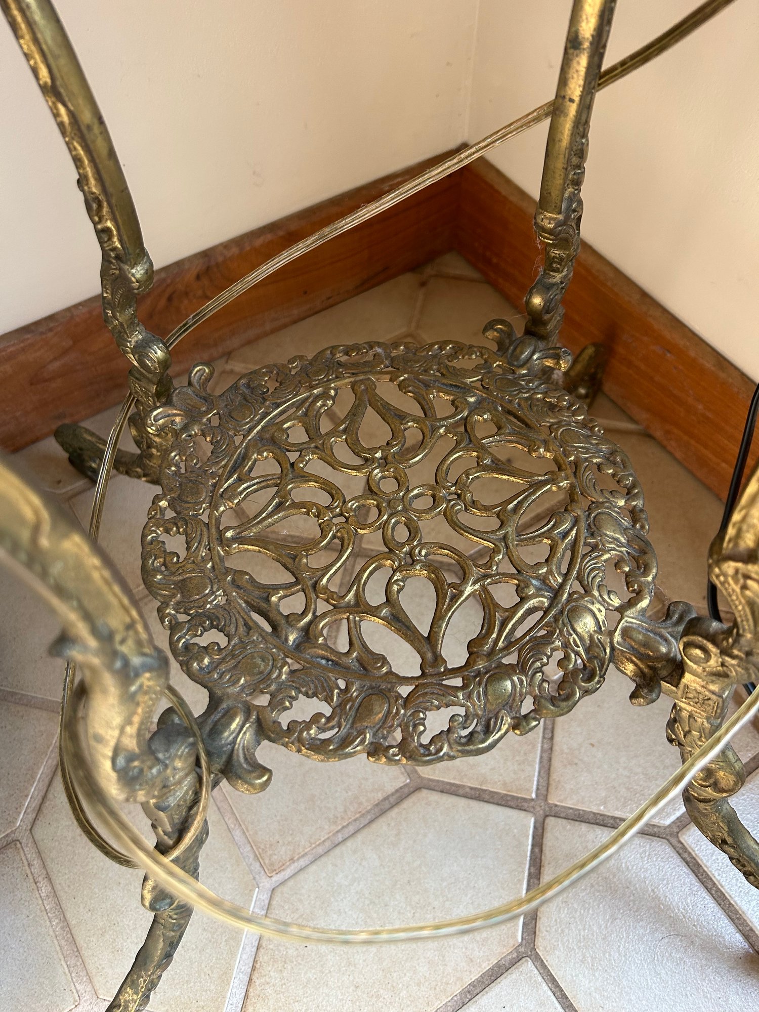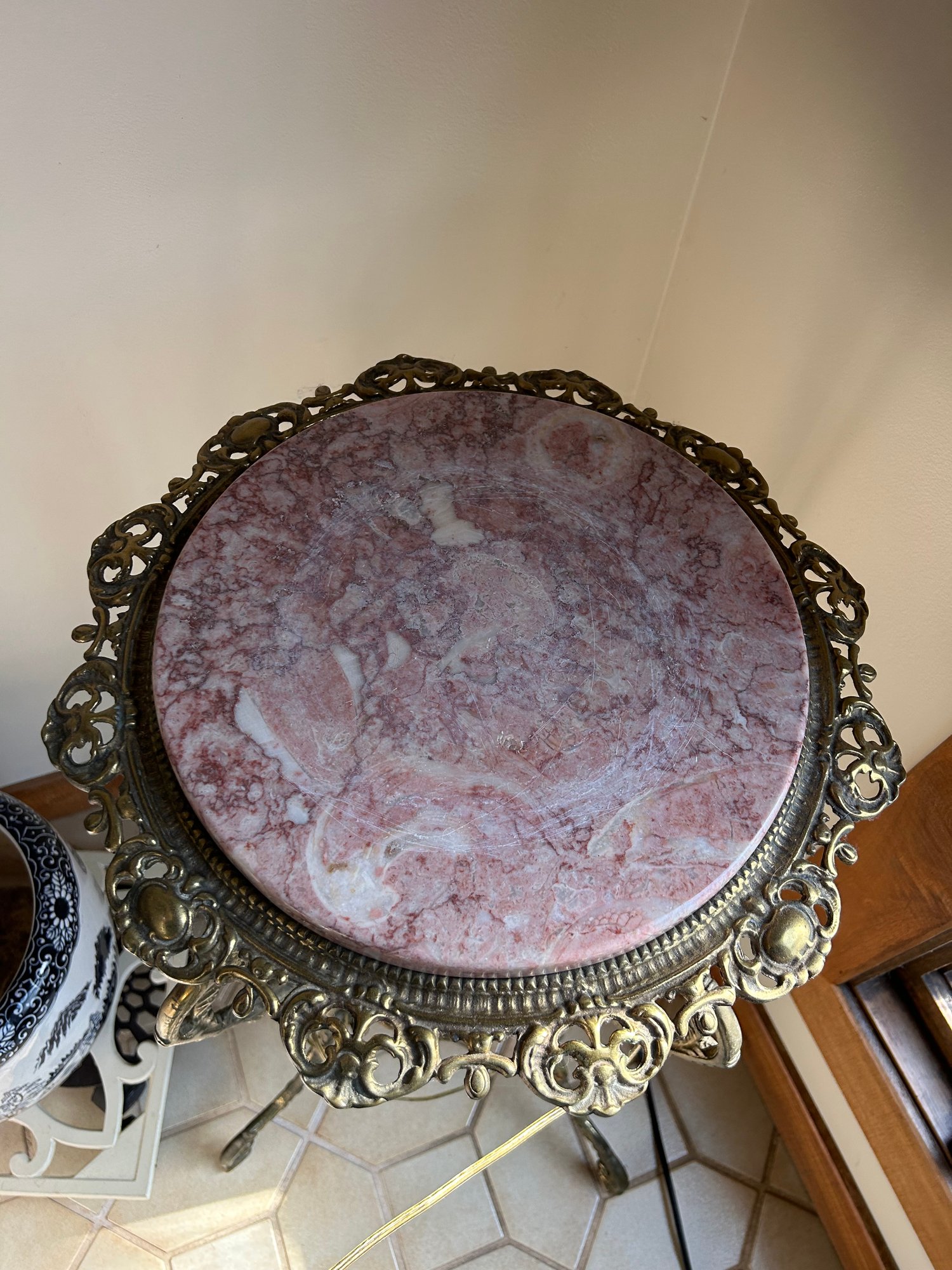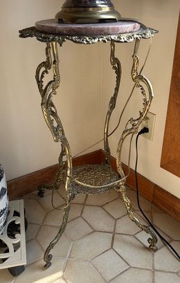 Brass and marble occasional table. Four legs with lower shelf, marble insert. 17 inches in diameter 29 inches tall.