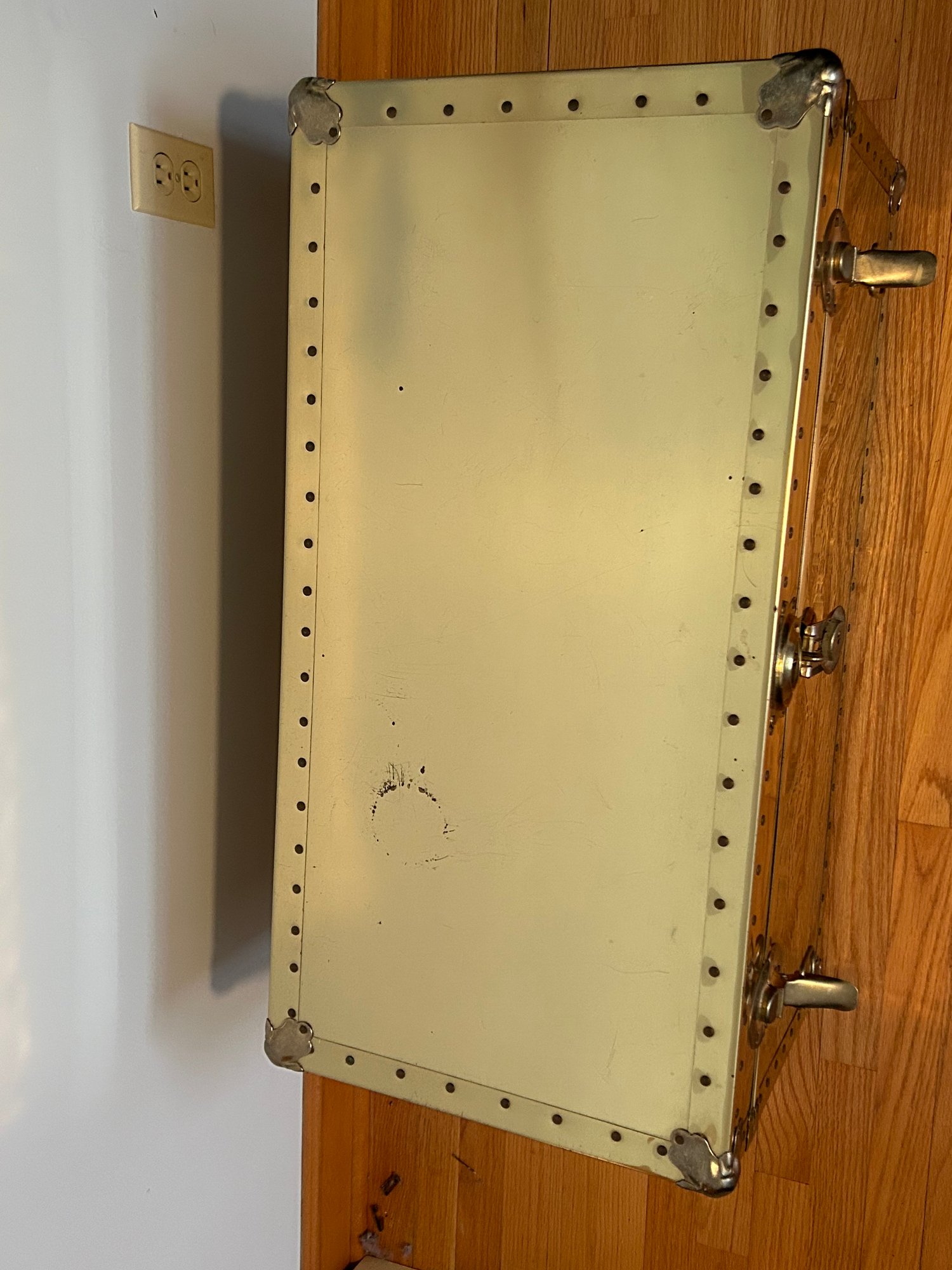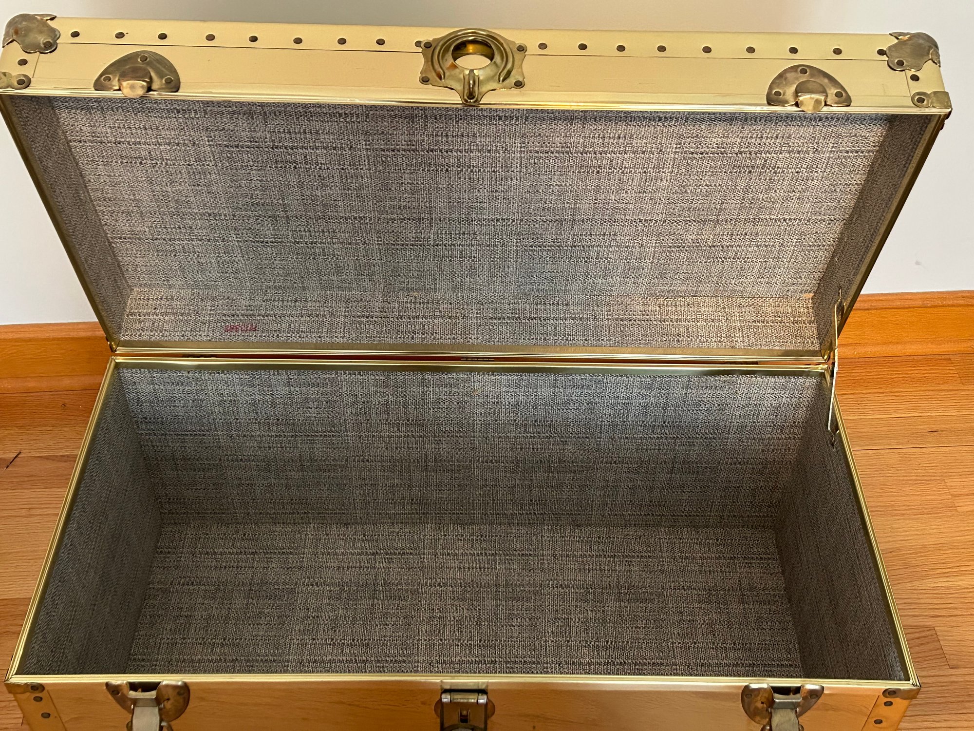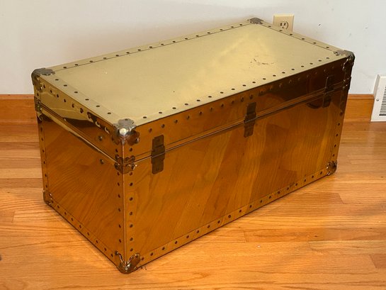 Brass storage trunk, brass on four sides and top with brass hasps. 32 inches wide 16 1/2 deep 16 tall.
