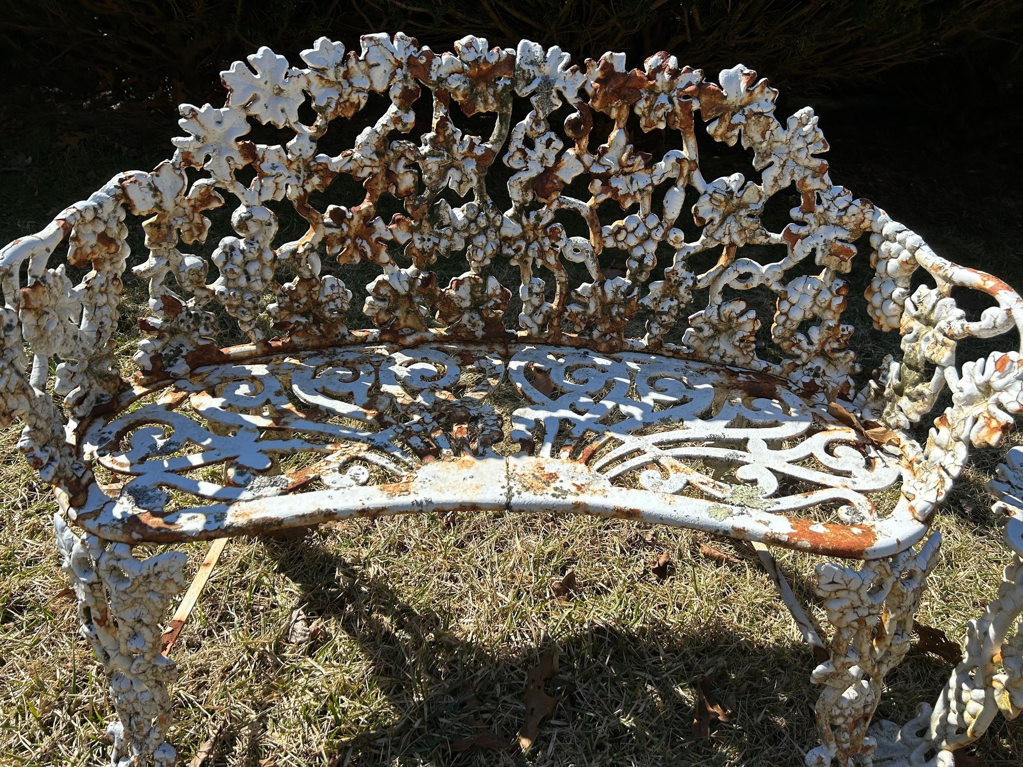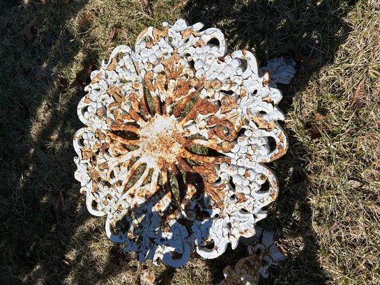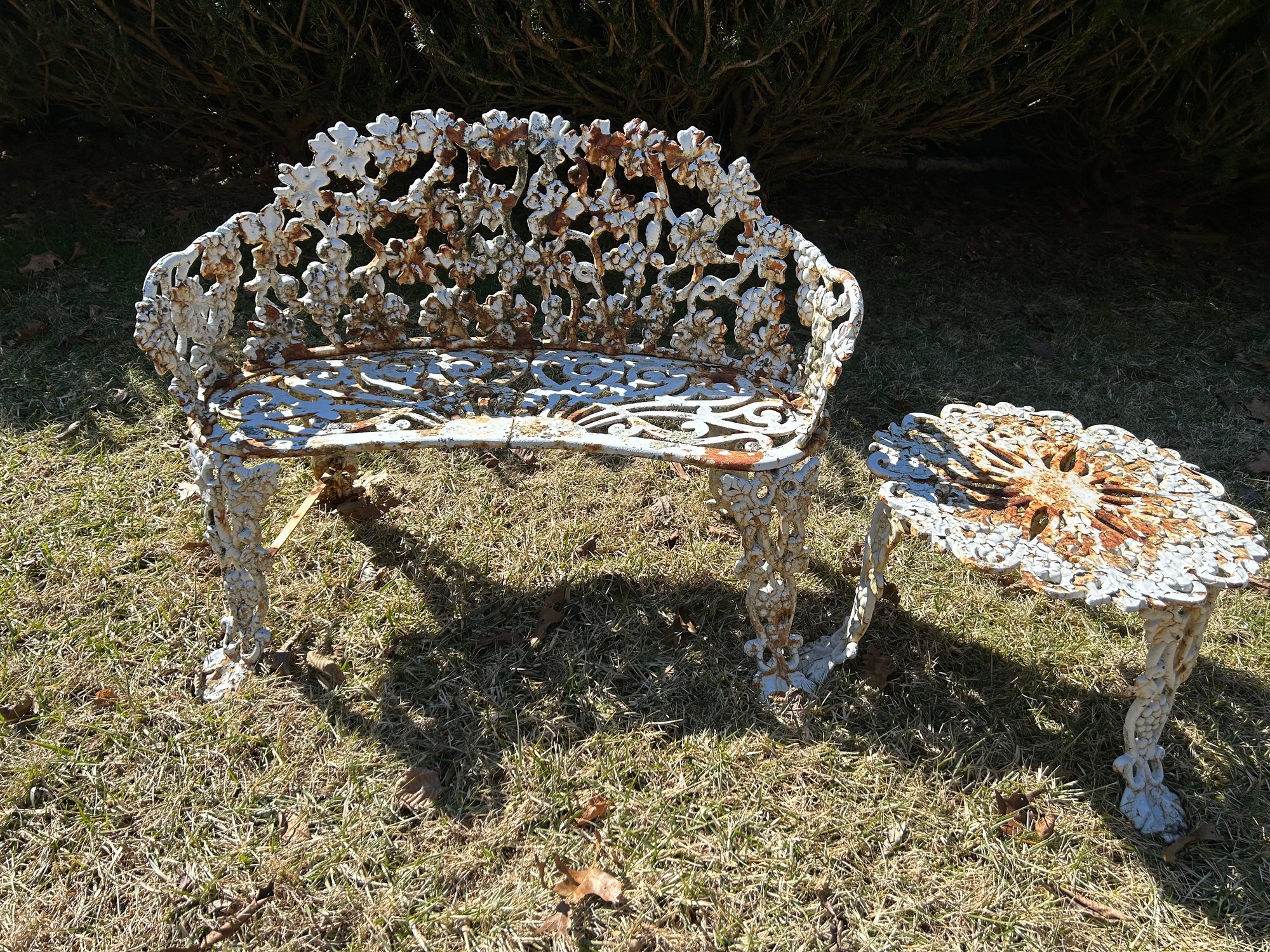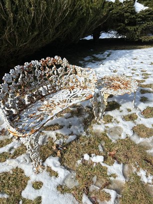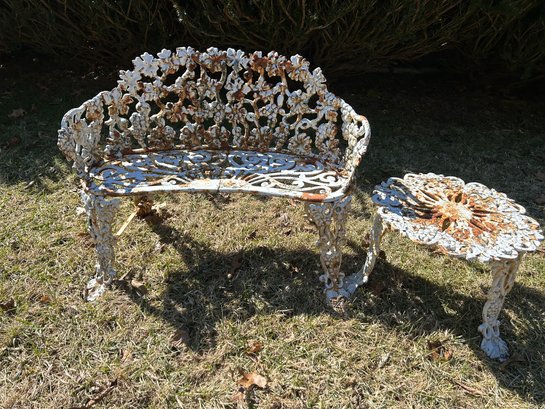 Cast-iron bench and table. Both with great pattern repaired foot to bench.