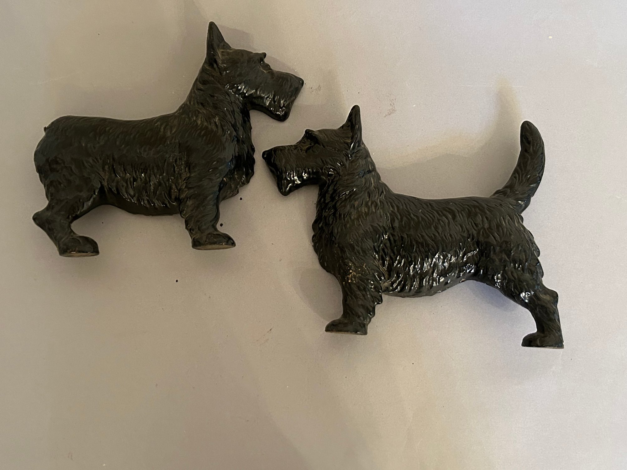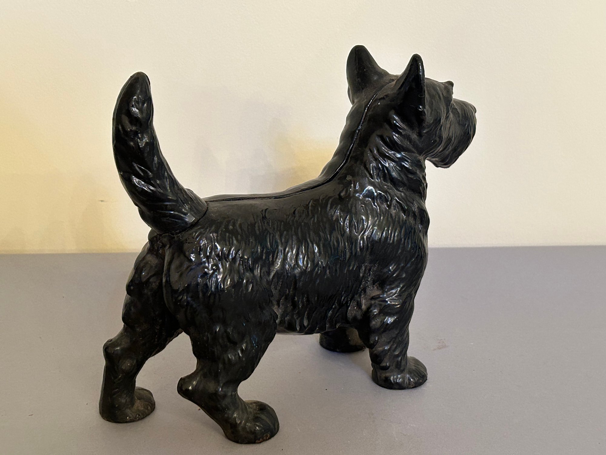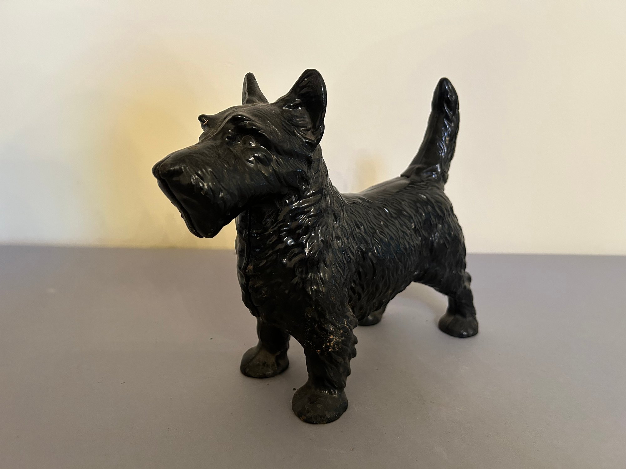 Cast iron Scotty dog doorstop with old black paint. Seam separated. 11“ x 4“ x 8 1/2“ tall.