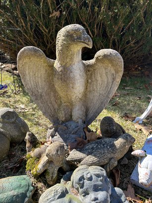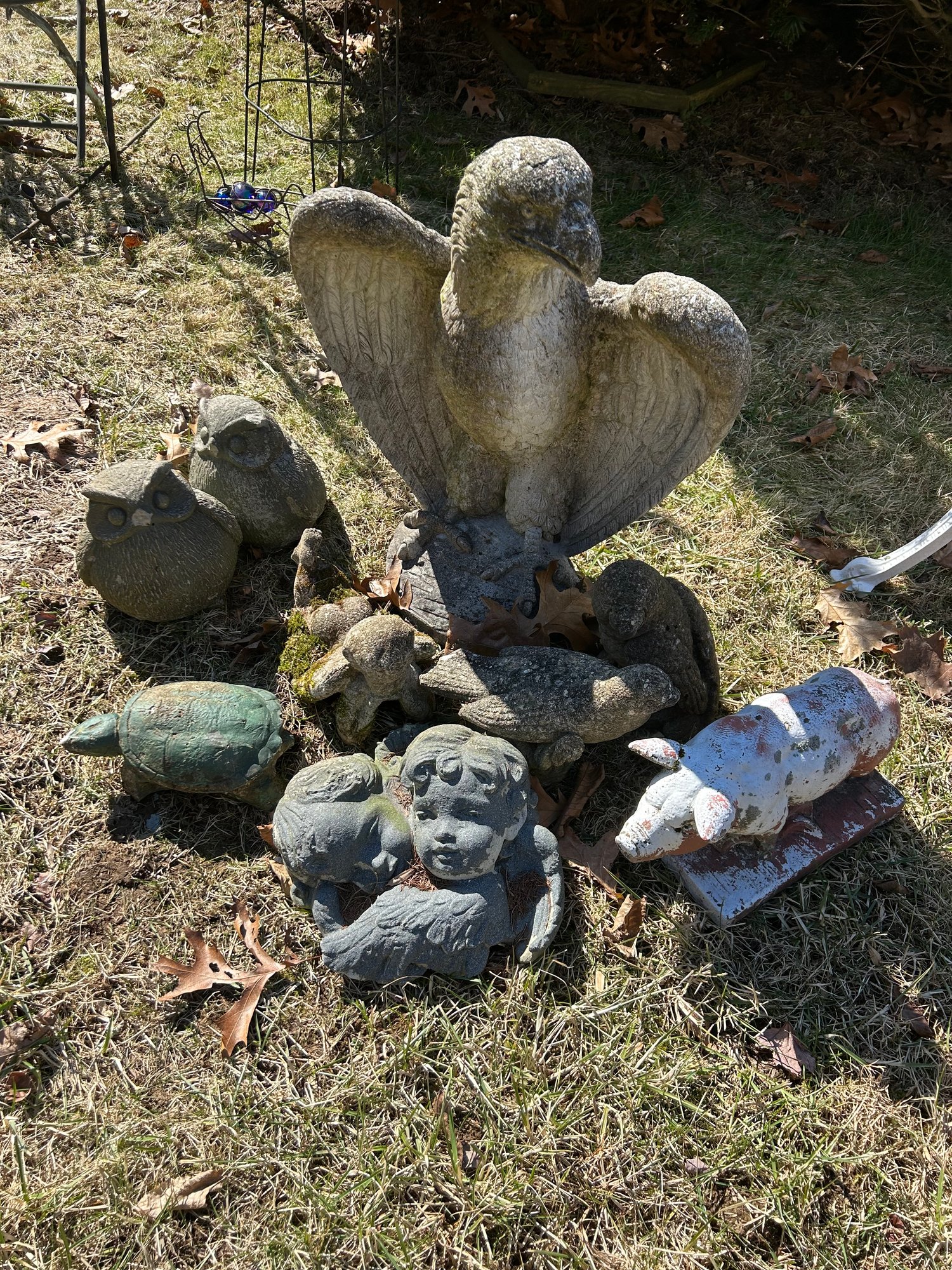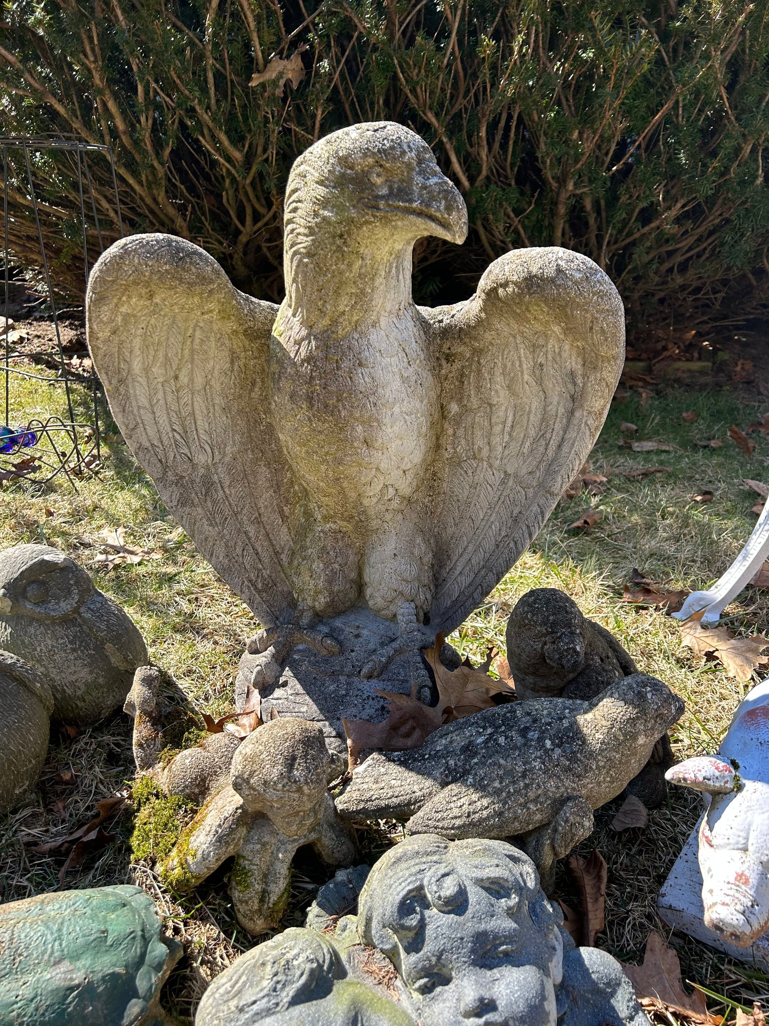 Cast stone yard ornaments and figures, including eagle, birds, owls, pig, turtle largest piece, 23 inches tall