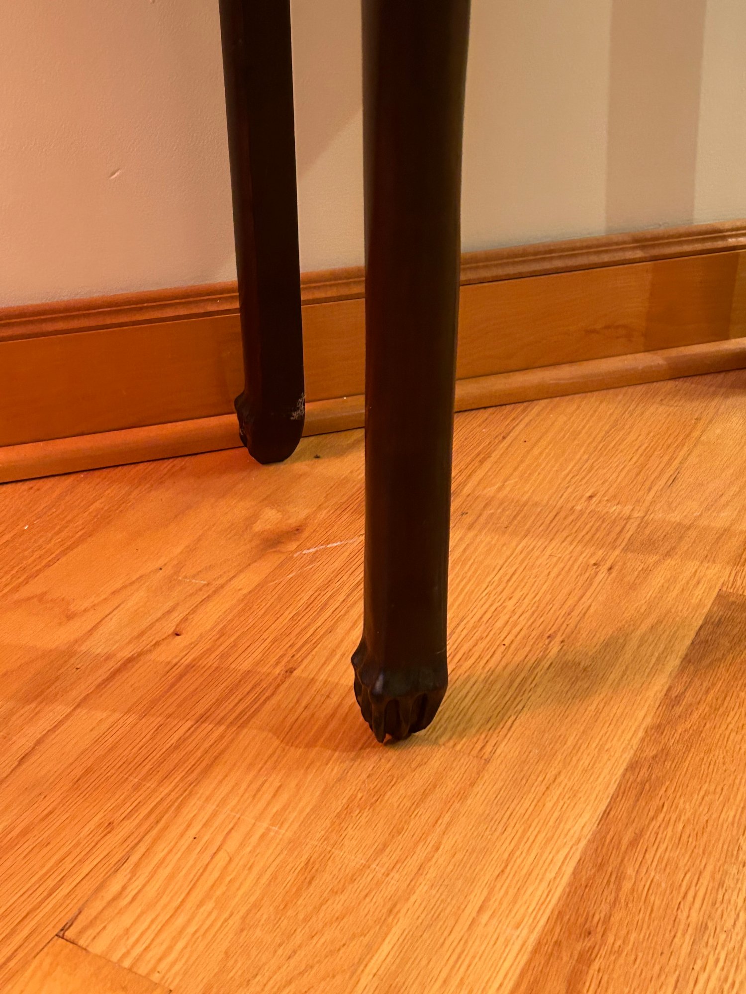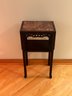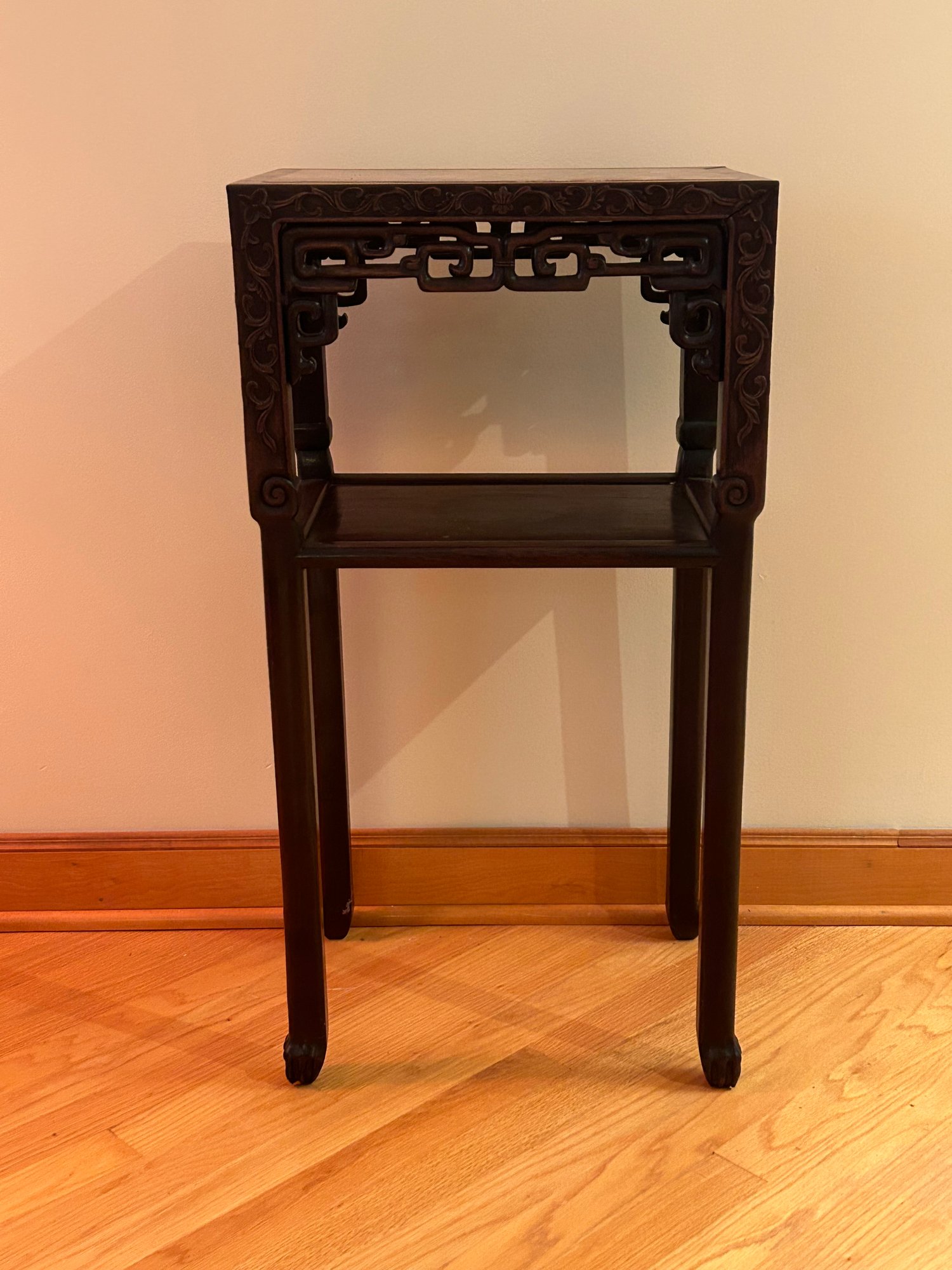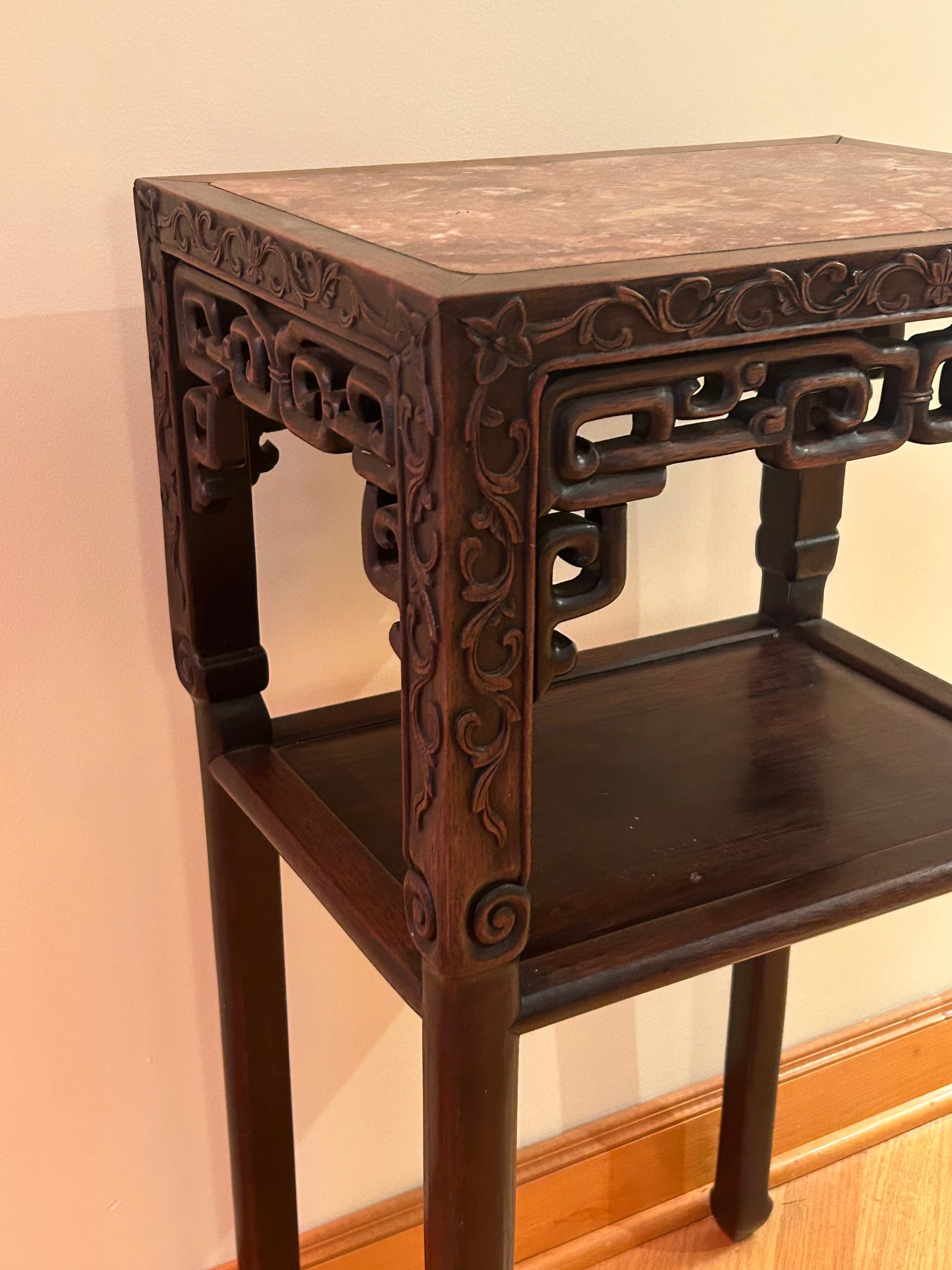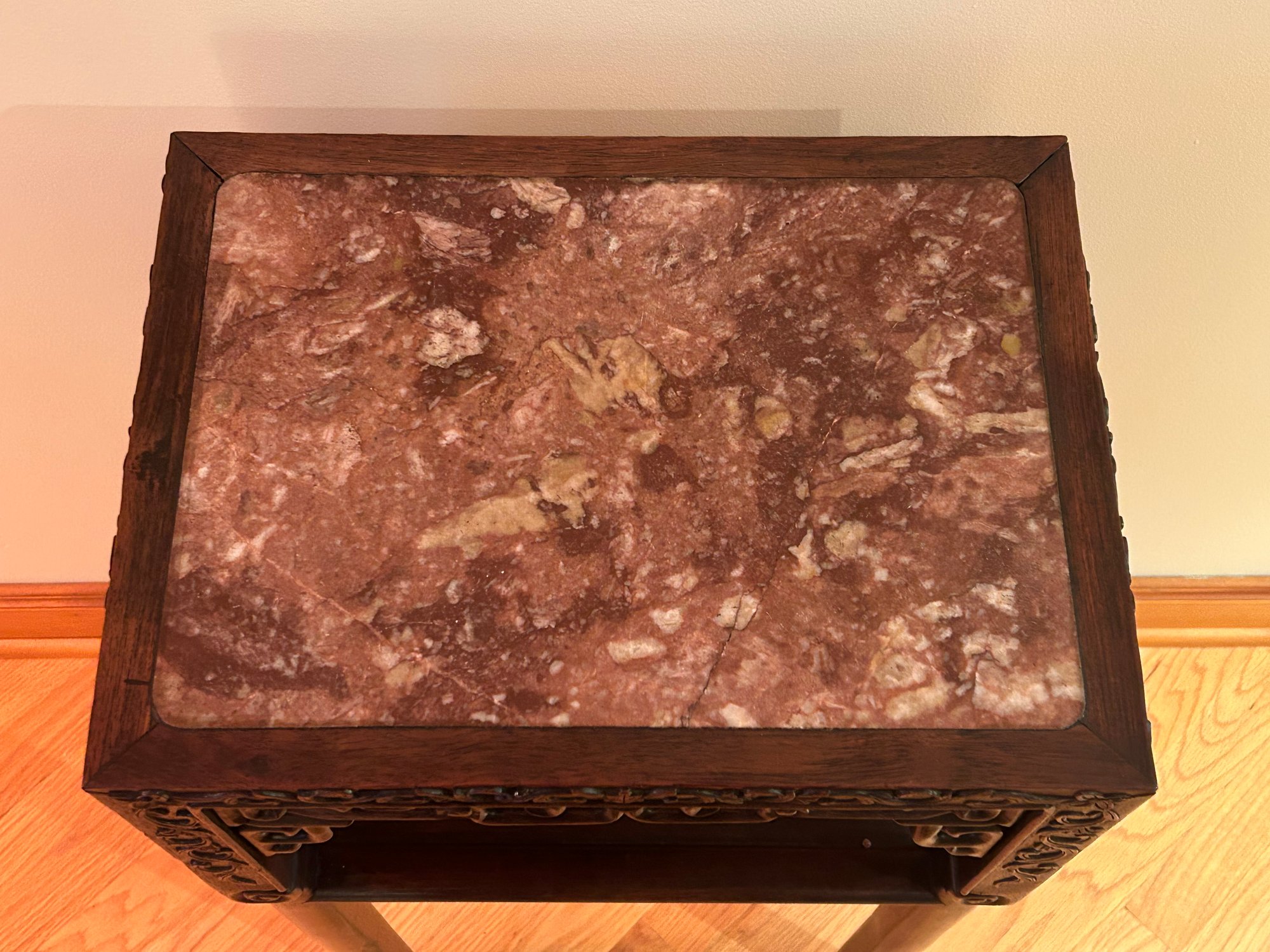 Chinese hardwood table with marble top carved design on four sides, shelf under. 32x17x12 inches