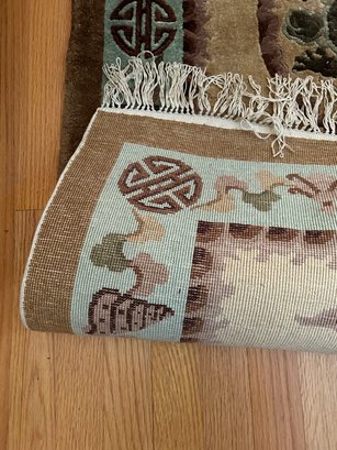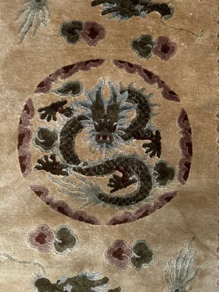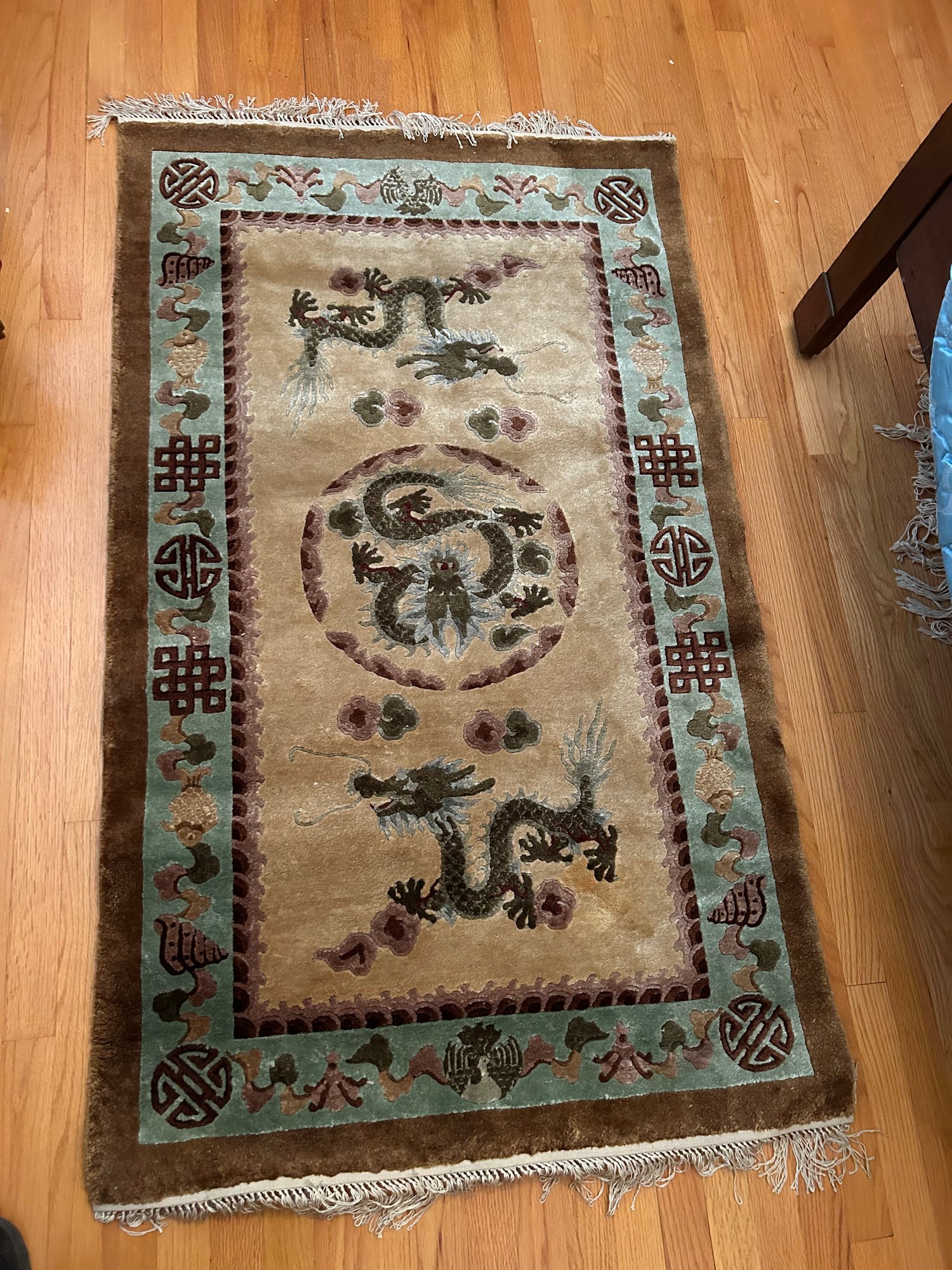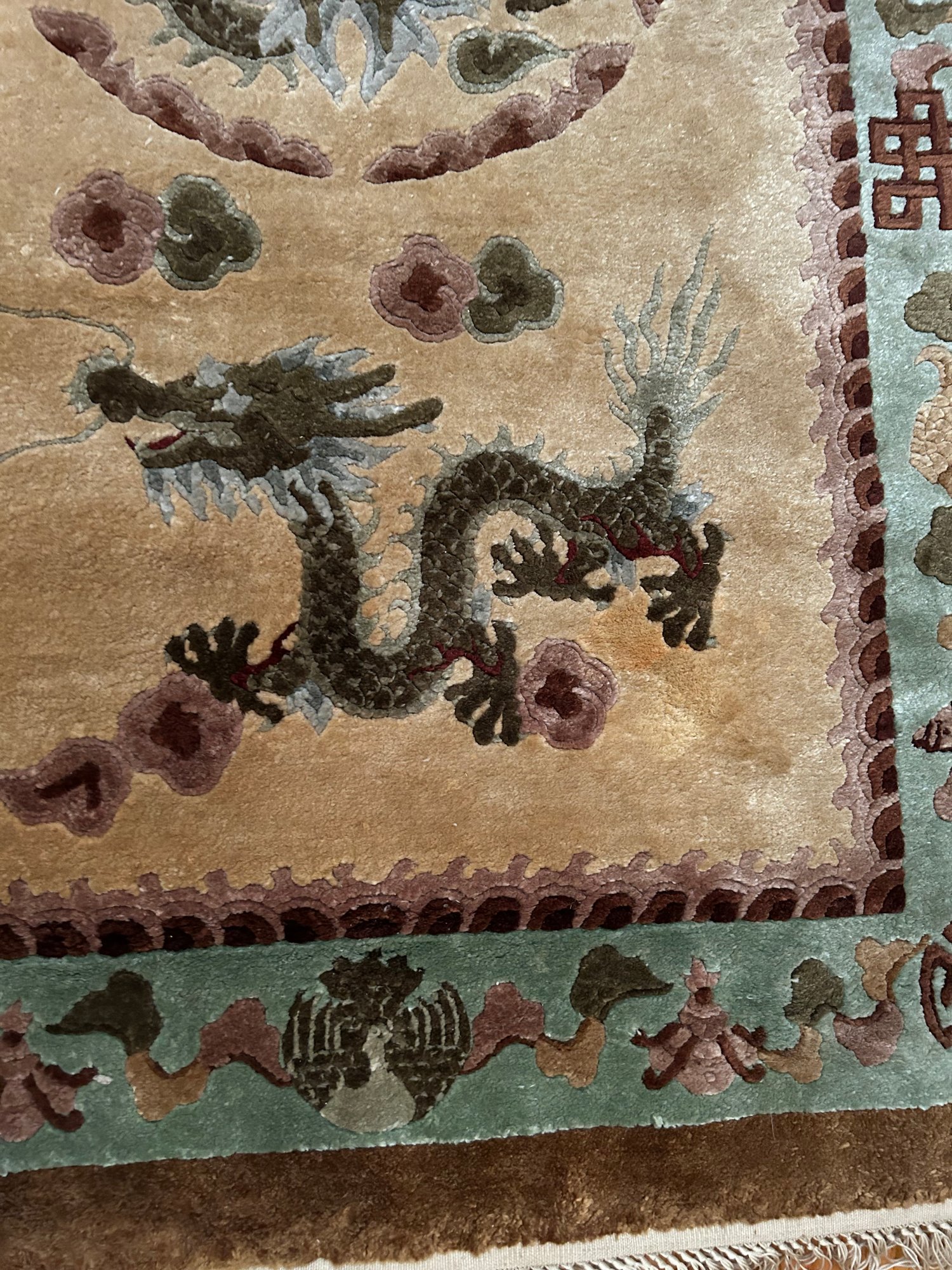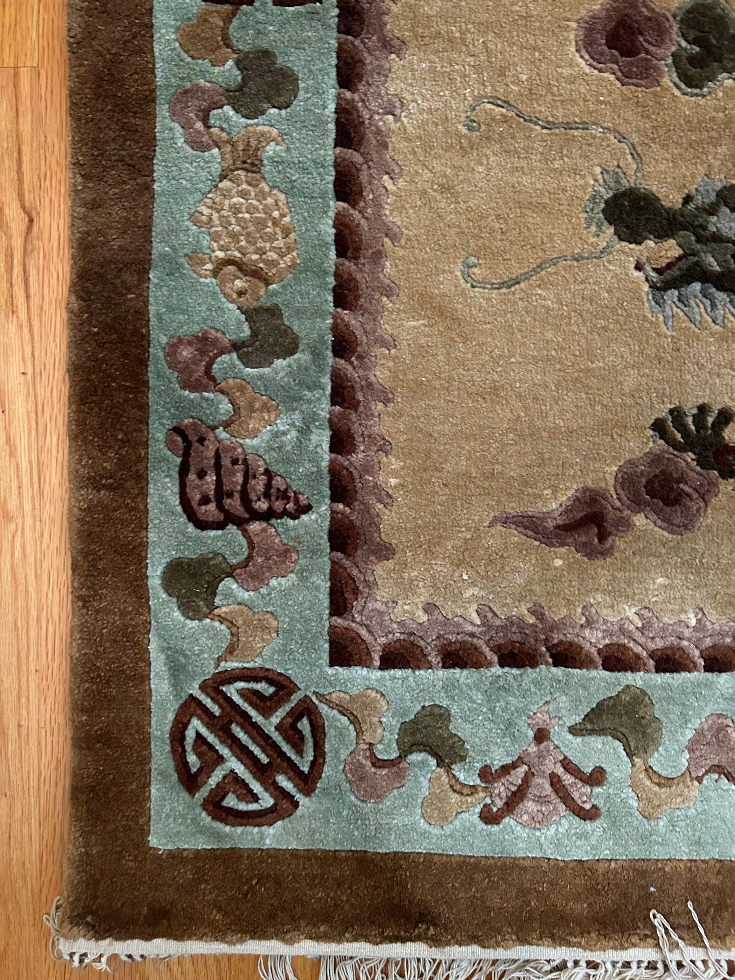 Chinese sculpted rug with dragon medallions, fish around border 36” x 60” very good condition