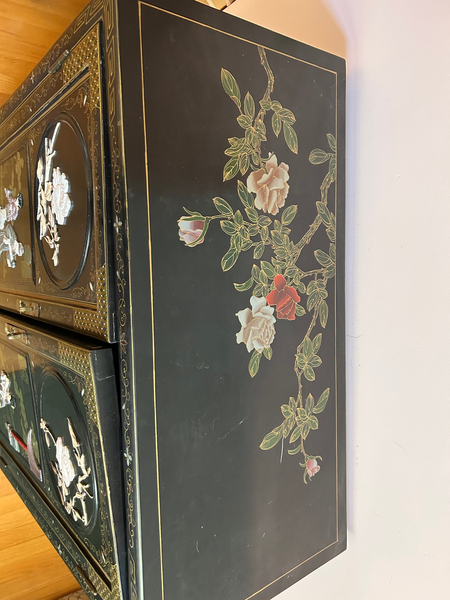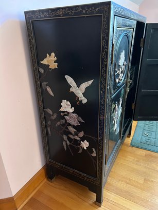 Small size paint decorated Chinese style armoire with applied stone design to front and sides. Fitted interior with two drawers. 33“ x 16“ x 42“ tall.