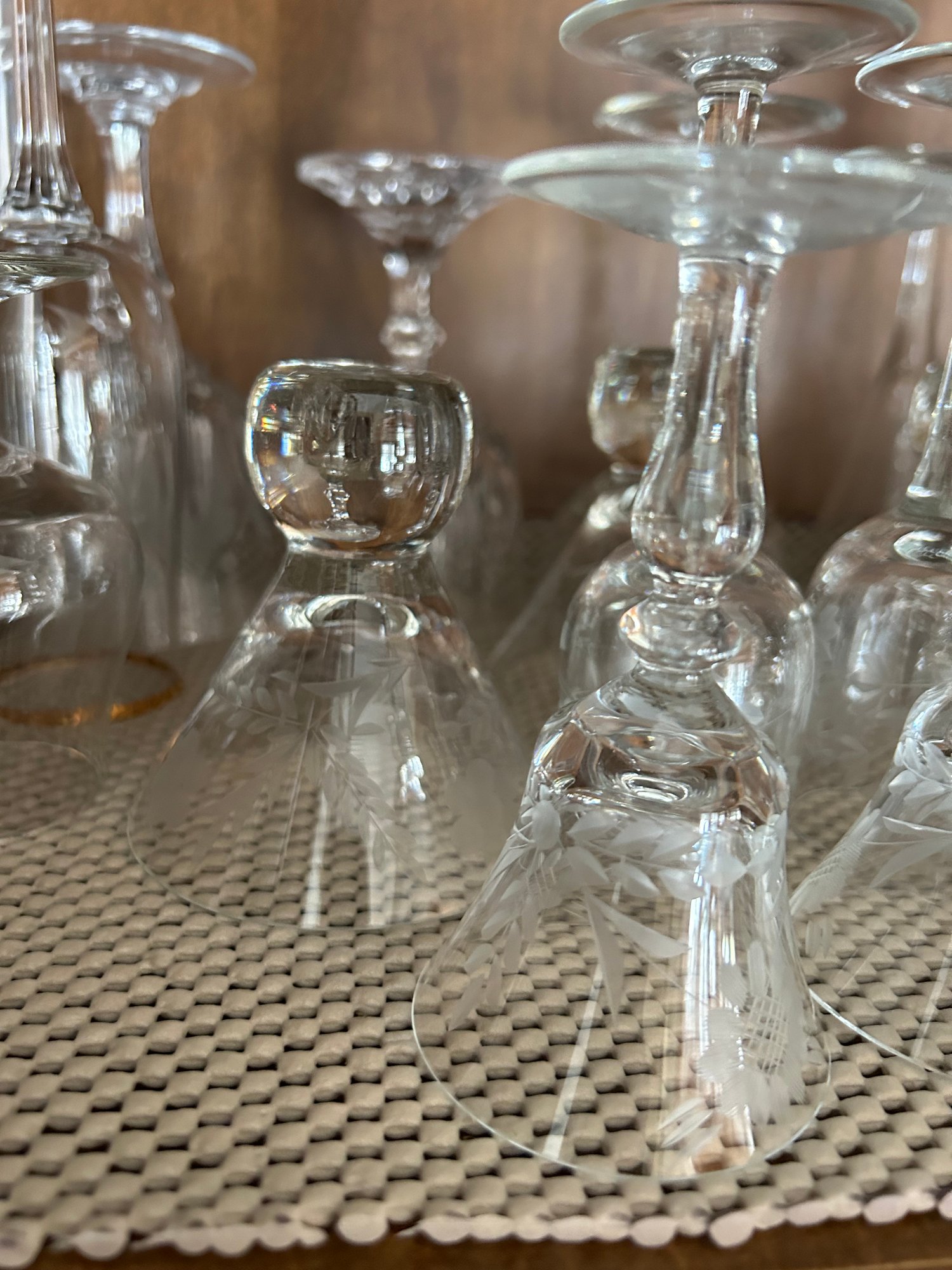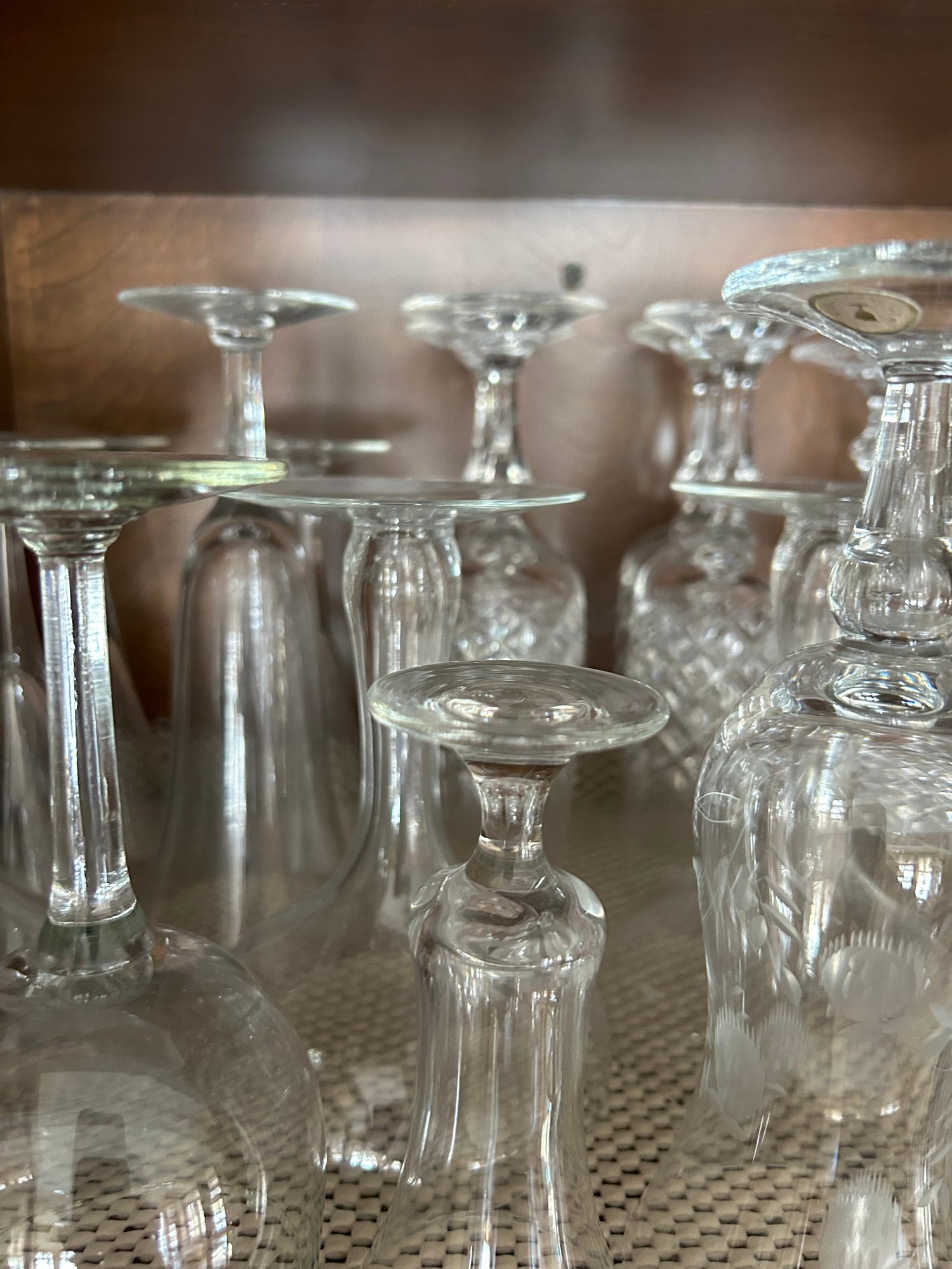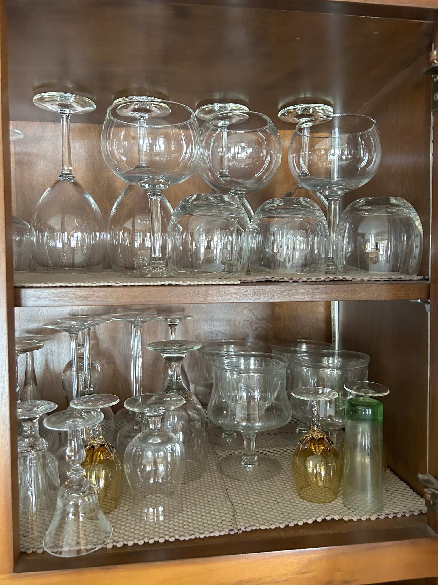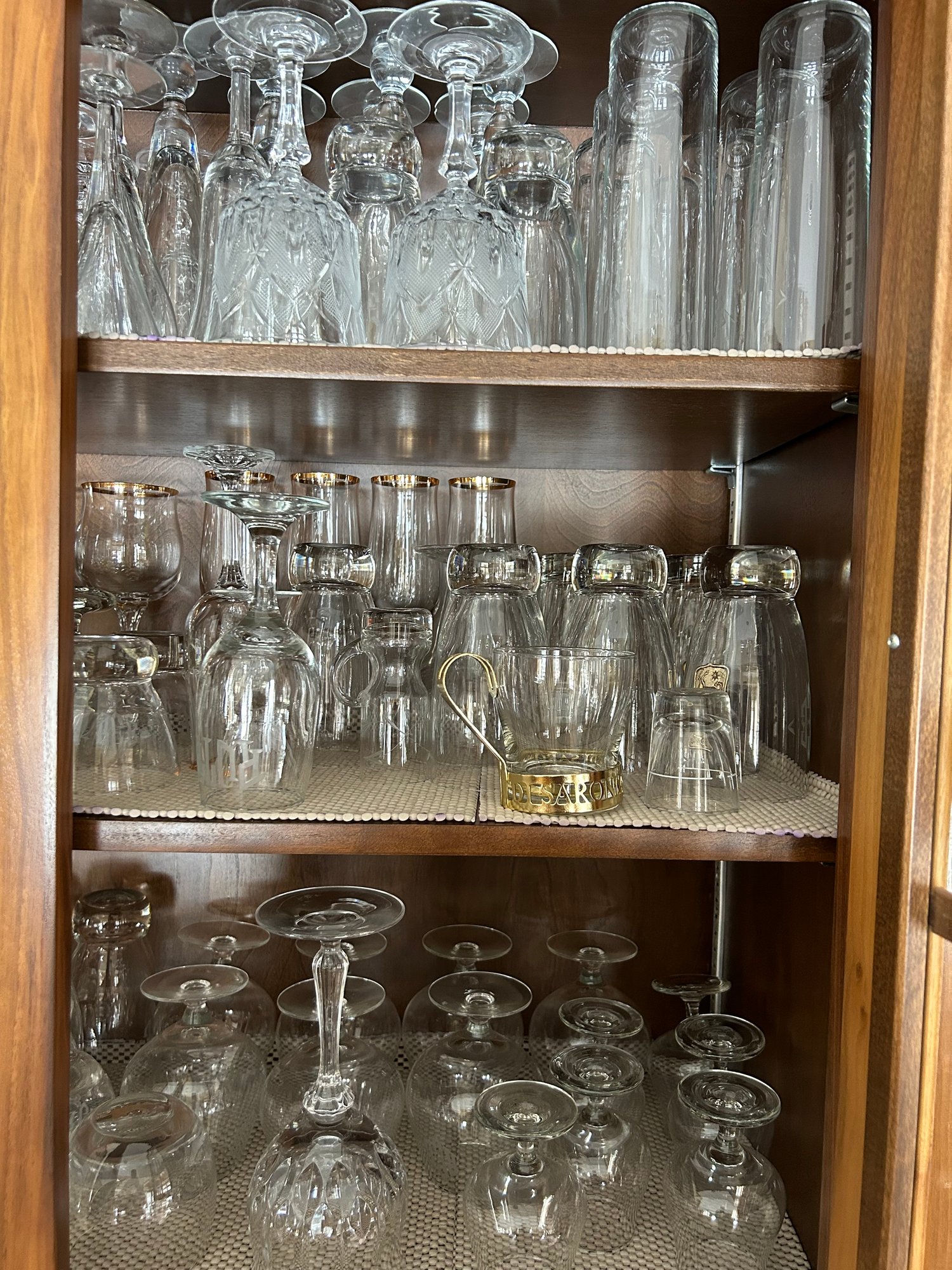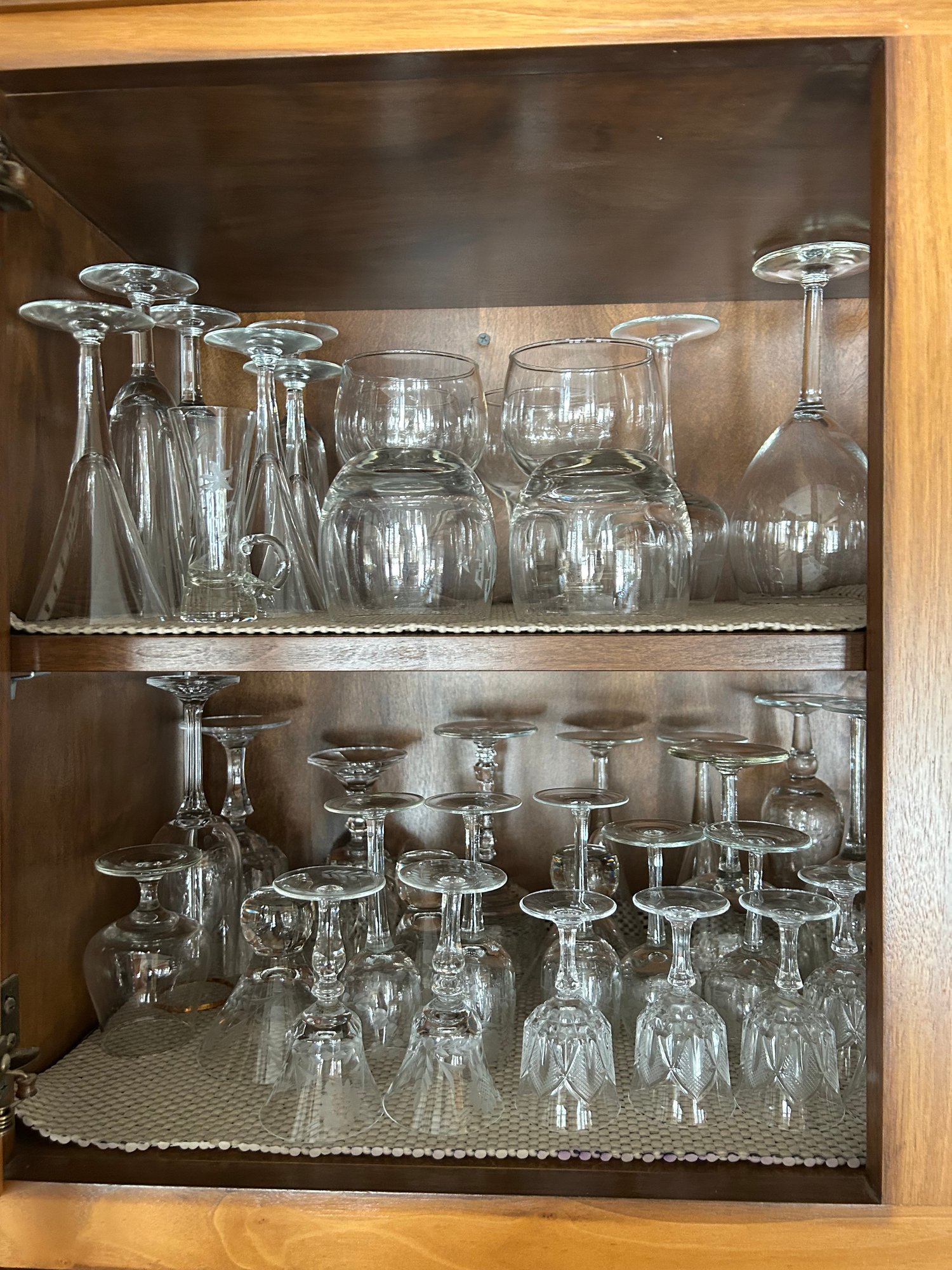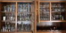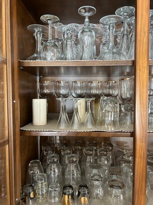 Contents of bar cabinet. Glasses, stem glasses, mid century glasses.100+ pieces