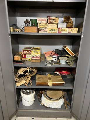 Contents of cabinet includes tools,Allen wrenches, chucks, sharpening stones, files, emery wheels, etc…
