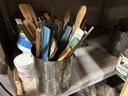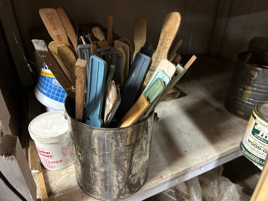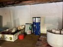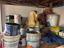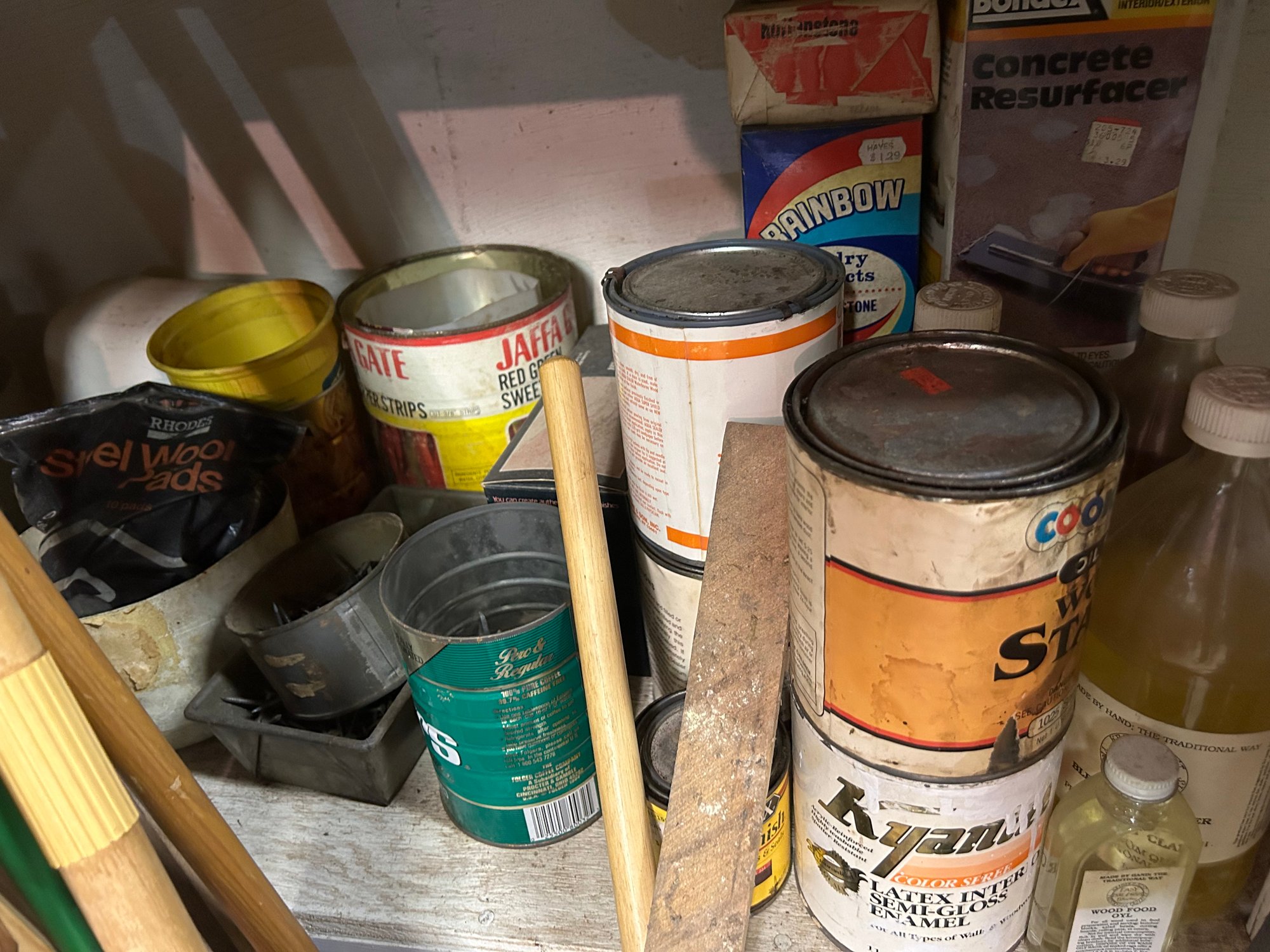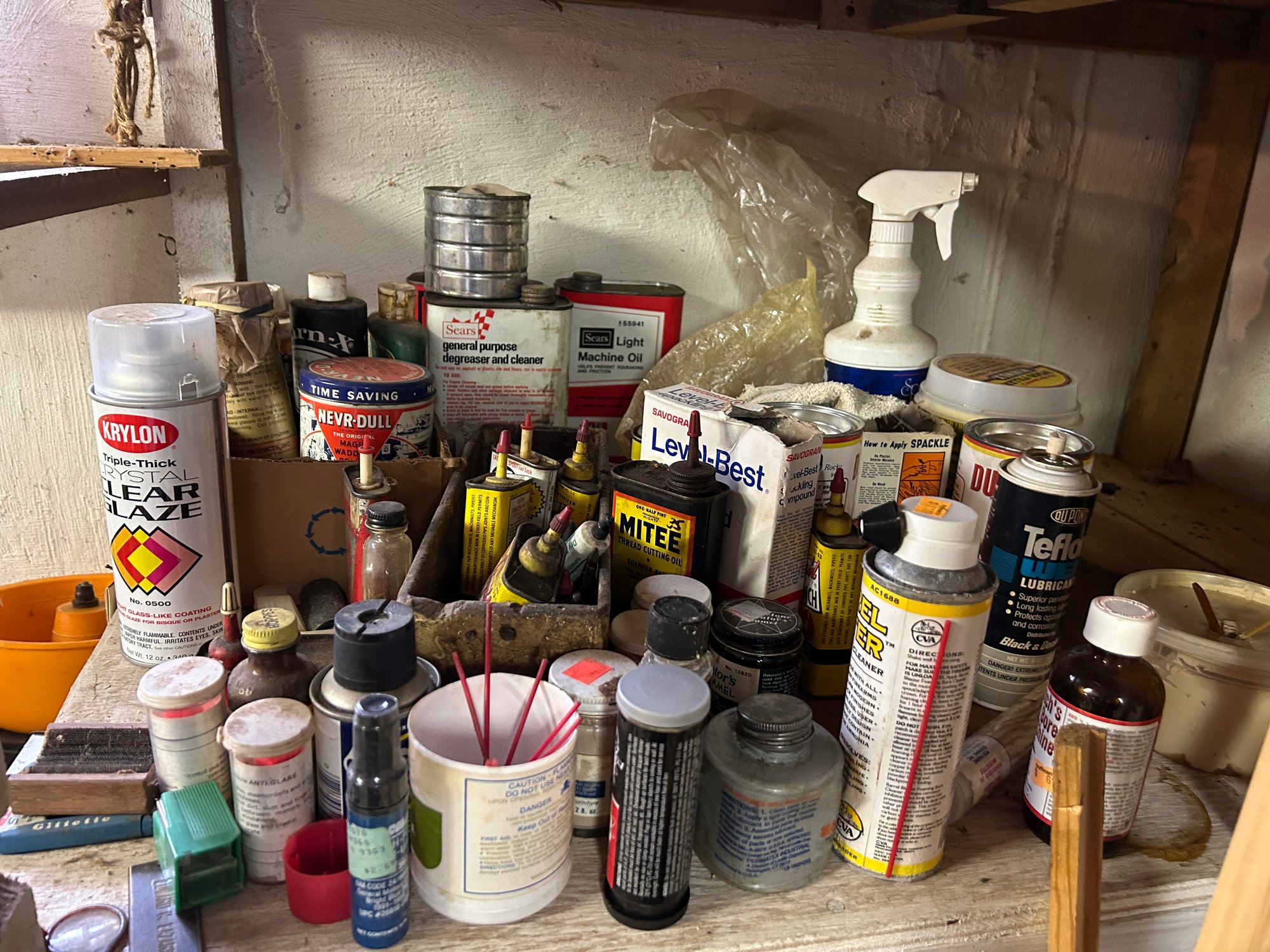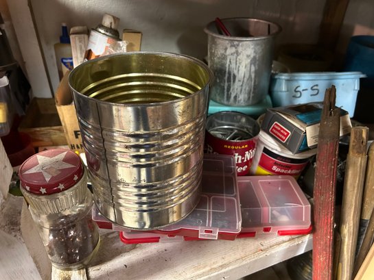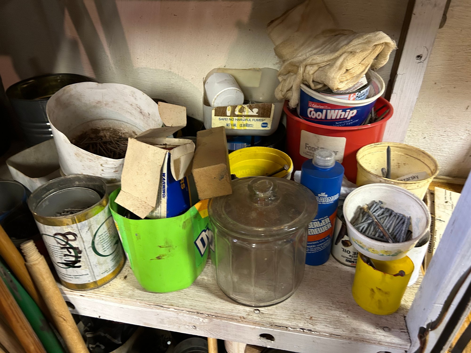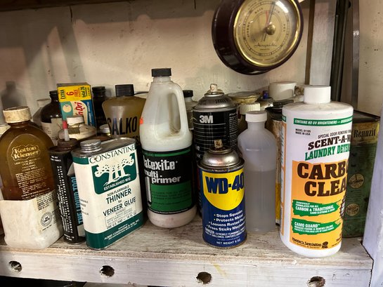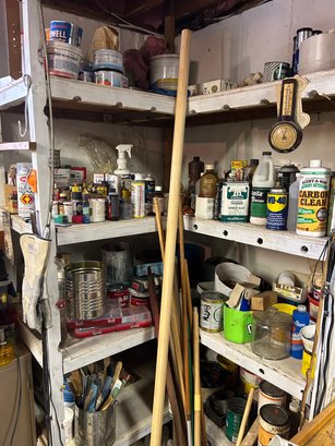 Contents of four shelves. All items pictured includes oil, nails, screws, grease, wood finish items, polishing, compounds, etc..