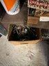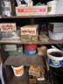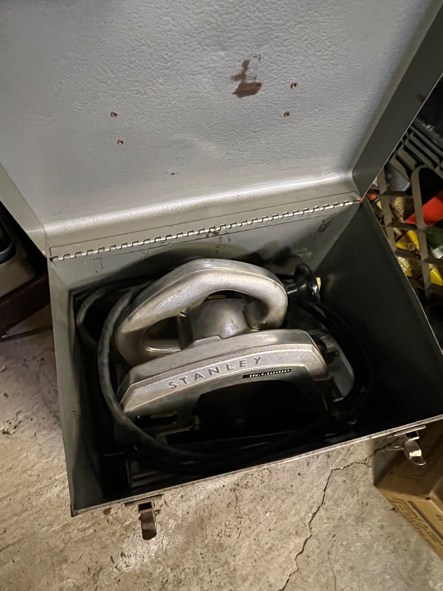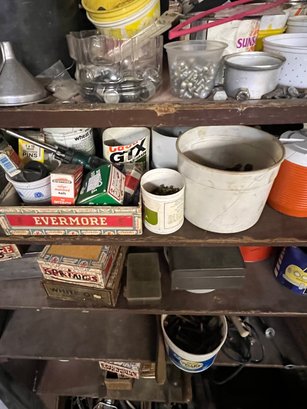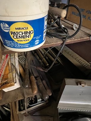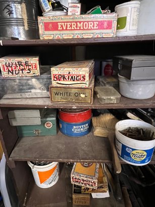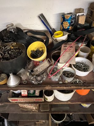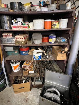 Contents of shelf, including tools, screws, nails, springs, circular saw, etc.