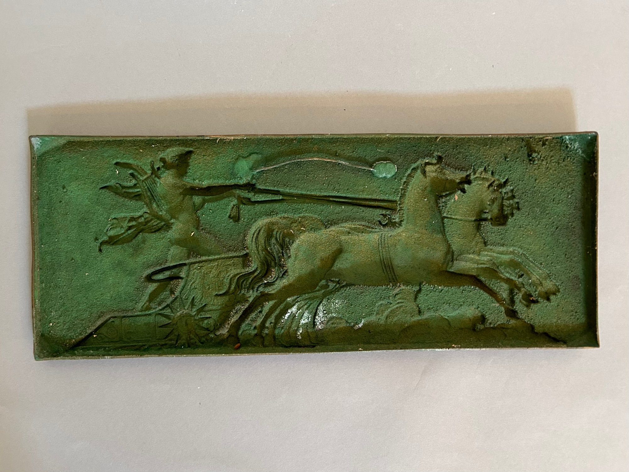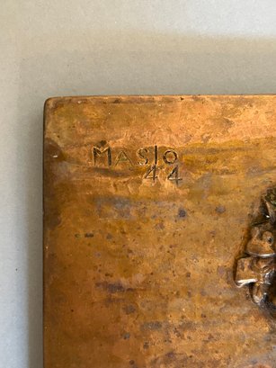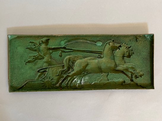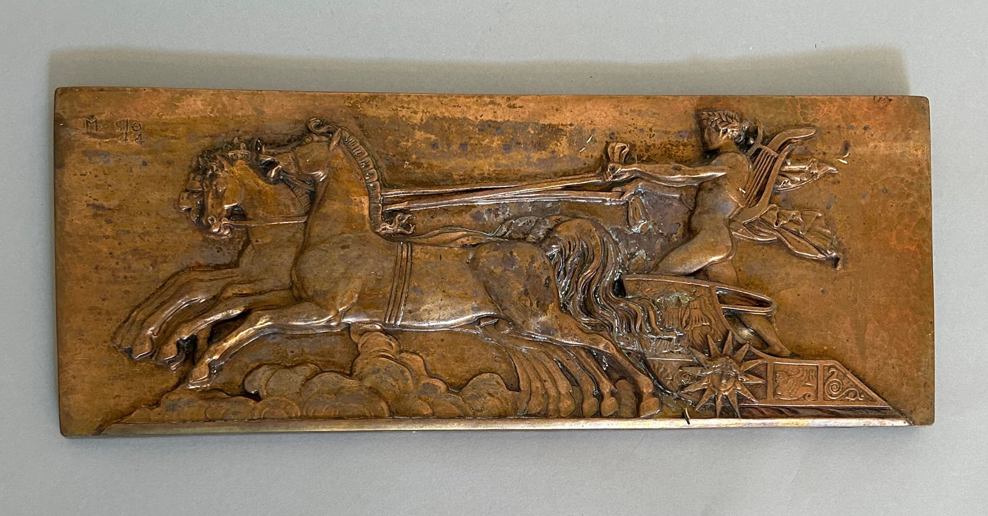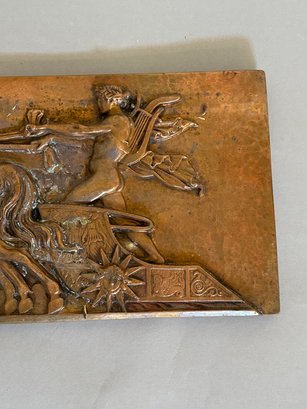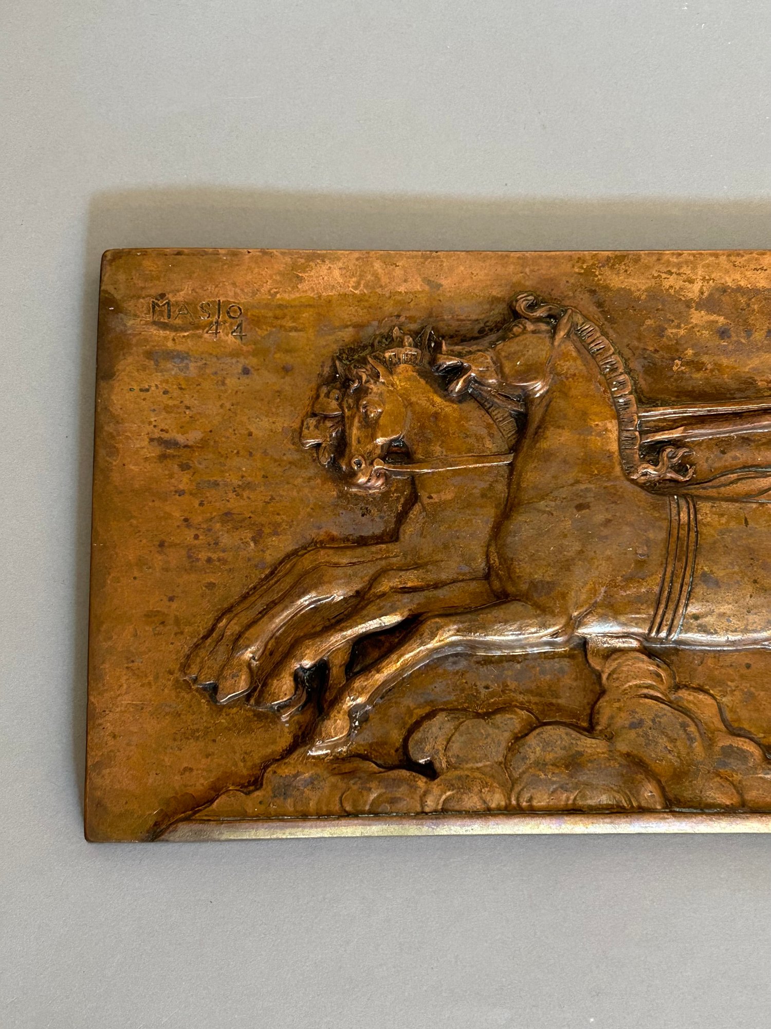 Copper Plaque of Apollo Riding his sun chariot signed MASIO 44. 20x8 inches